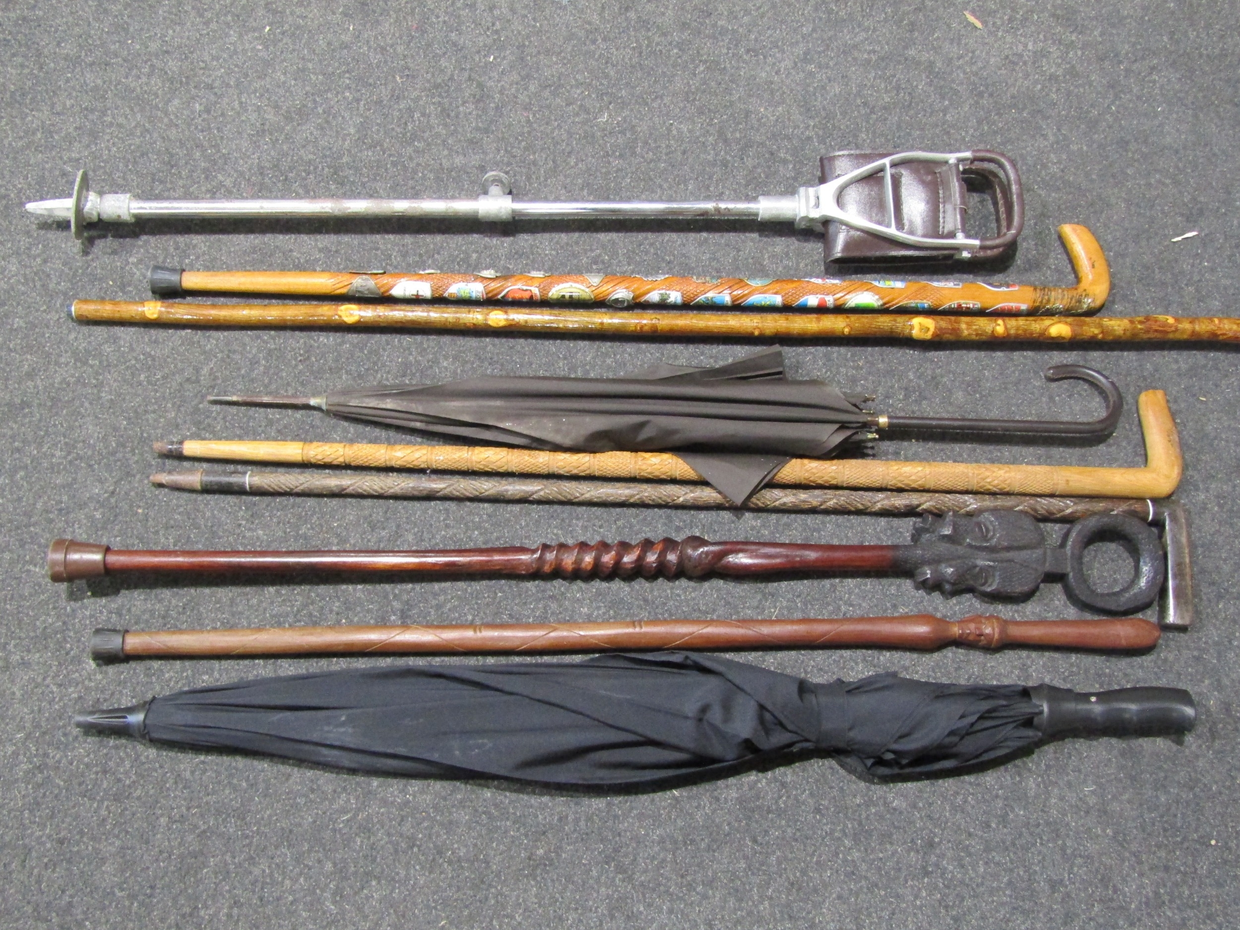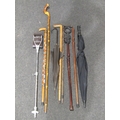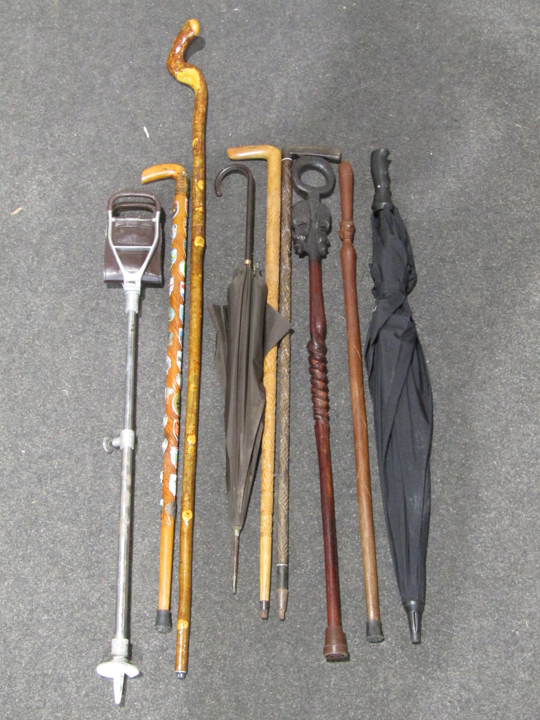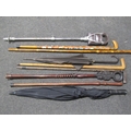 A selection of carved walking sticks including Eastern examples, shepherd's stick, a shooting stick and two umbrellas (9)