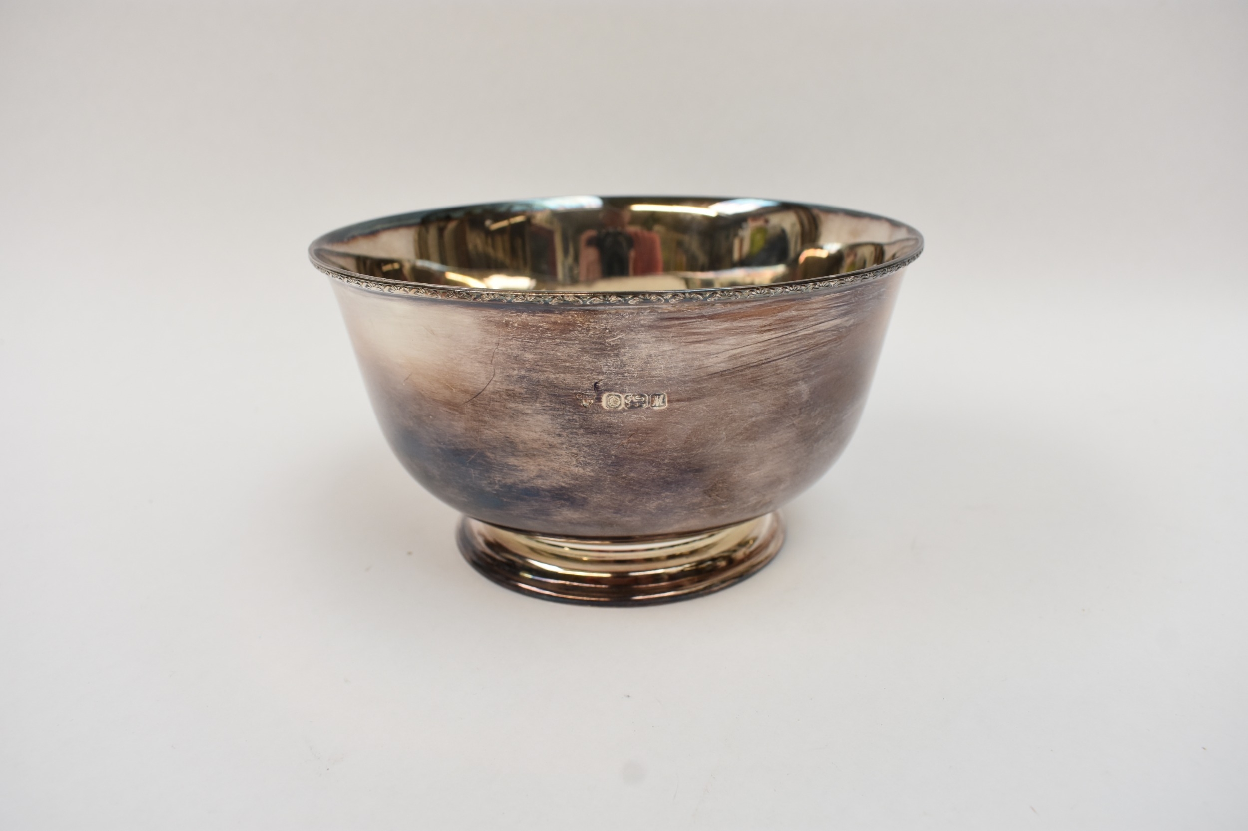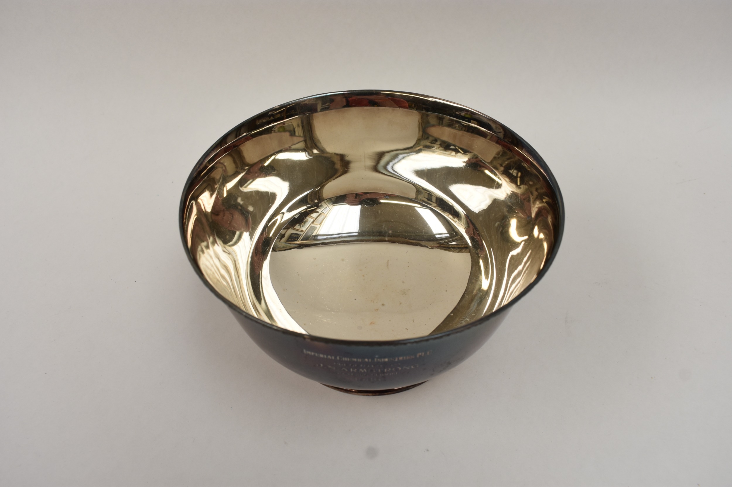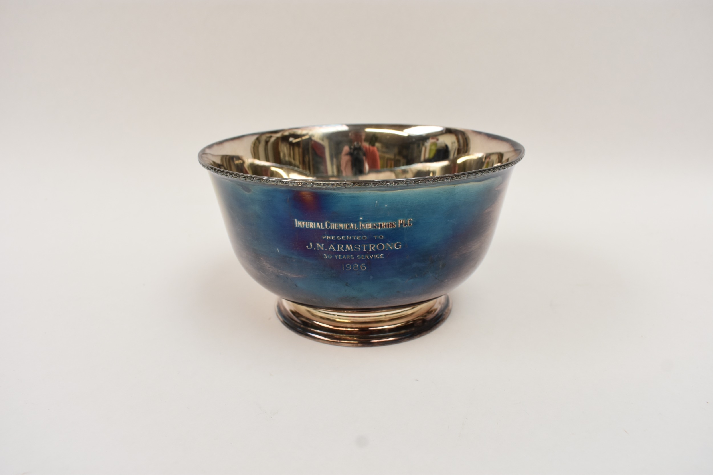 A Garrard & Co silver presentation bowl with inscription to the front "Imperial Chemical Industries PLC presented to J.N.ARMSTRONG 30 years service 1986". Sheffield 1986, 8.5cm x 15.5cm diameter, 335g