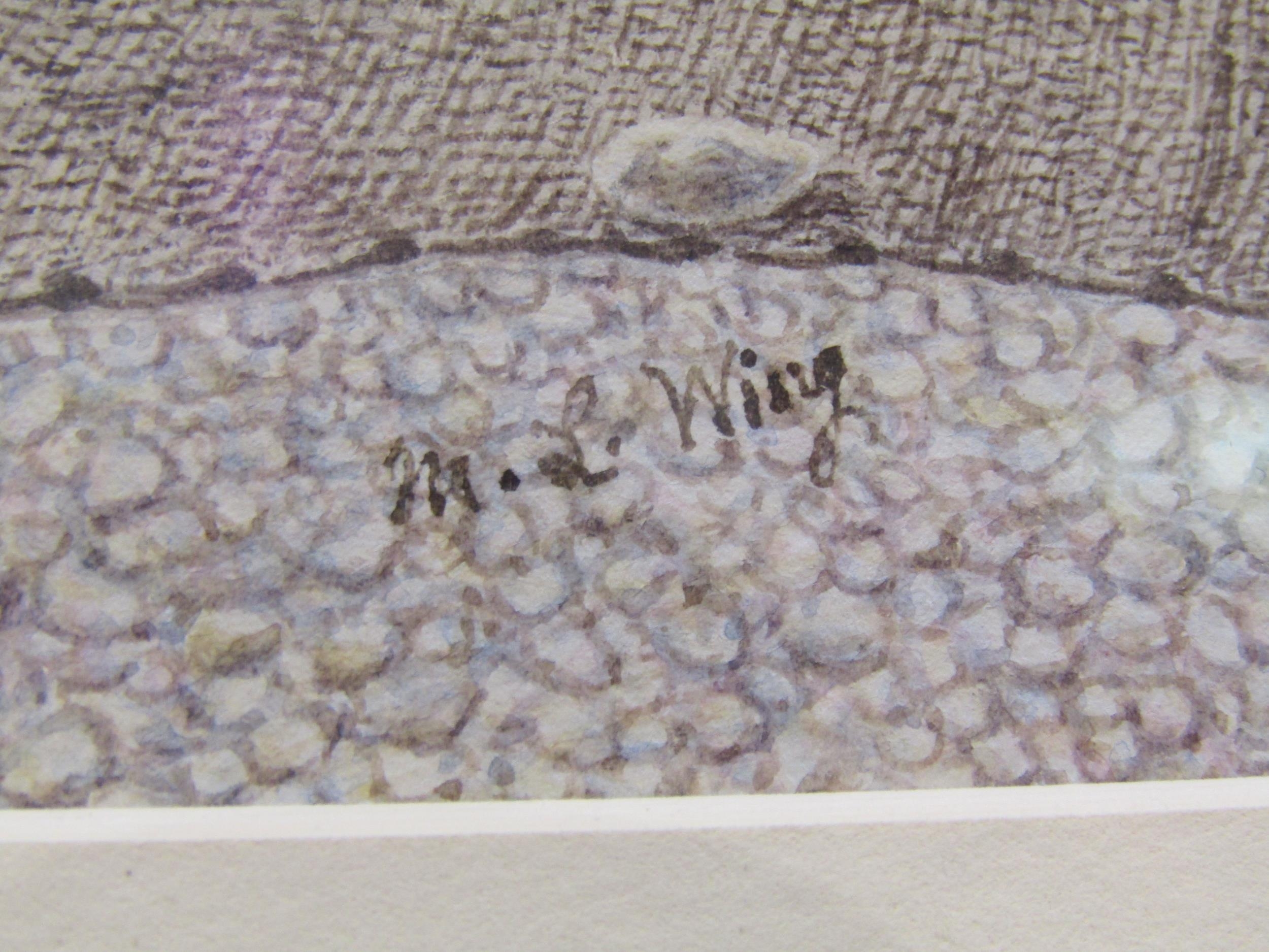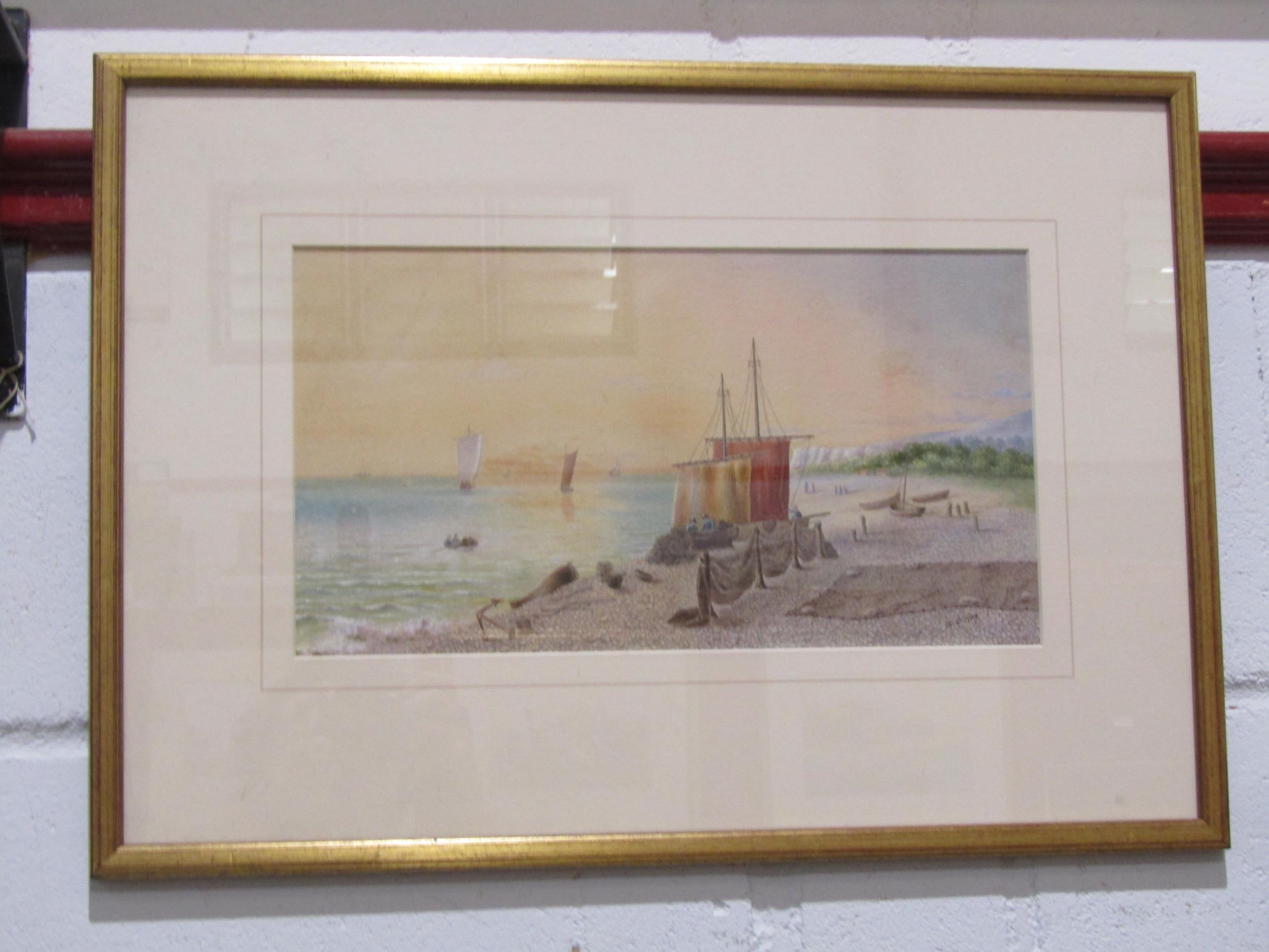 MISS M.L.WING (exhibited 1882-89): A watercolour of fishermen on the shore, signed lower right, framed and glazed, 19cm x 35cm image size