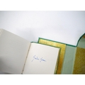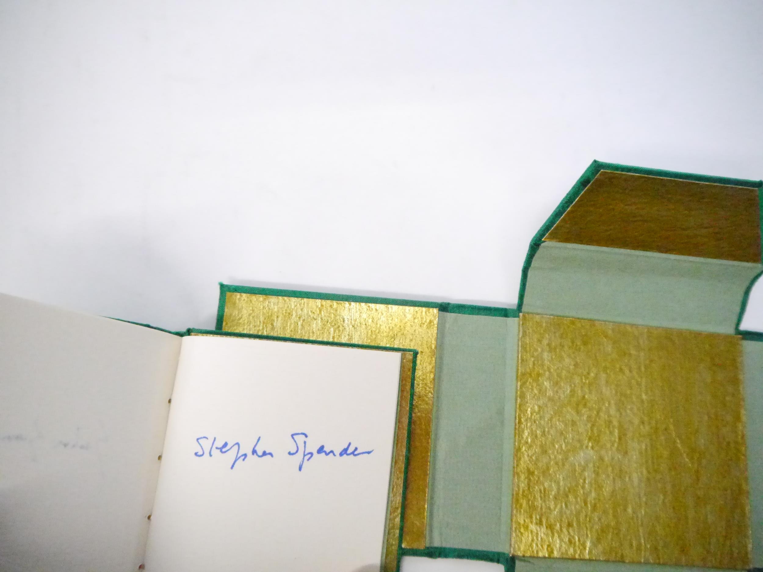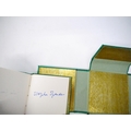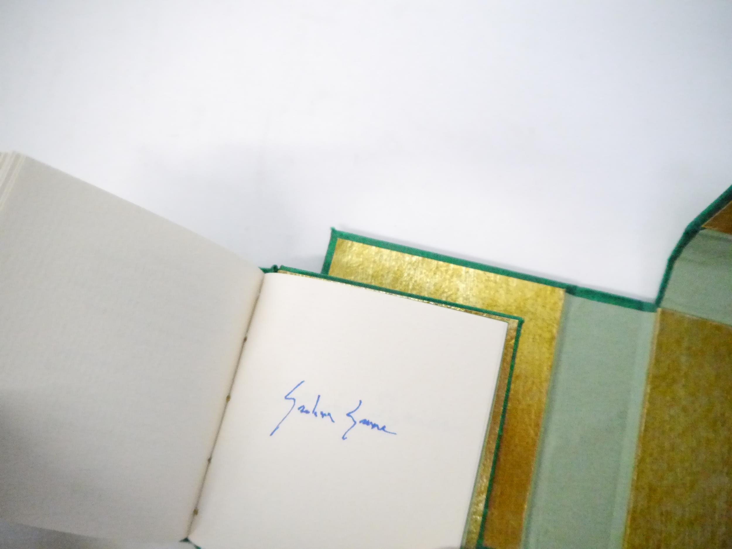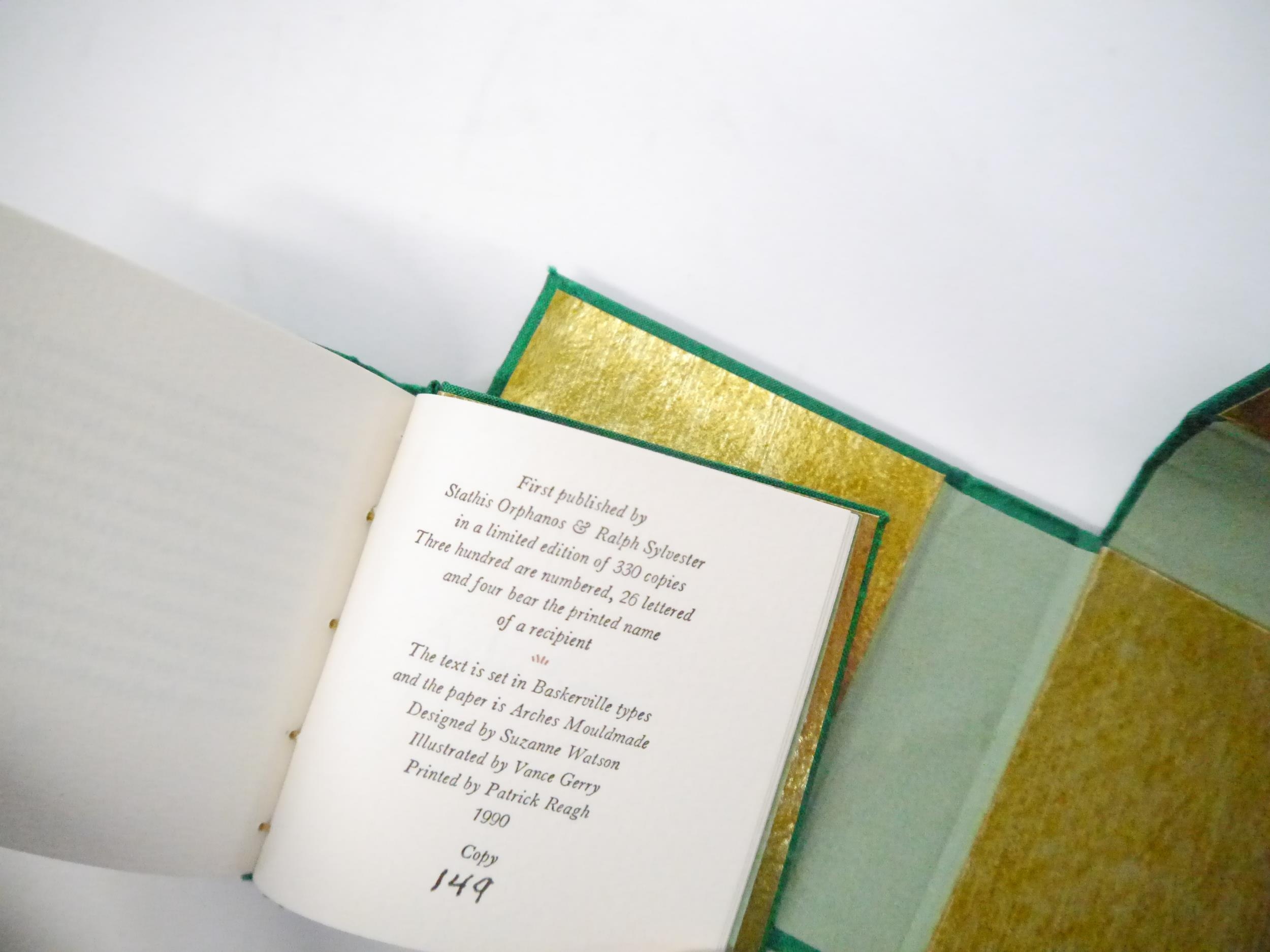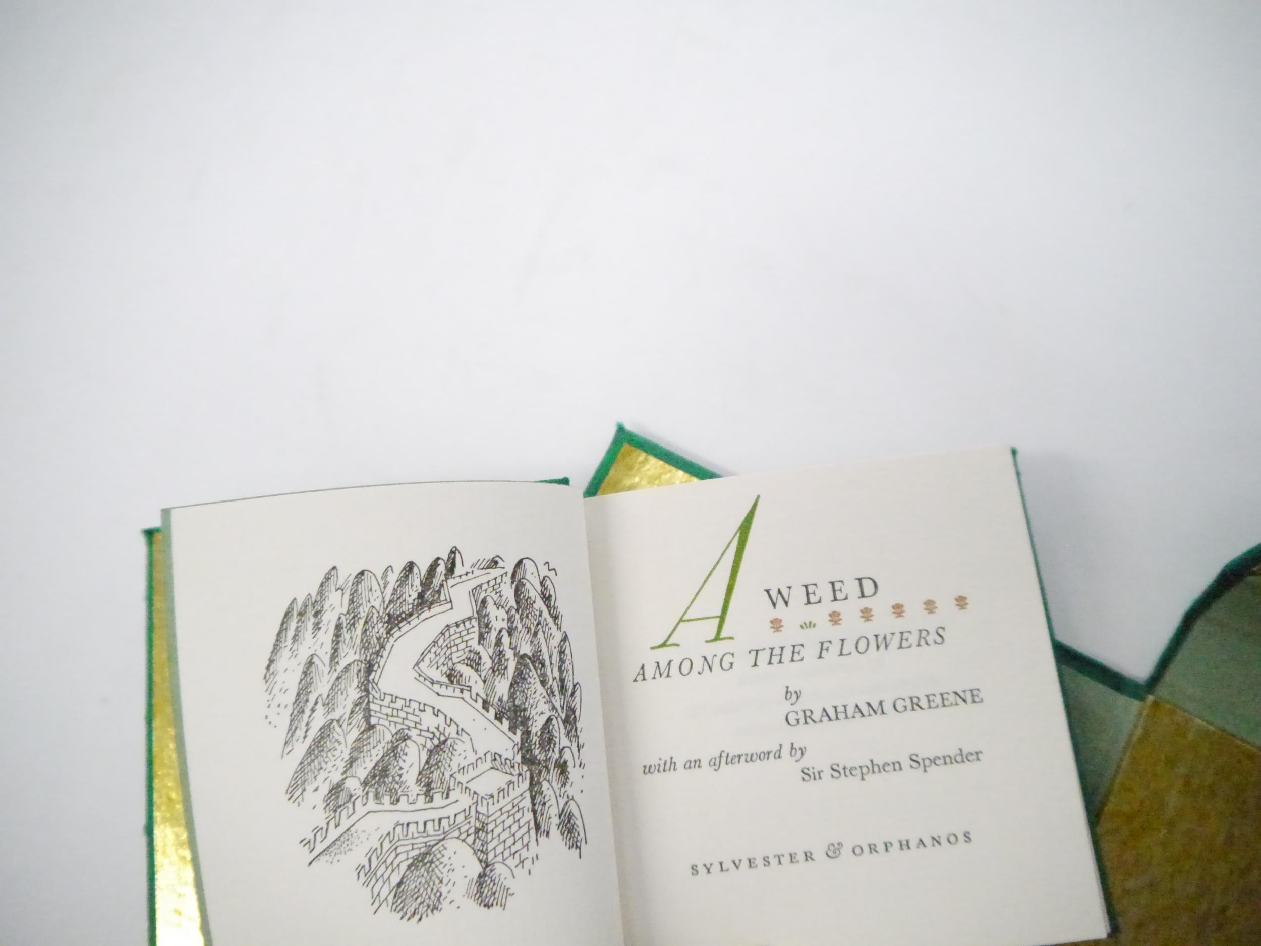 Graham Greene: 'A Weed Among the Flowers. Afterword by Stephen Spender.', California, Orphanos and Sylvester, 1990, limited edition, hand printed by Patrick Reagh in an edition of 350 numbered copies, this number 149, signed by Graham Greene and Stephen Spender, illustrations by Vance Gerry, 47pp, printed in Baskerville type on Arches Mouldmade paper, small format book (7.5 x 7.5cm), original stab binding in Green Matka Silk with charm and braided stitching ends, green printed paper label to front cover backed in gilt foil, gilt end papers, housed in matching green silk clamshell box, printed title label to spine. Greene's late memoir (he died the following year) about his visit to China in 1957 in a party of British writers and intellectuals.