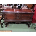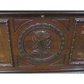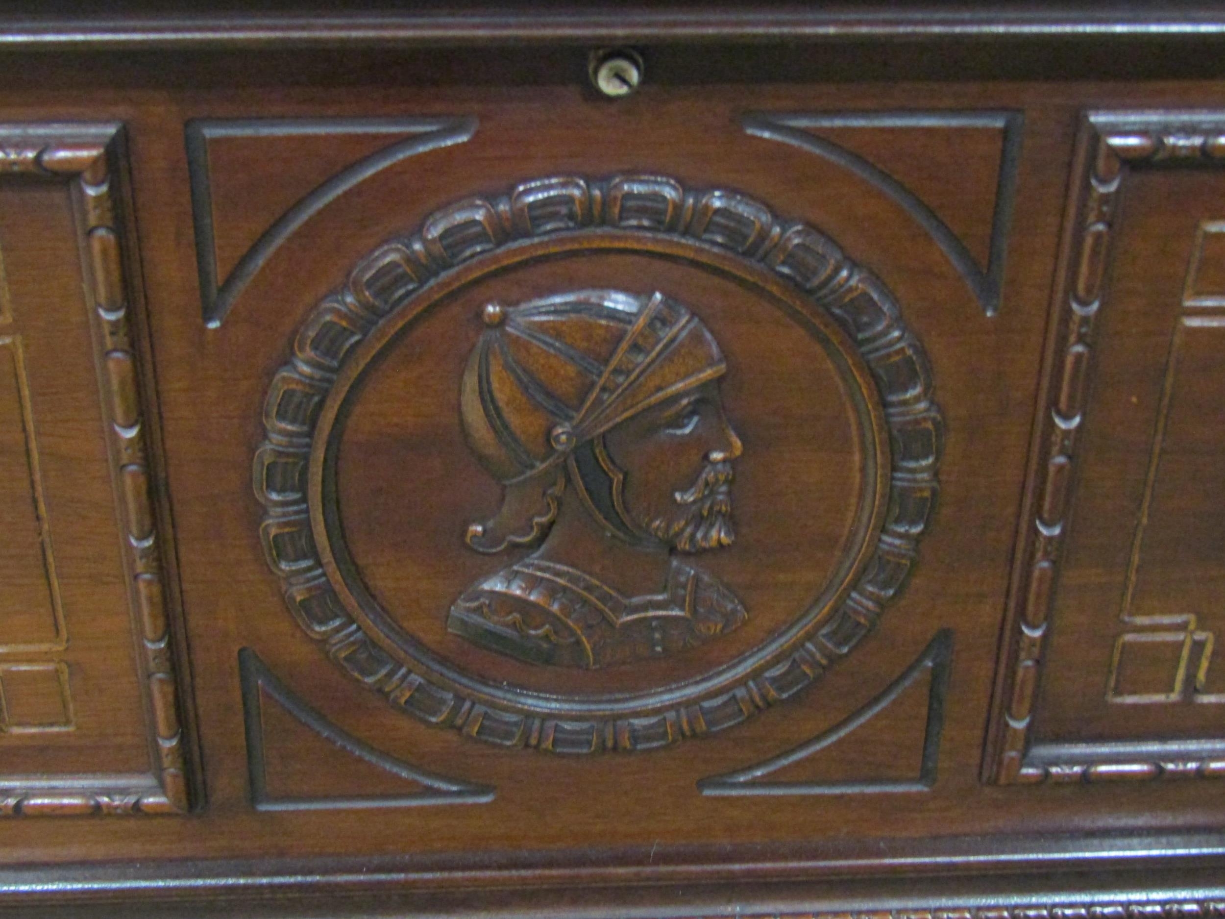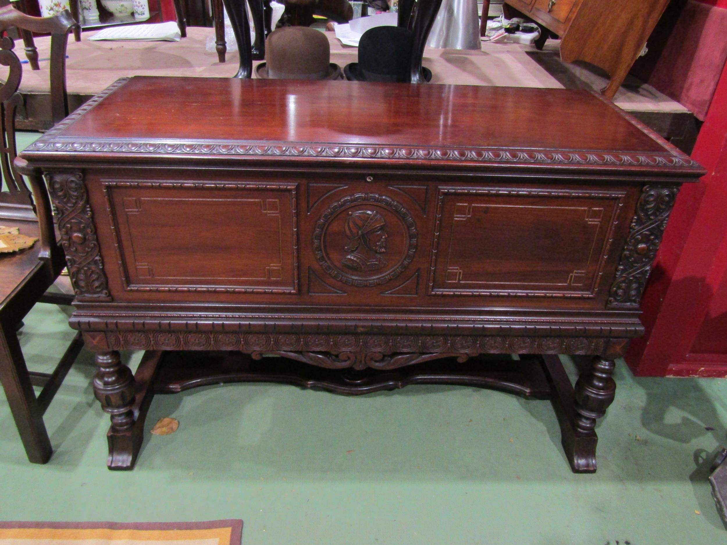 An 18th Century style cedarwood cassone on stand, the egg and dart carved edge top with push button release on a panel and carved front with central nobleman decoration overturned fore legs with a flat stretcher and roundel, 78cm tall x 122cm wide x 51cm deep