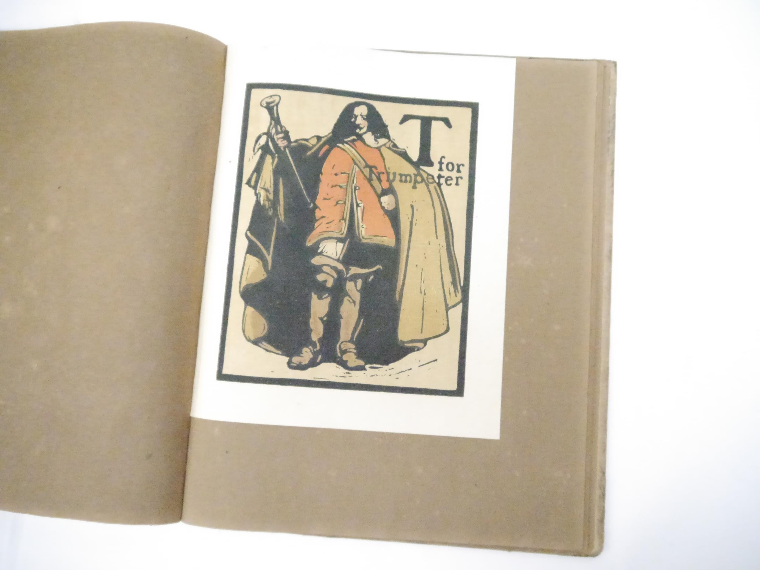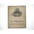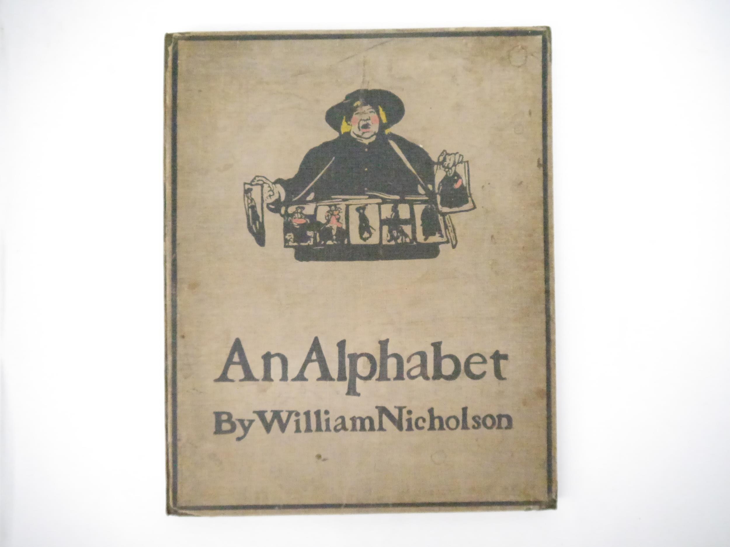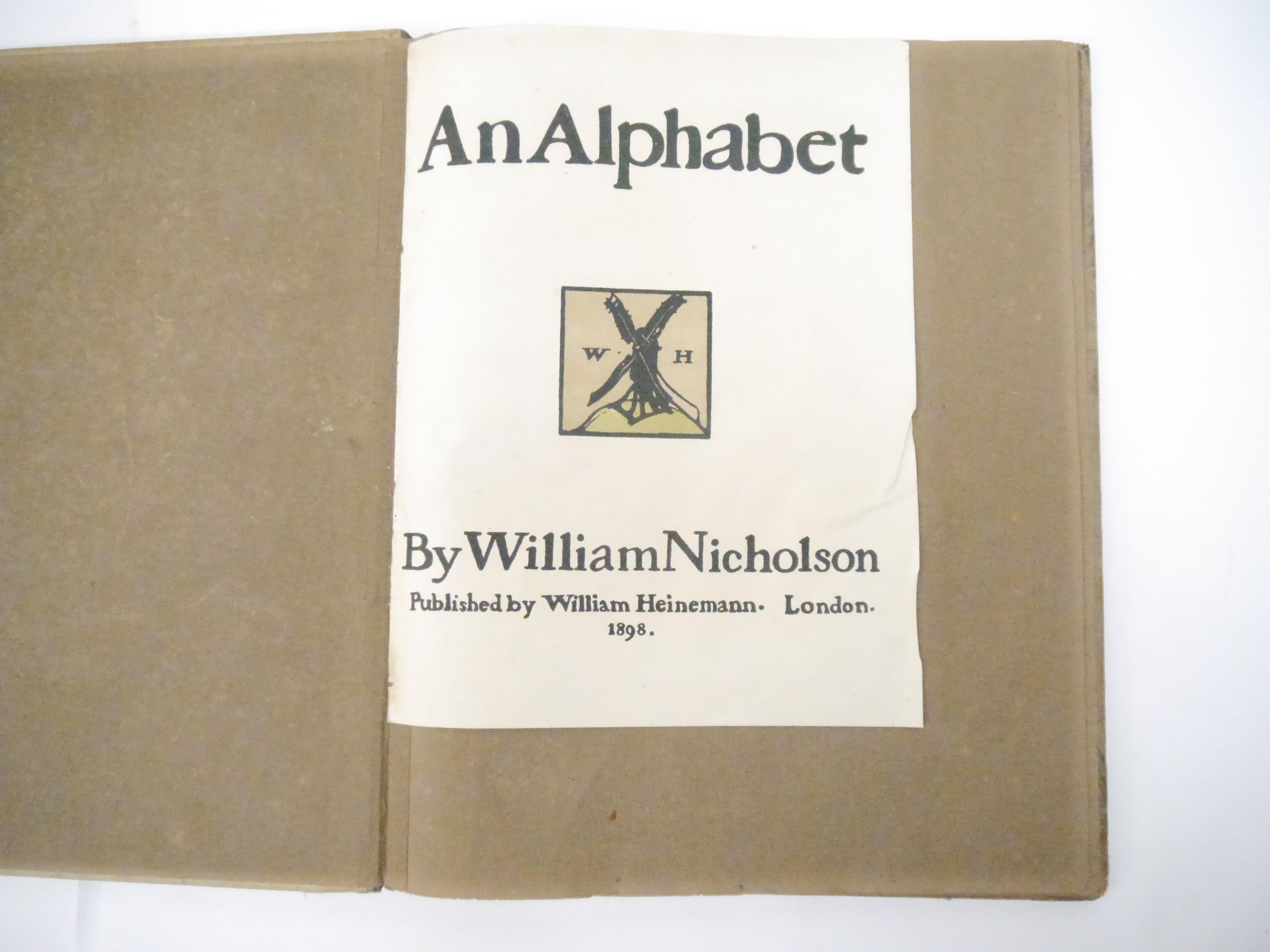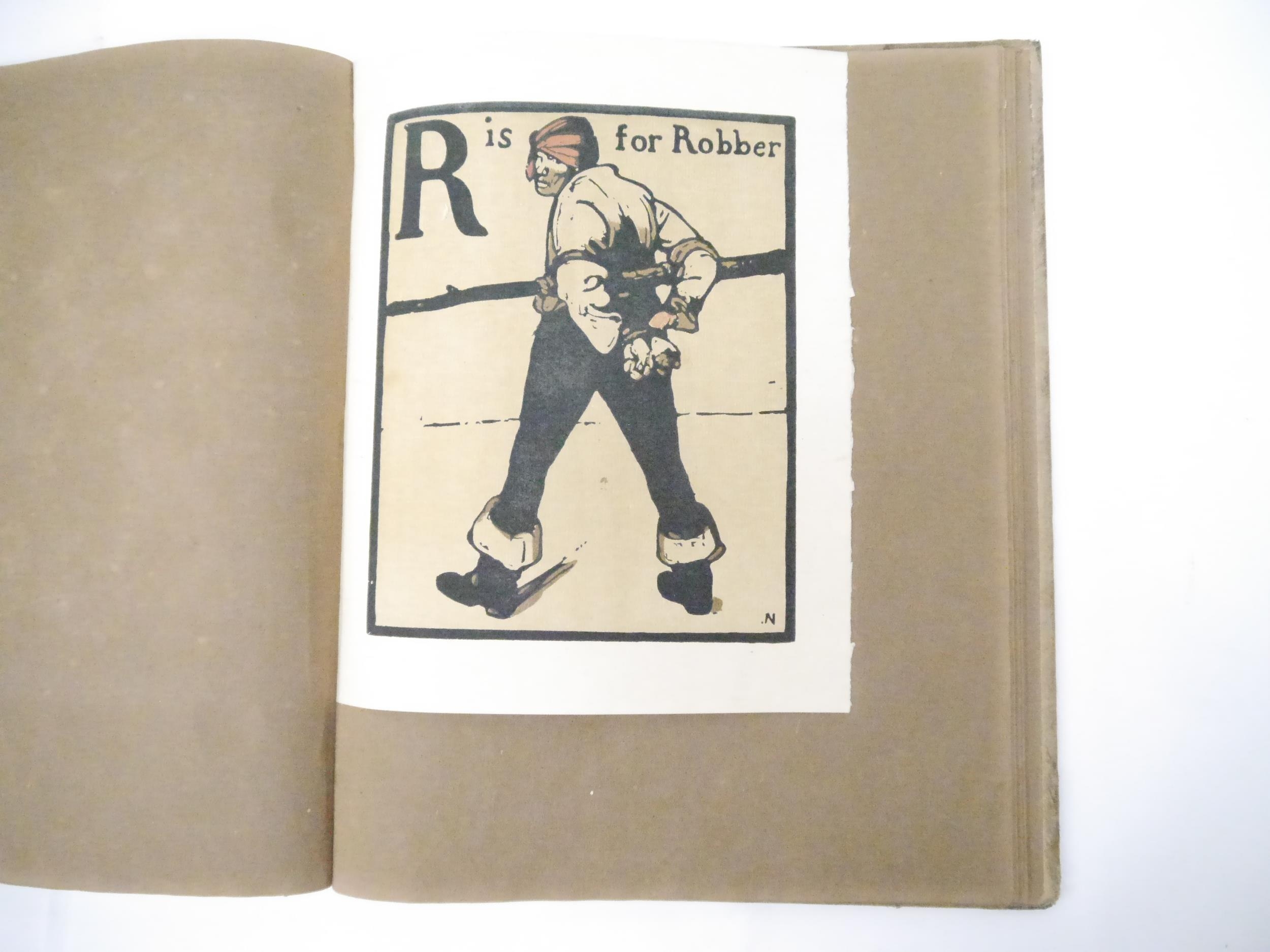William Nicholson: 'An Alphabet', London, William Heinemann, 1898, 1st trade edition, unusual issue, boards very large 4to size, (approx. 41 x 33cm), title page and 26 lithograph plates complete, these all tipped in between brown paper leaves, title page and plates standard 4to size (plates each approx 31 x 25cm, image sizes approx. 25 x 20cm), possibly a printer's preliminary copy or publisher's sample copy?, recased retaining original pictorial cloth