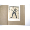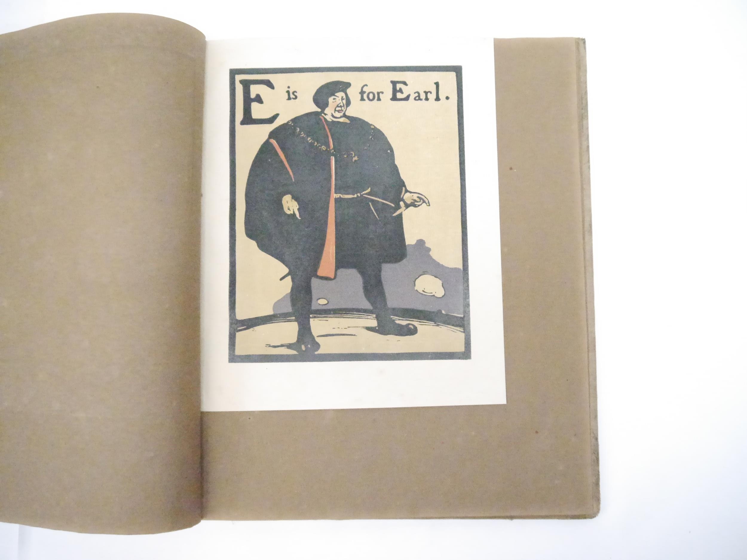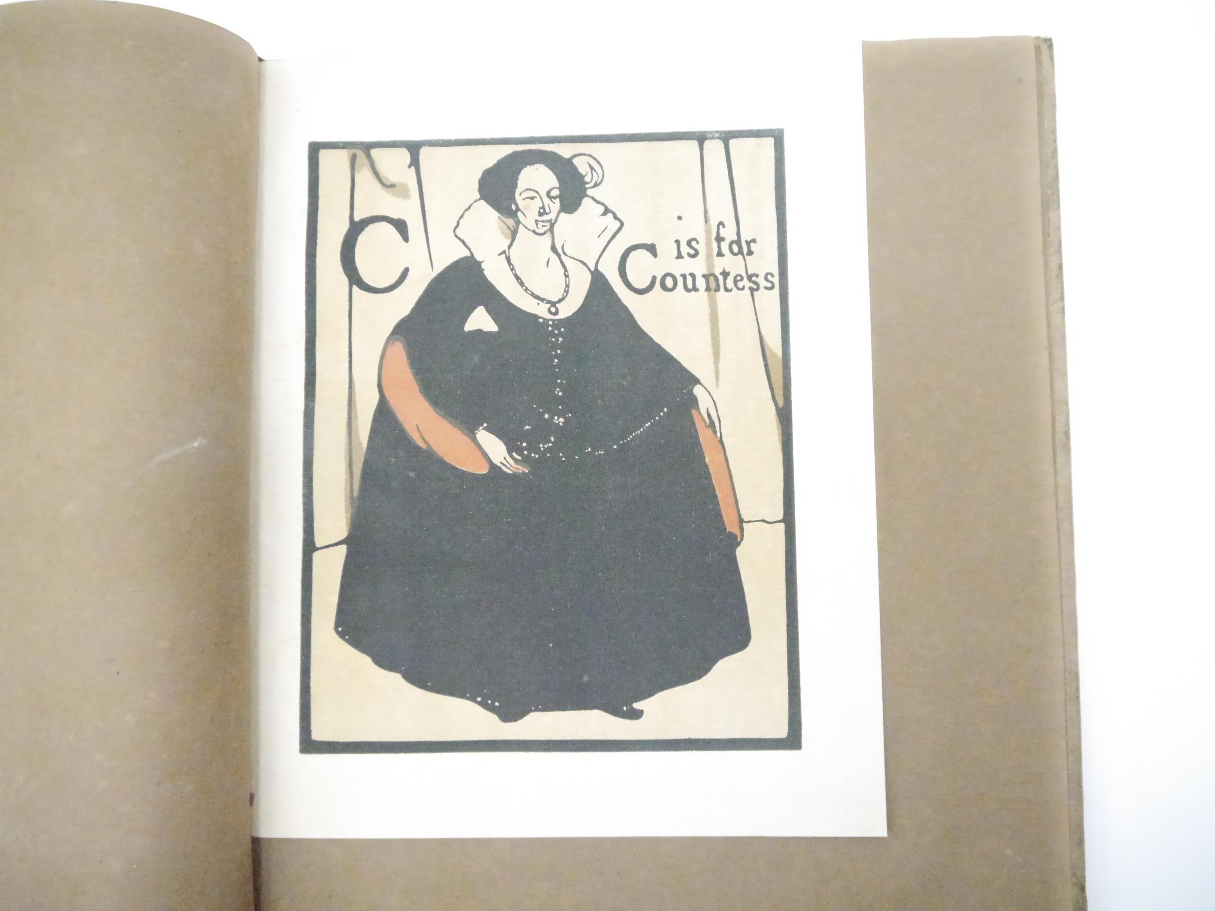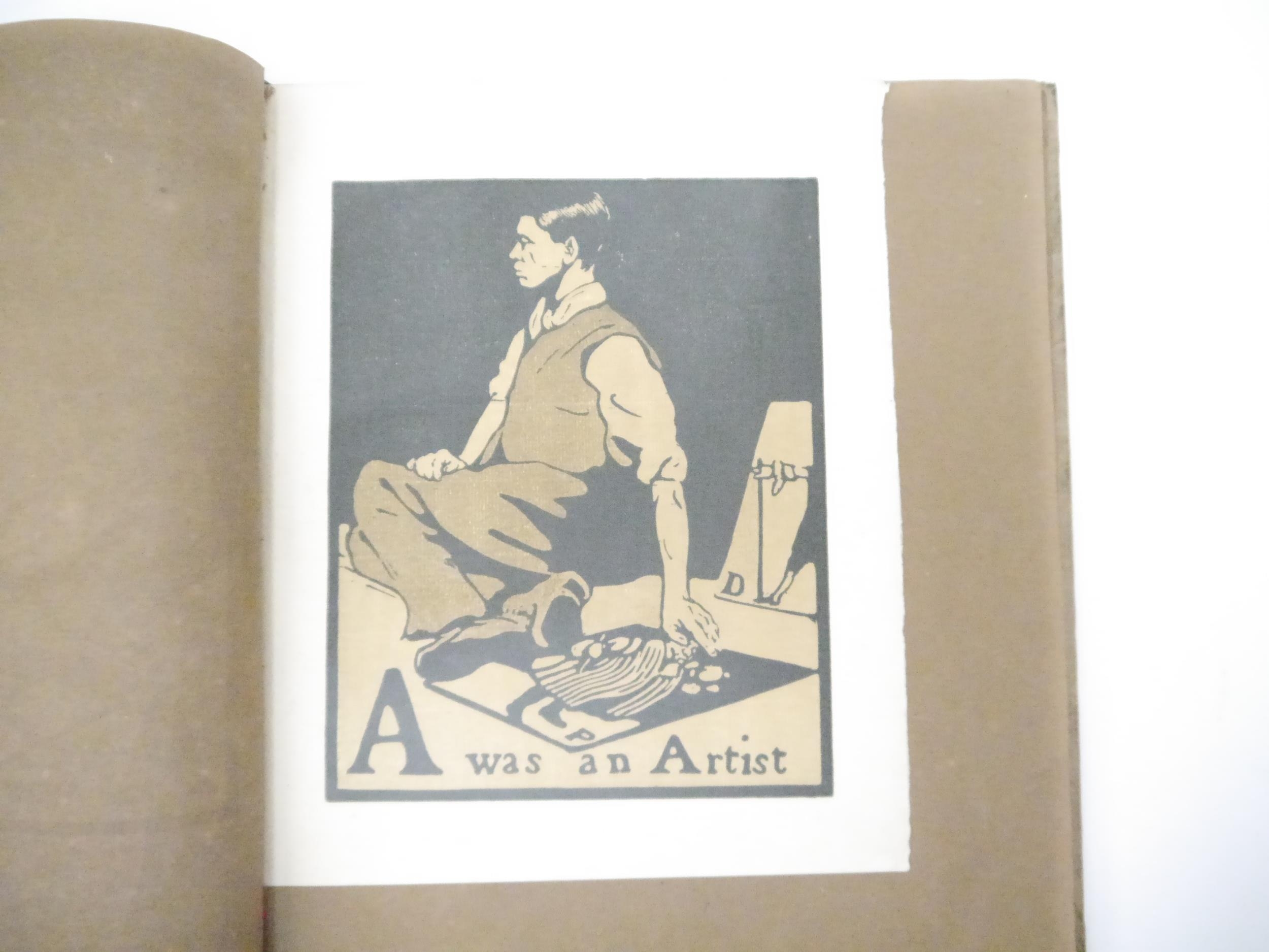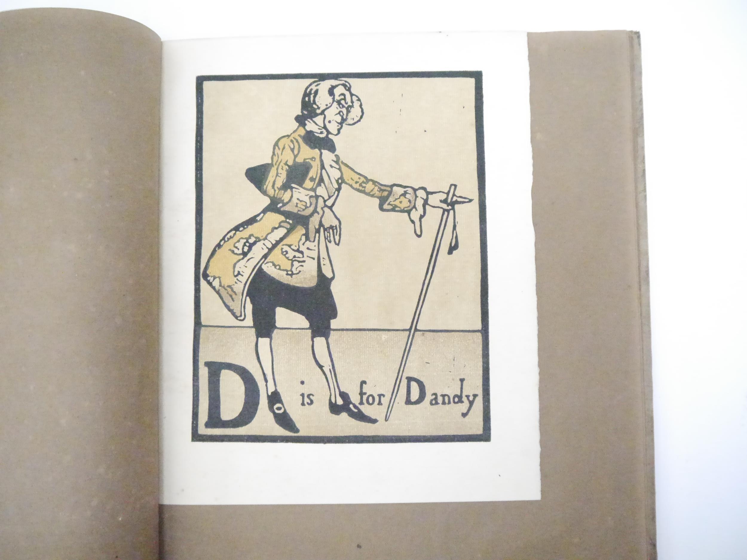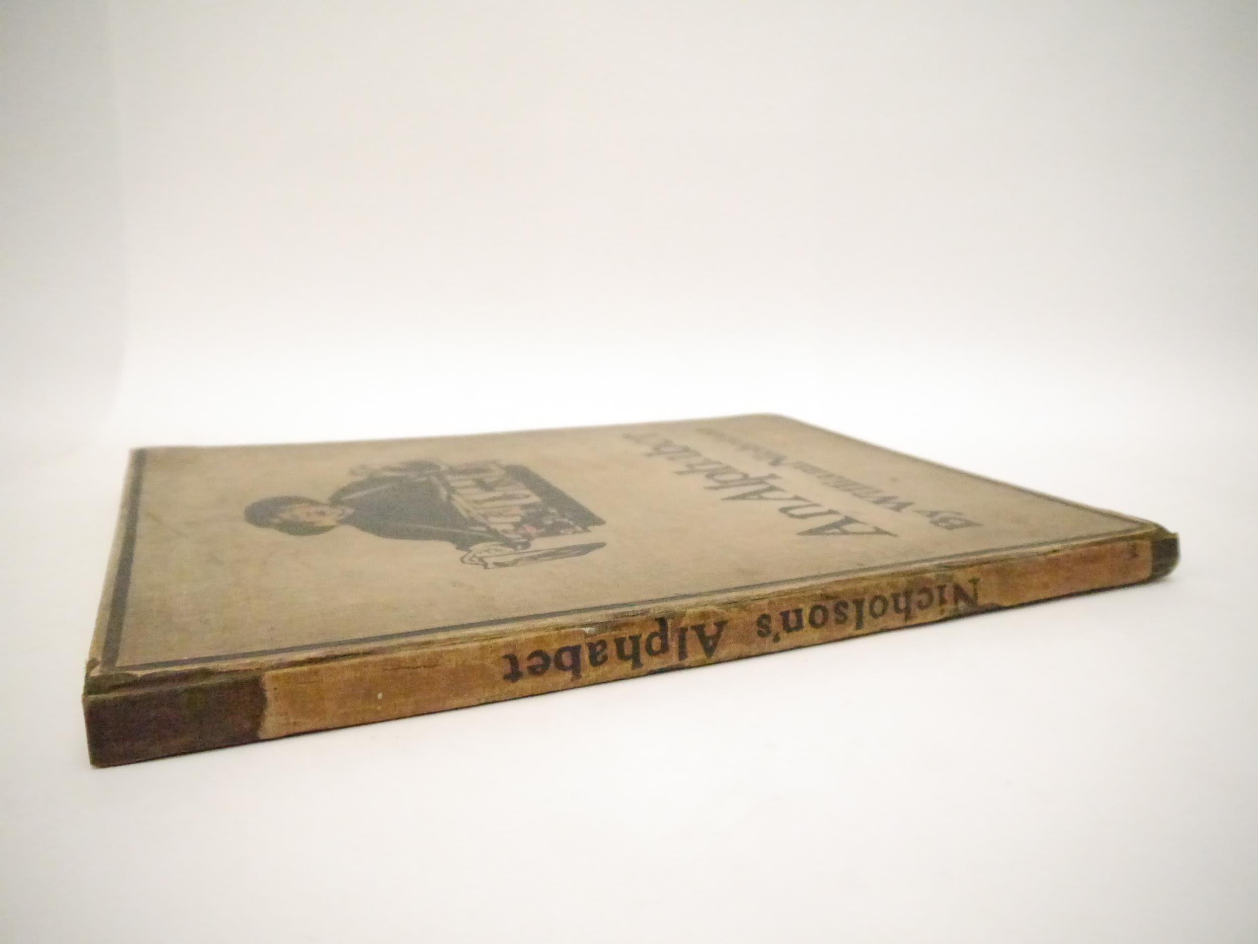 William Nicholson: 'An Alphabet', London, William Heinemann, 1898, 1st trade edition, unusual issue, boards very large 4to size, (approx. 41 x 33cm), title page and 26 lithograph plates complete, these all tipped in between brown paper leaves, title page and plates standard 4to size (plates each approx 31 x 25cm, image sizes approx. 25 x 20cm), possibly a printer's preliminary copy or publisher's sample copy?, recased retaining original pictorial cloth