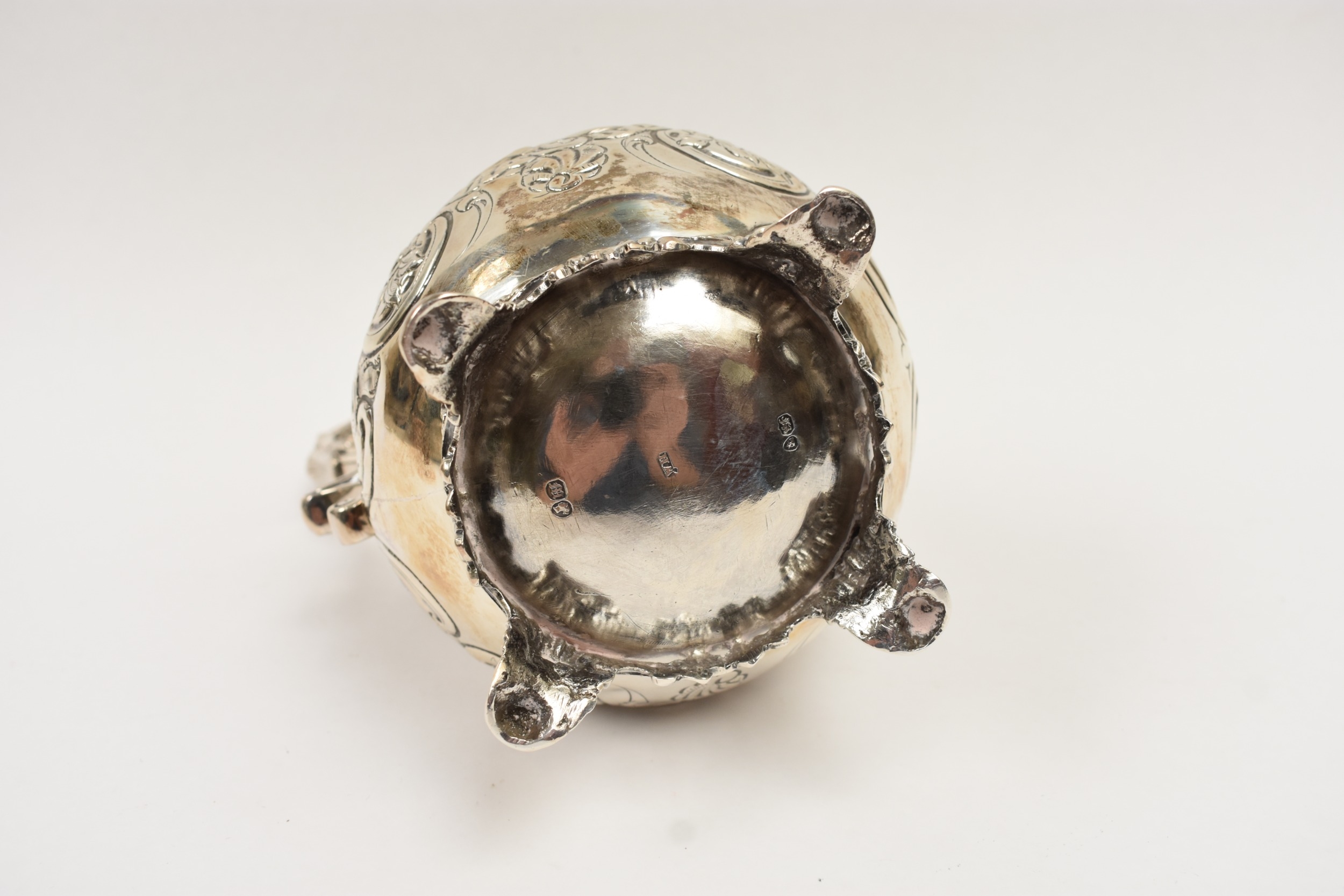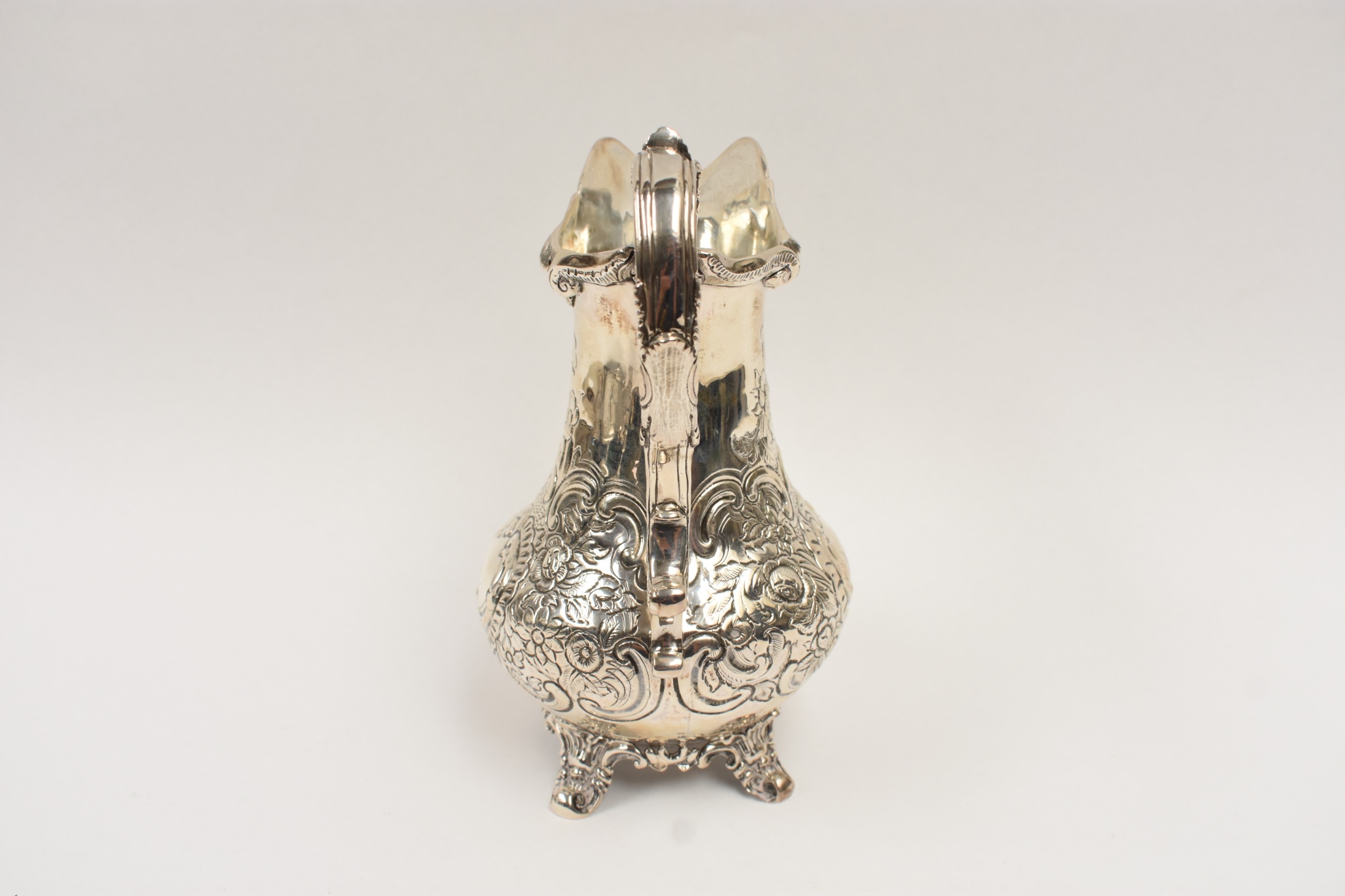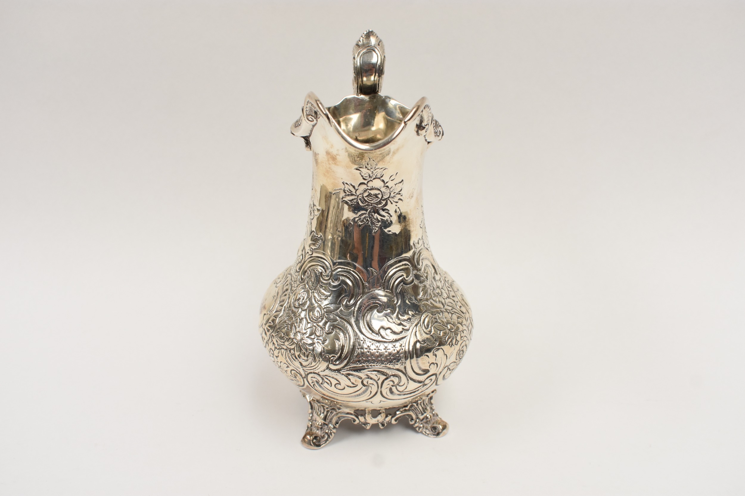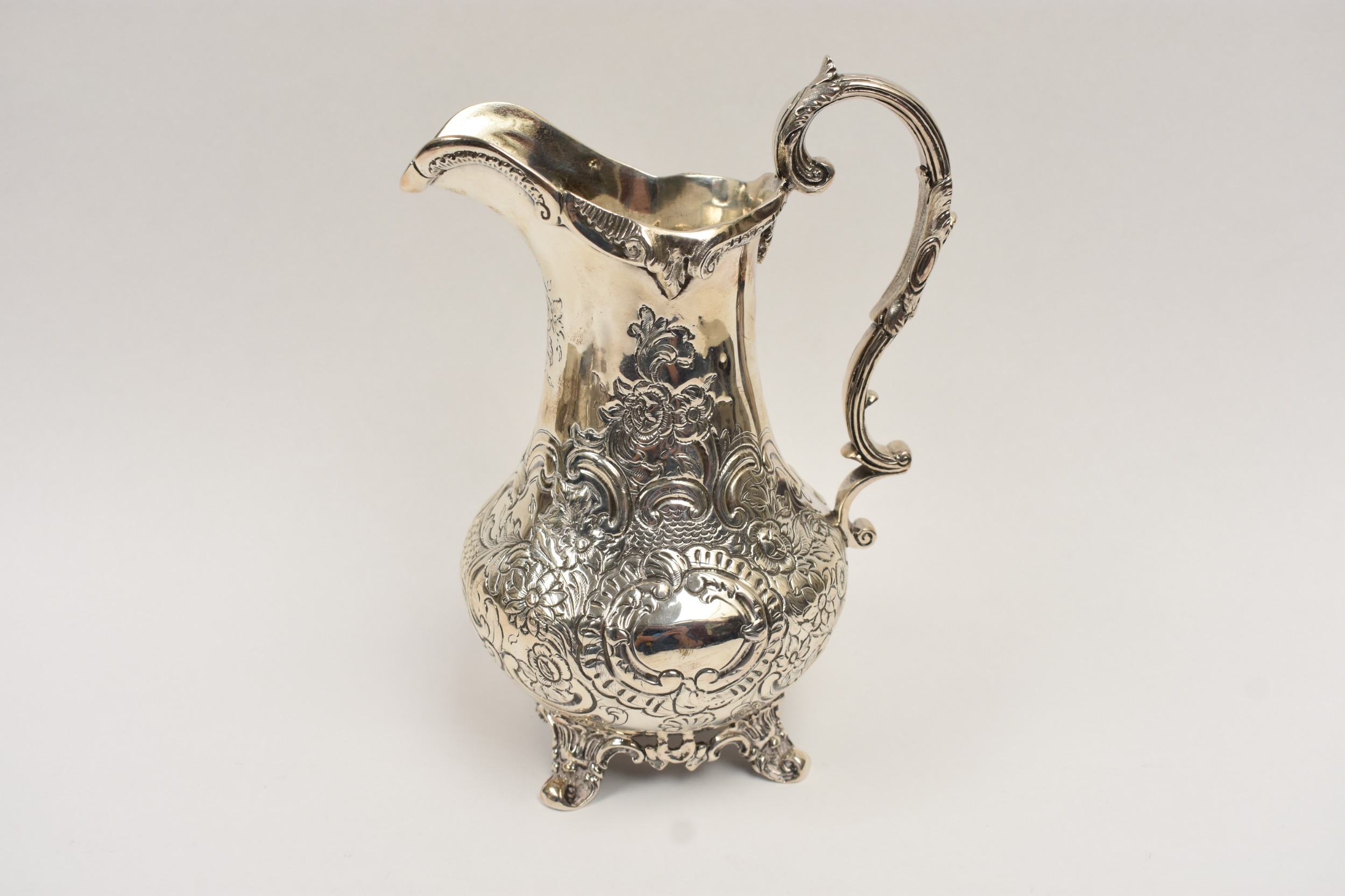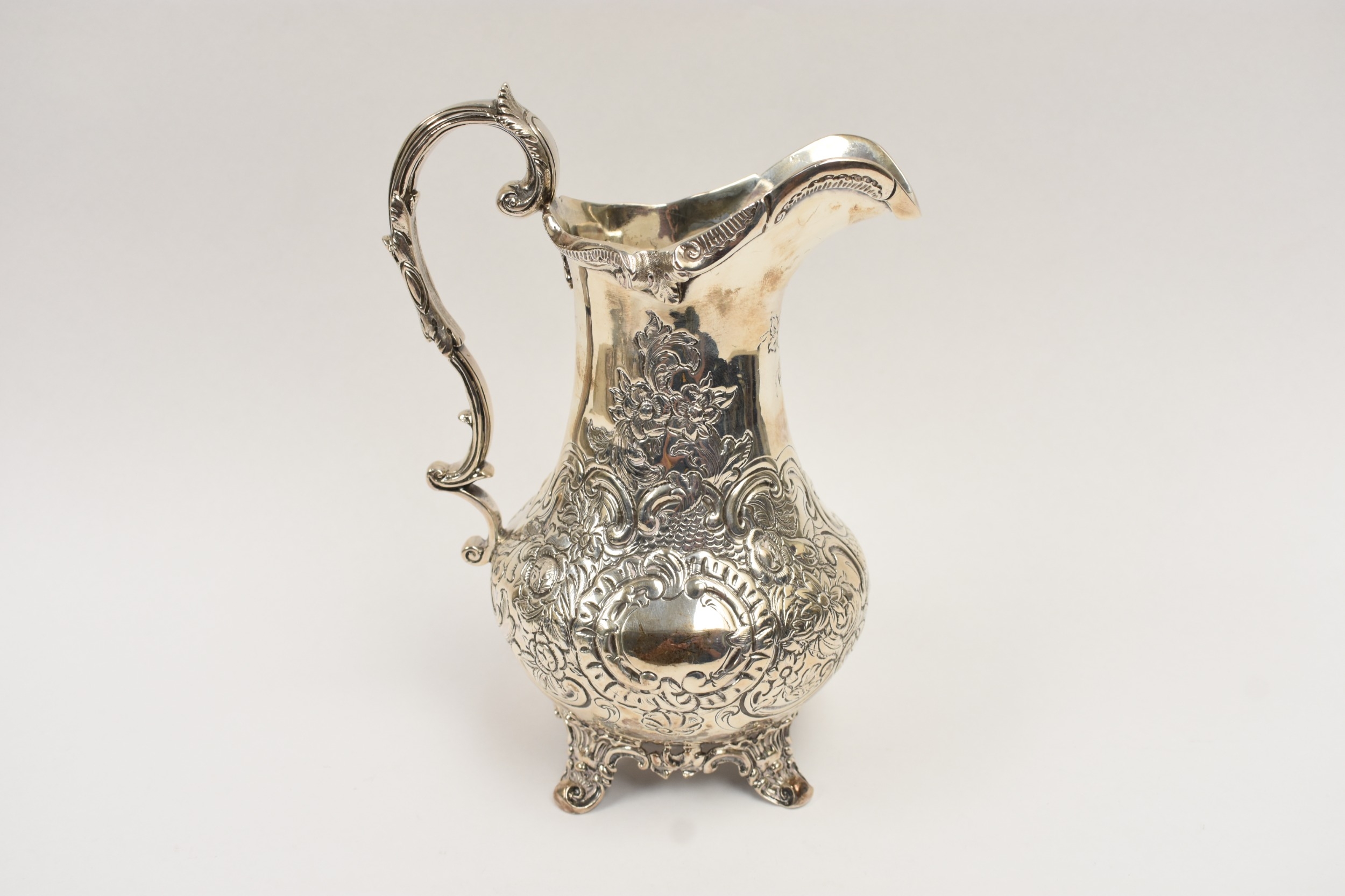 A William Hunter silver large milk jug with embossed floral and leaf detail, vacant cartouche, London 1847, 19.5cm tall. 407g