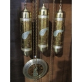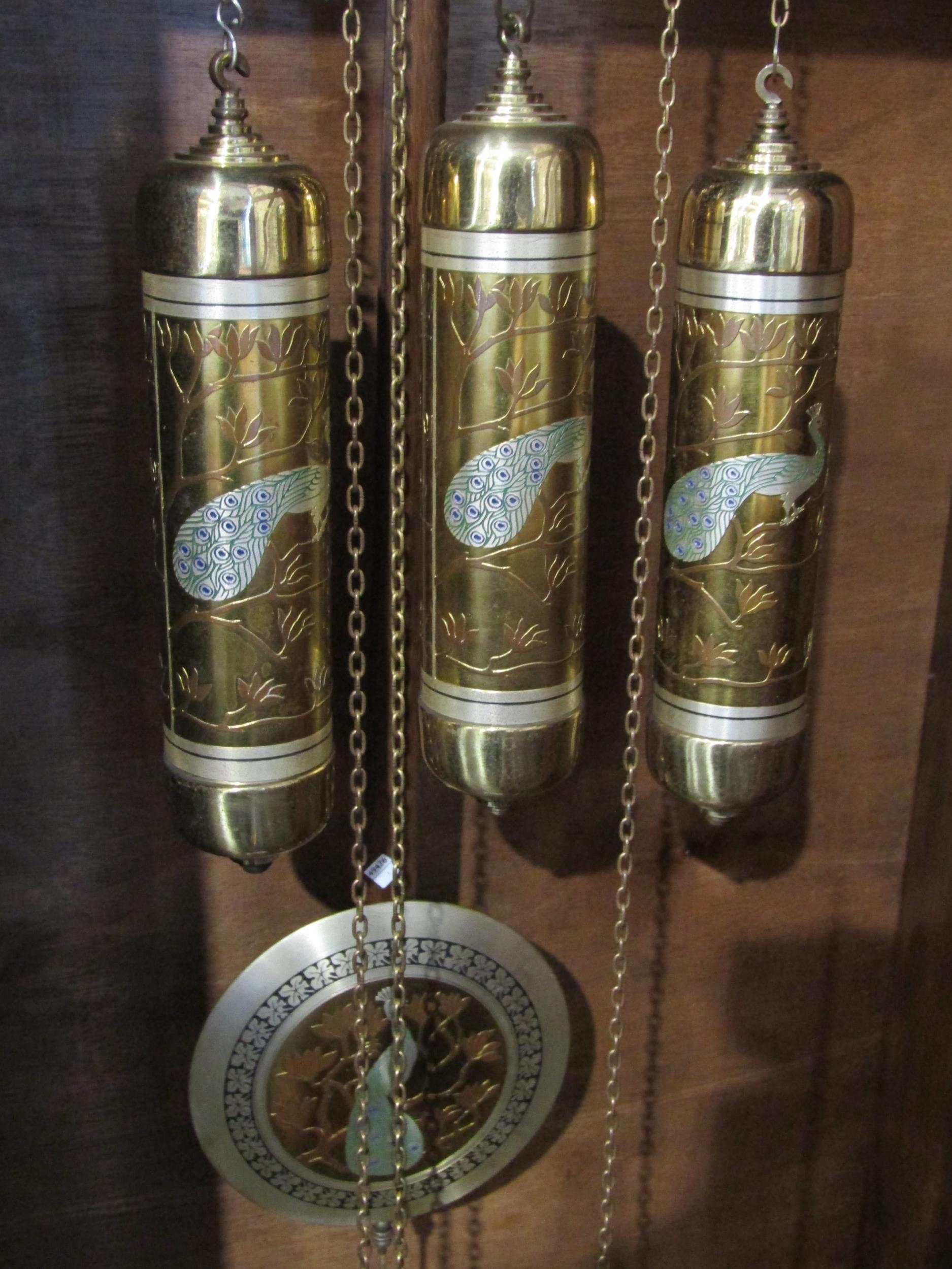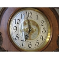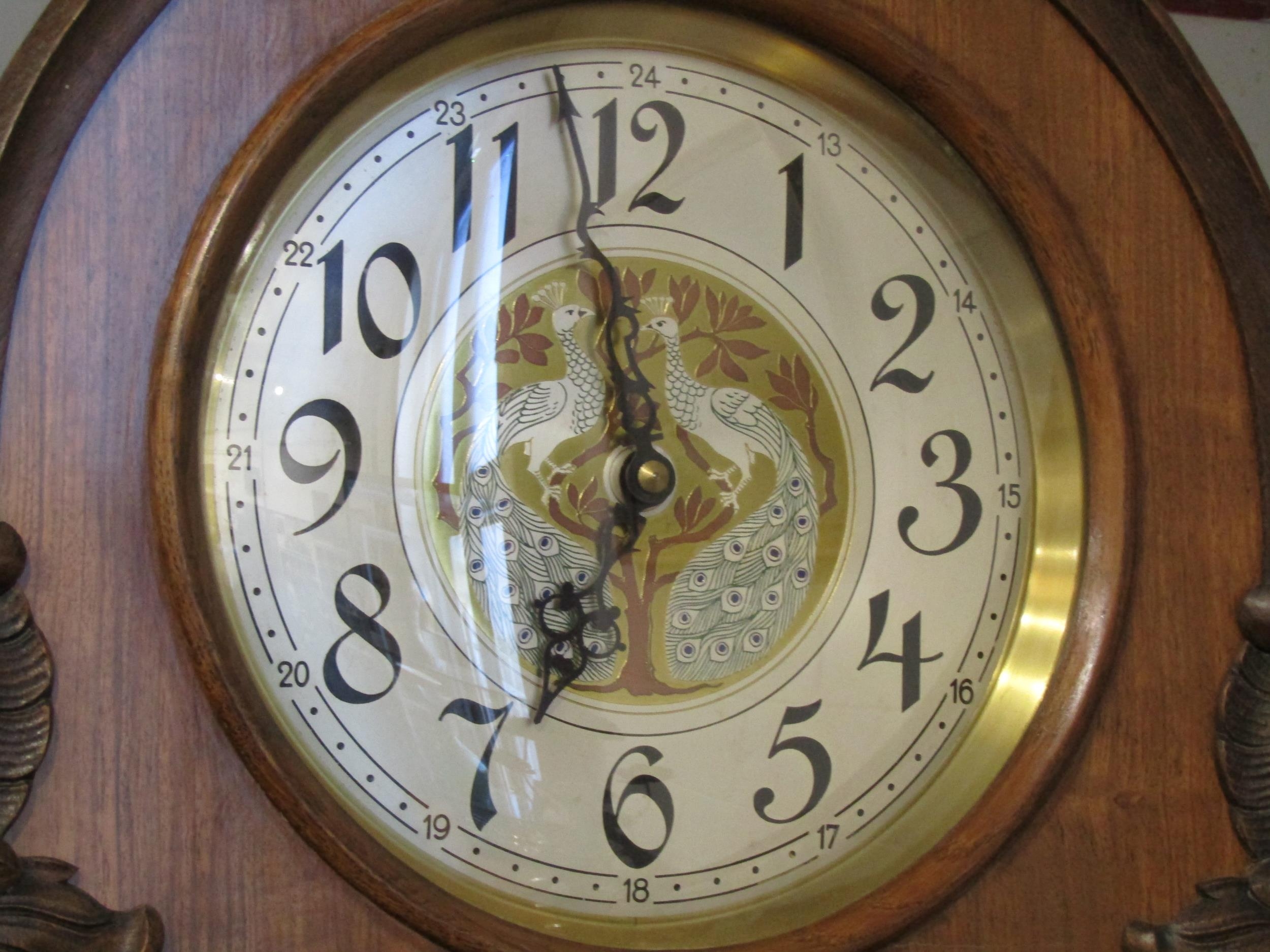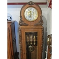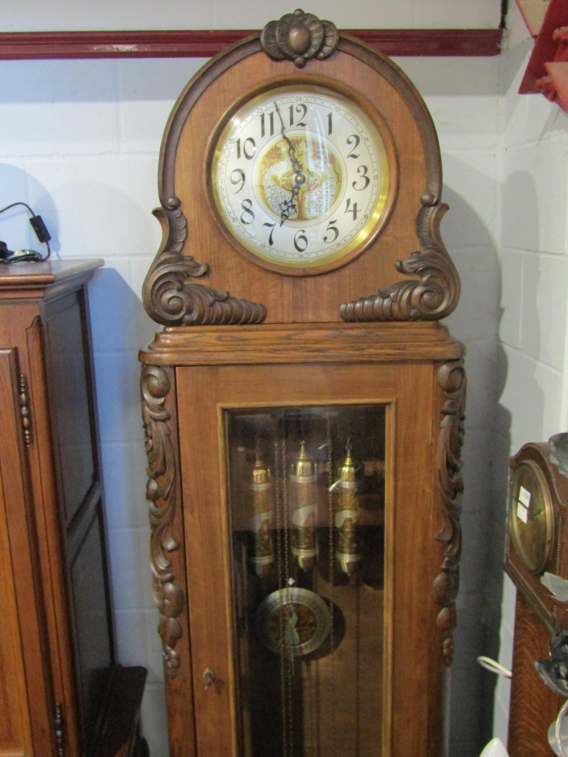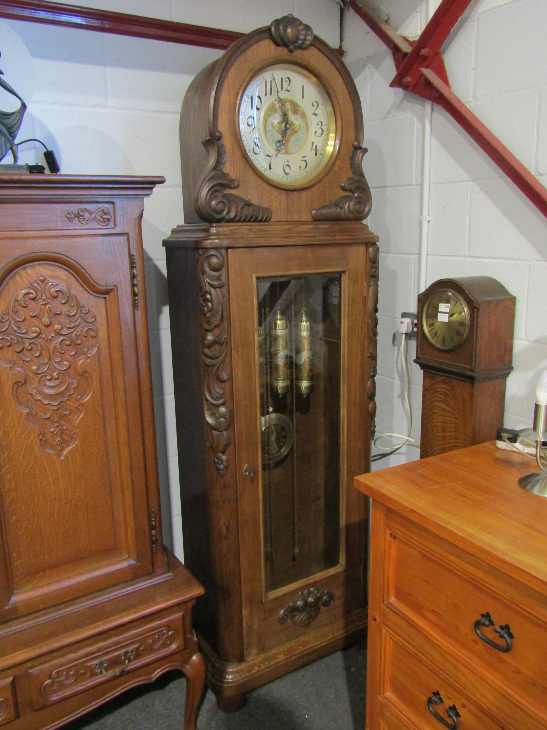 A restored circa 1920s German longcase clock by Deutsche Uhren Fabrik, wide carved oak case, with Peacock embellishments to the Arabic numerals clock face, weights, and pendulum, with Westminster chiming movement, reputedly was originally built into a piece of furniture and converted into a longcase, bevel edged glass panel door showing the pendulum and three weights, case 203cm tall x 65cm wide x 32cm deep