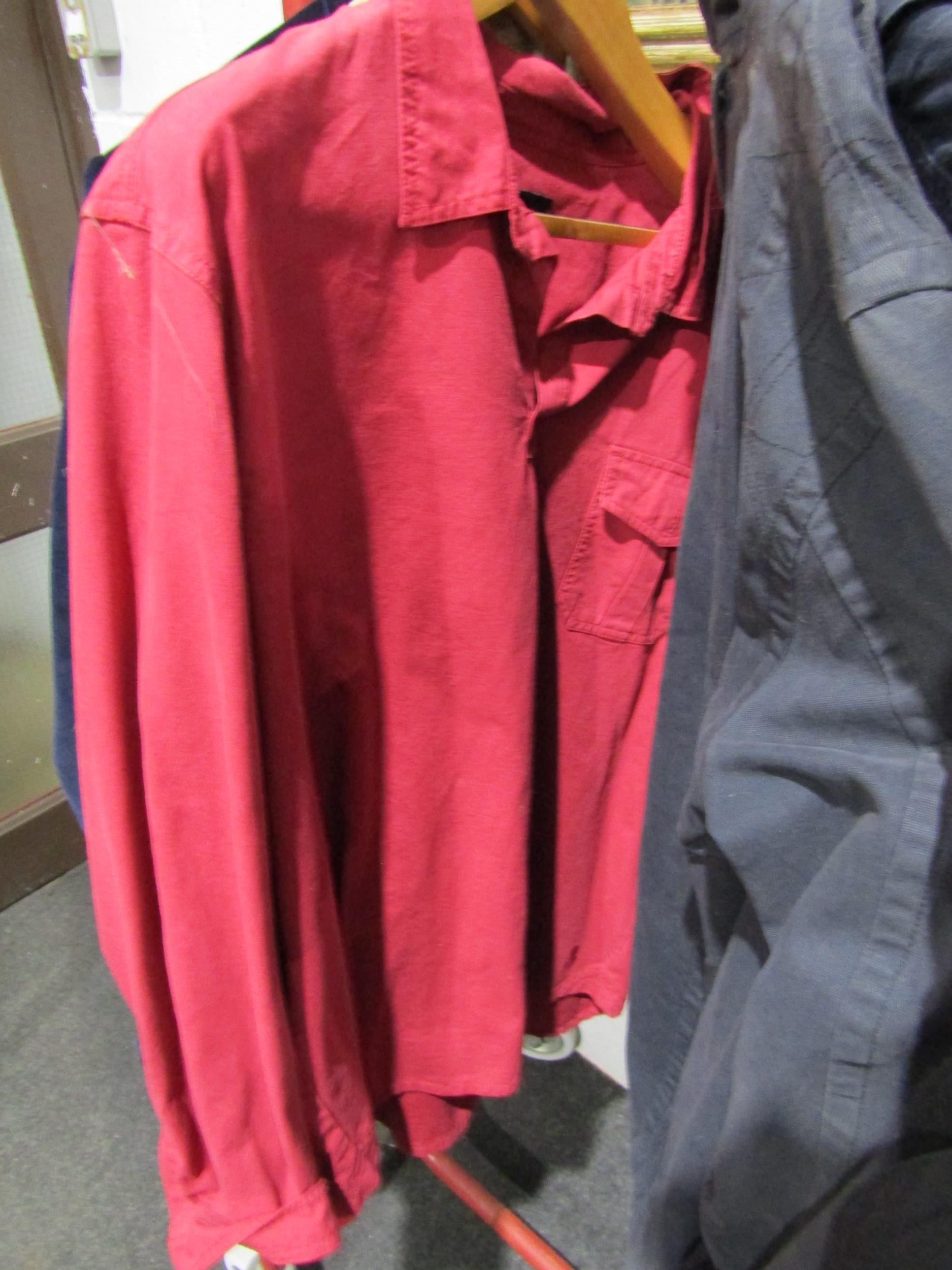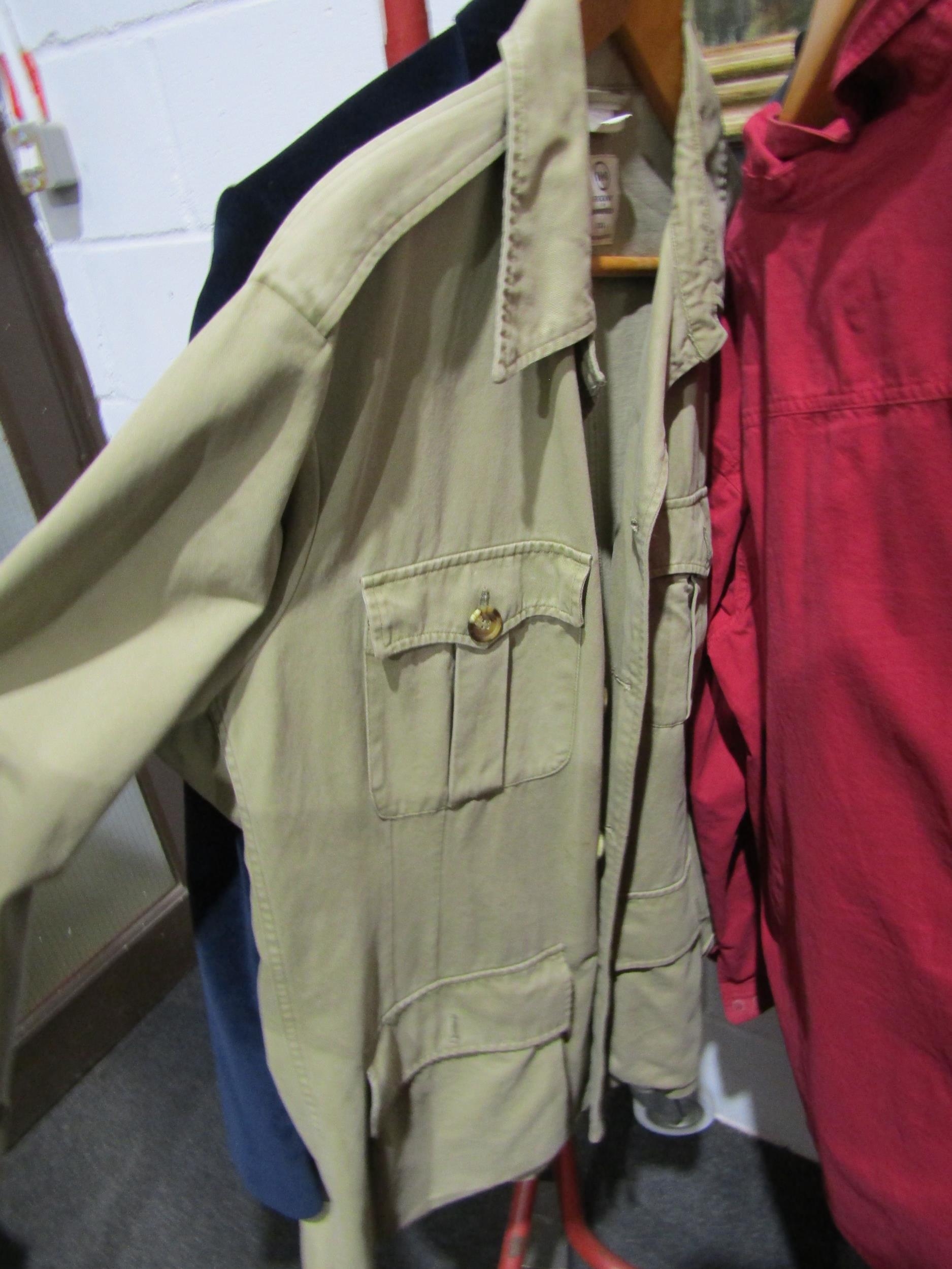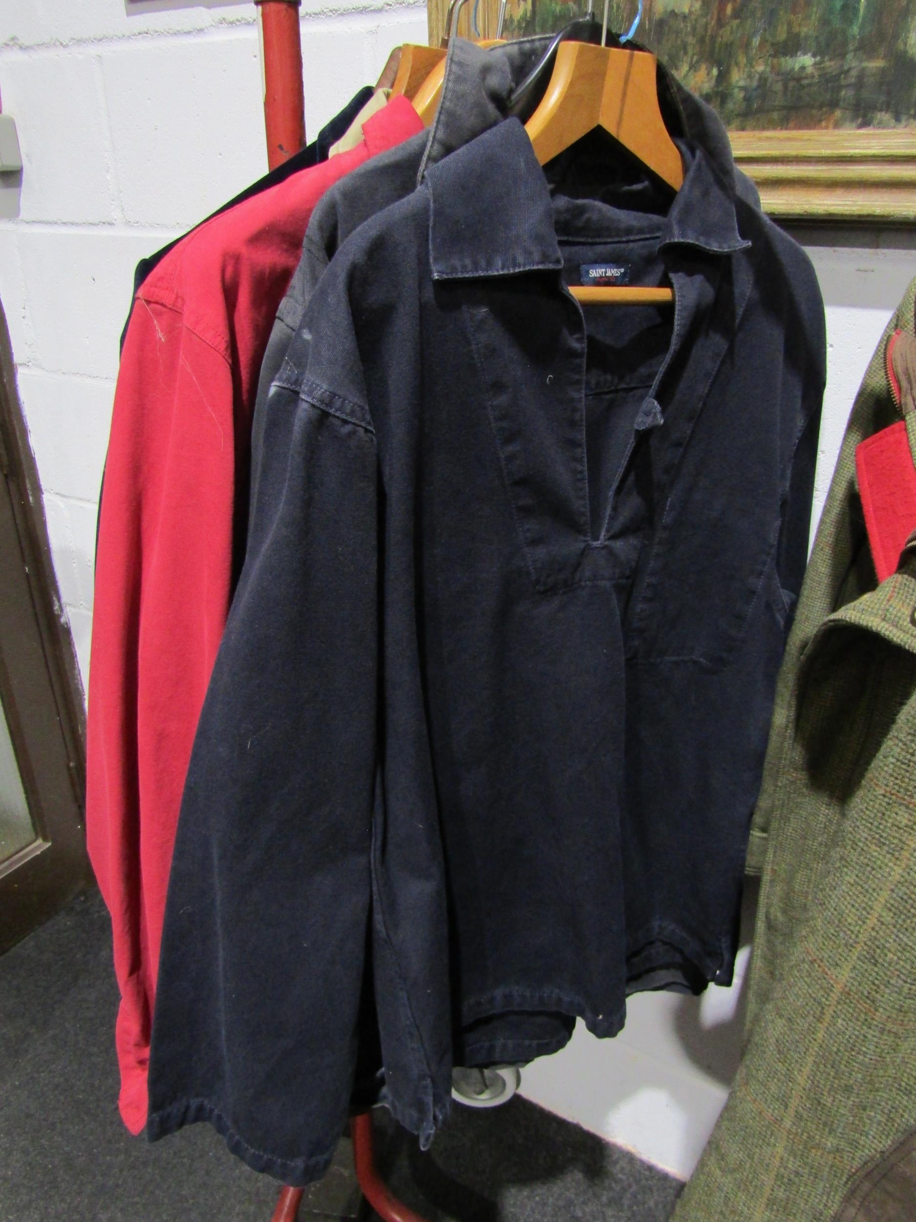 Five pieces of gents clothing to include SAINT JAMES cotton artist's style smock, a Hickman & Bousfield safari style jacket and a William Hunt Saville Row indigo blue velvet dress jacket etc. (5)