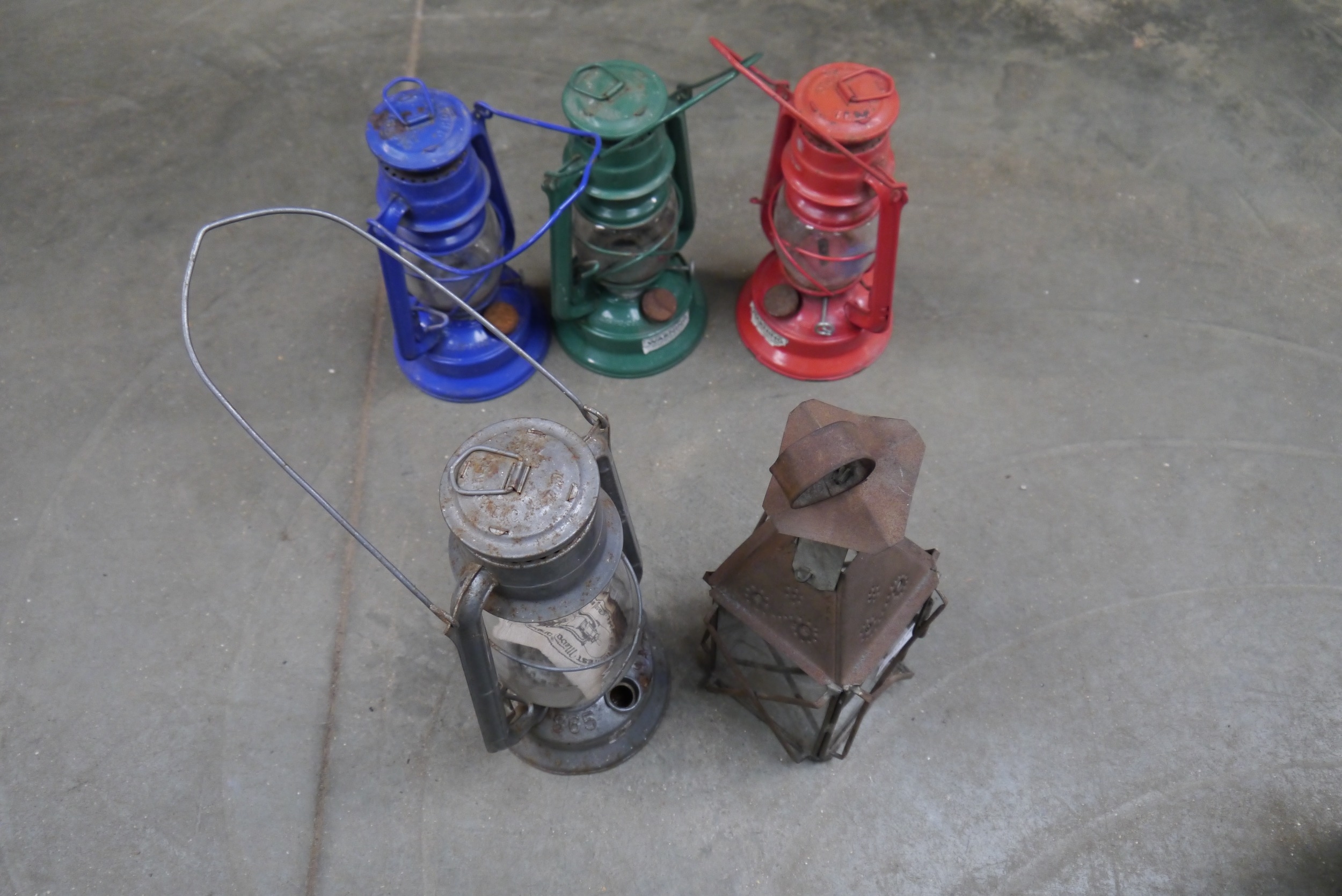 Three Chelwyn Tropic lamps, another lamp and a lantern