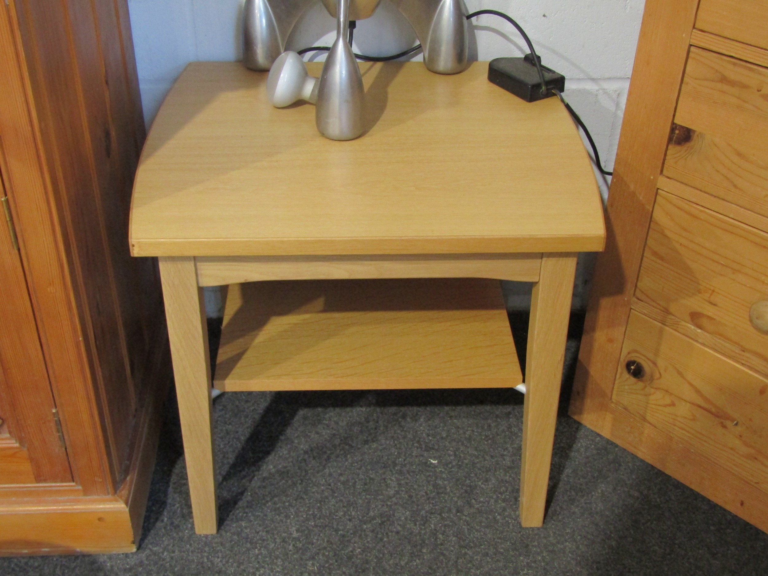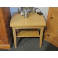 A natural oak two-tier occasional table on square tapering legs united by an under shelf, 51cm tall x 58cm long x 53cm wide