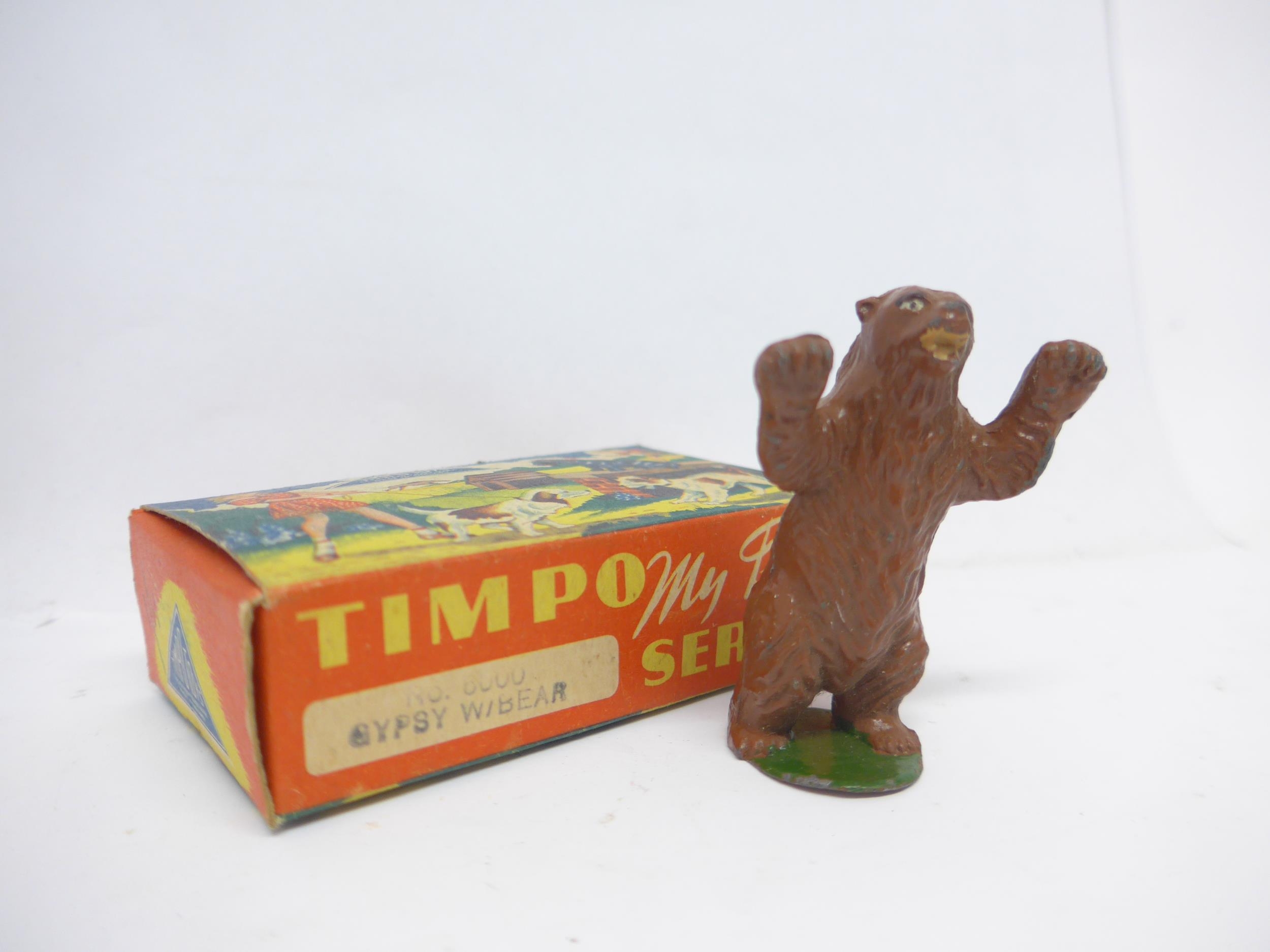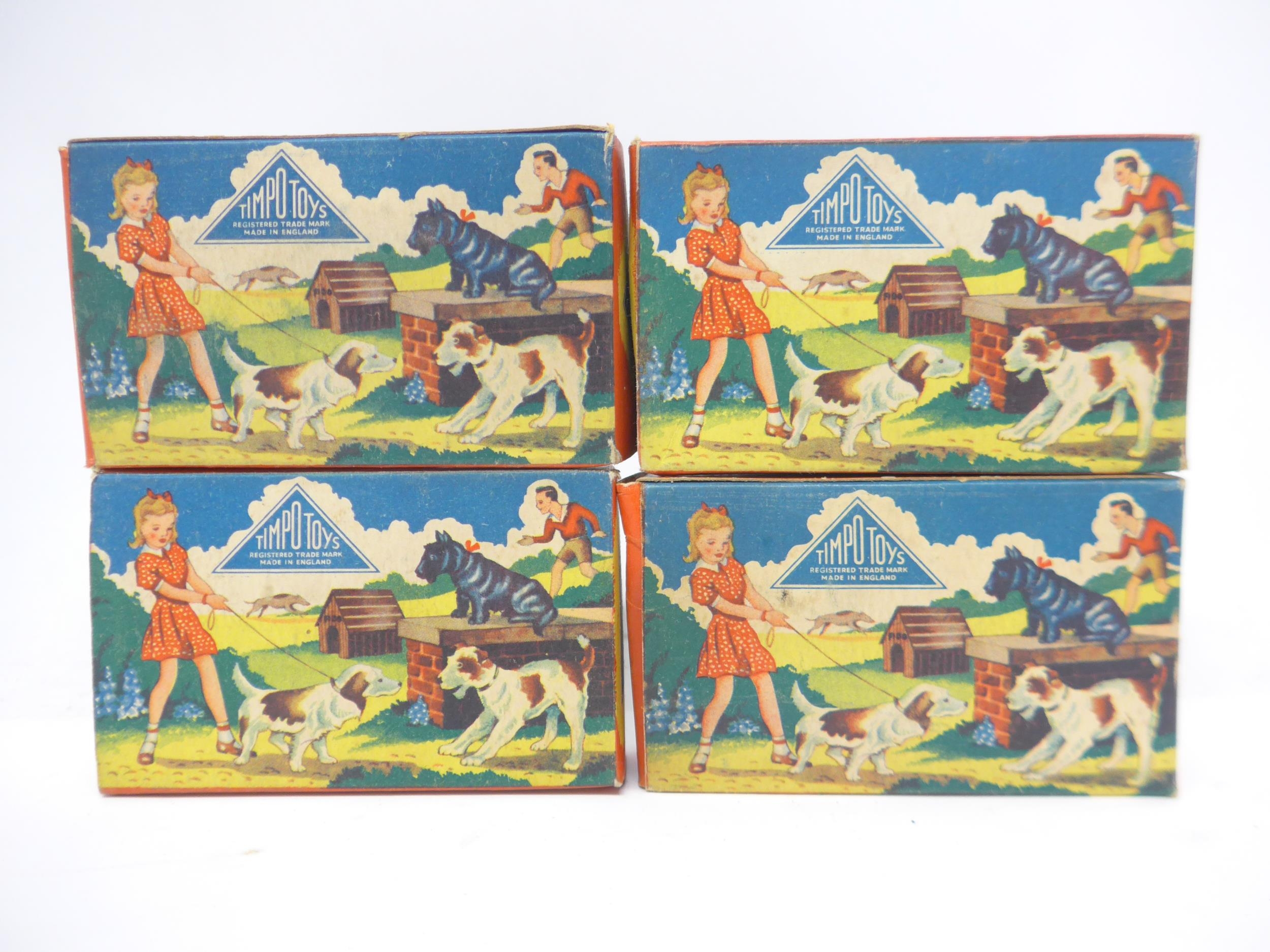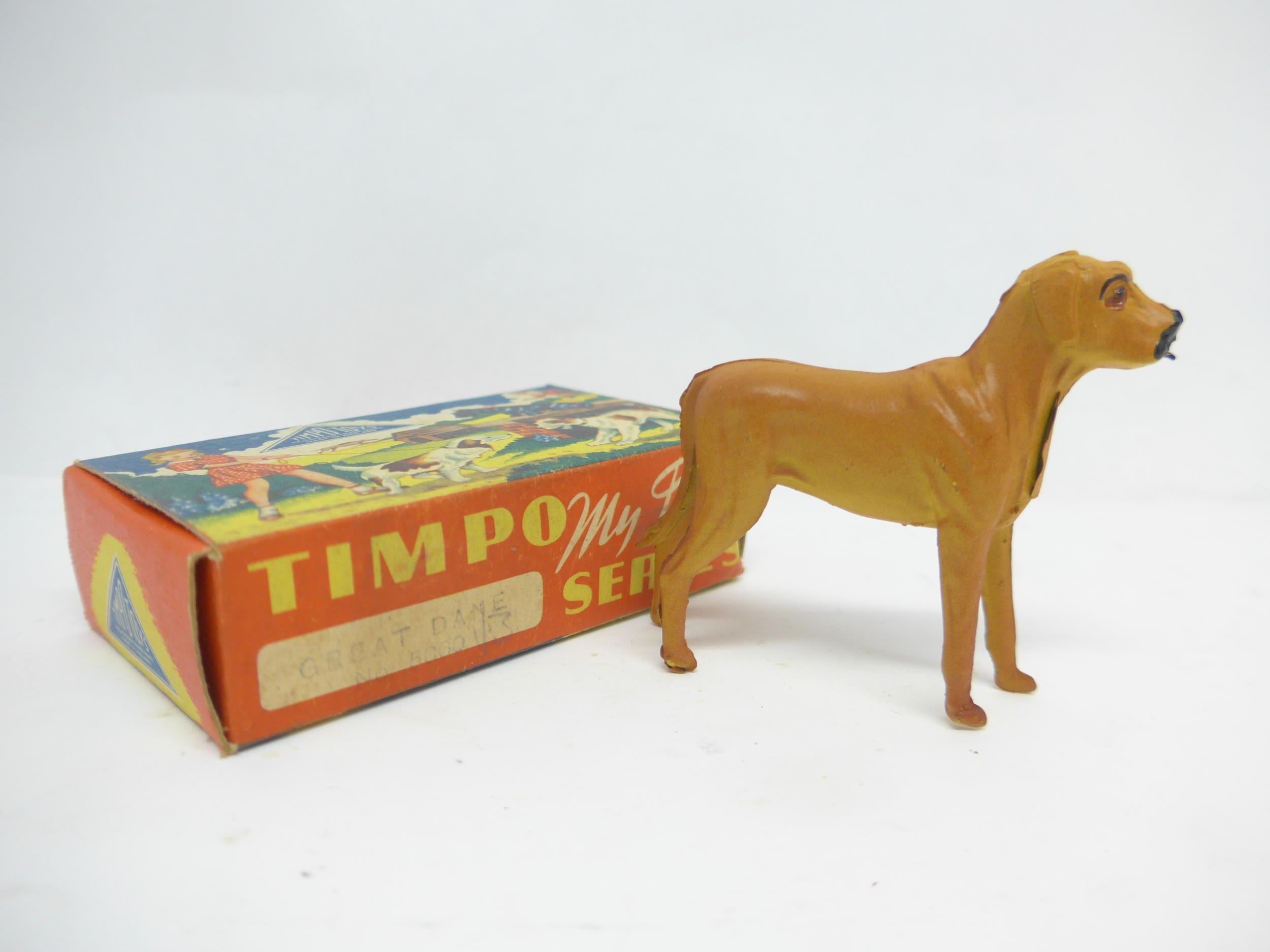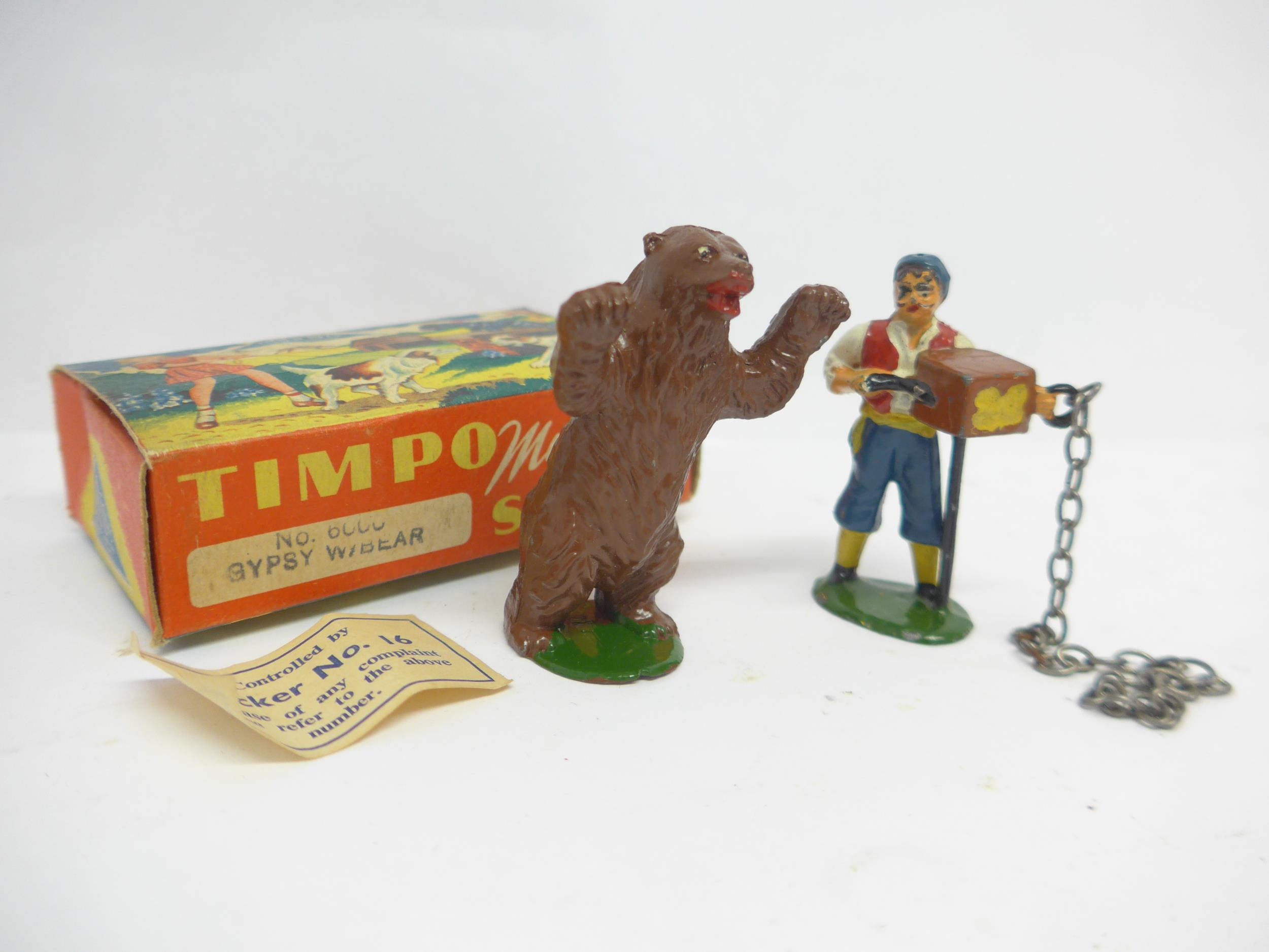 Four Timpo Toys My Pet Series lead figures, comprising no.6000 Gypsy with Bear (x2, one missing Gypsy) and no.5000 Great Dane (x2, one in incorrect 5007 box) (4)