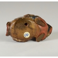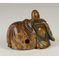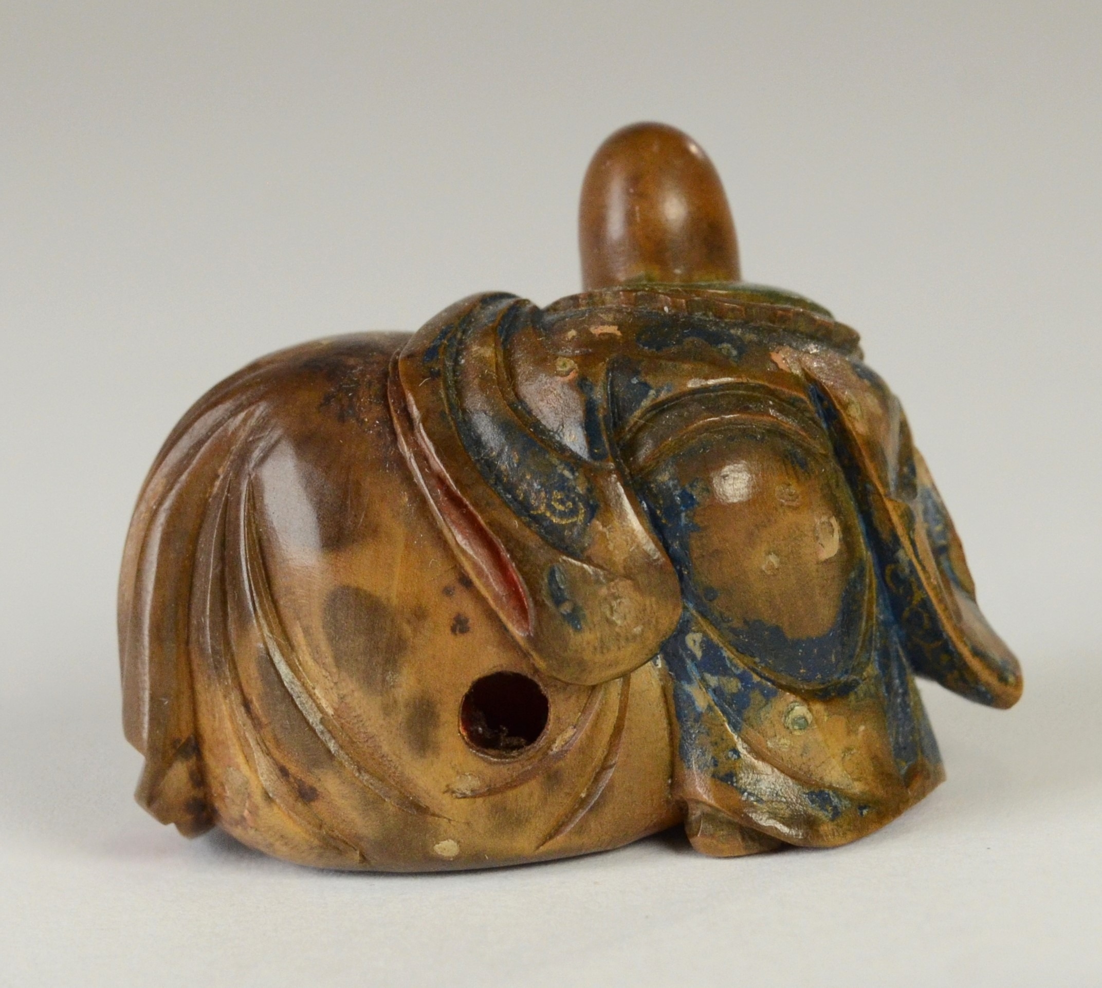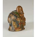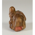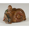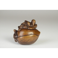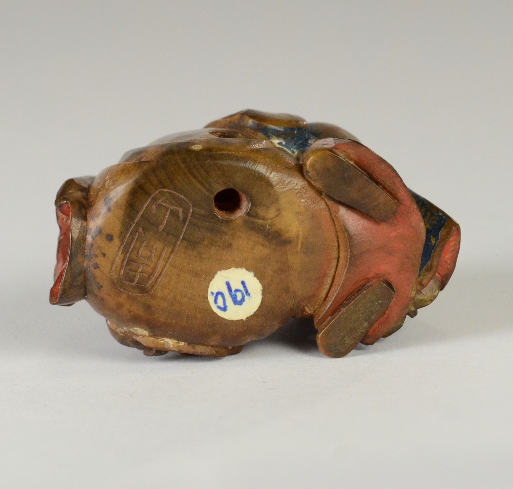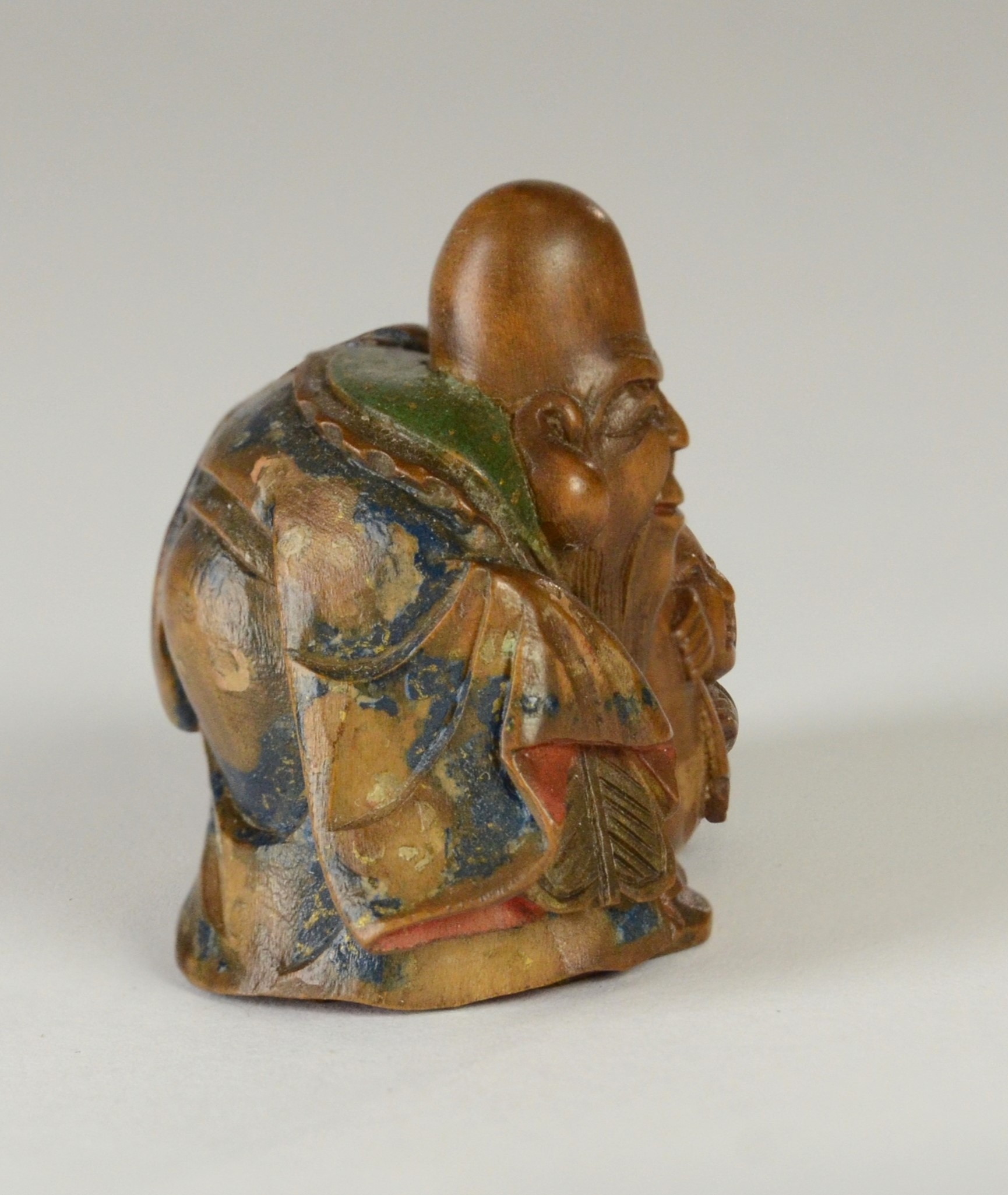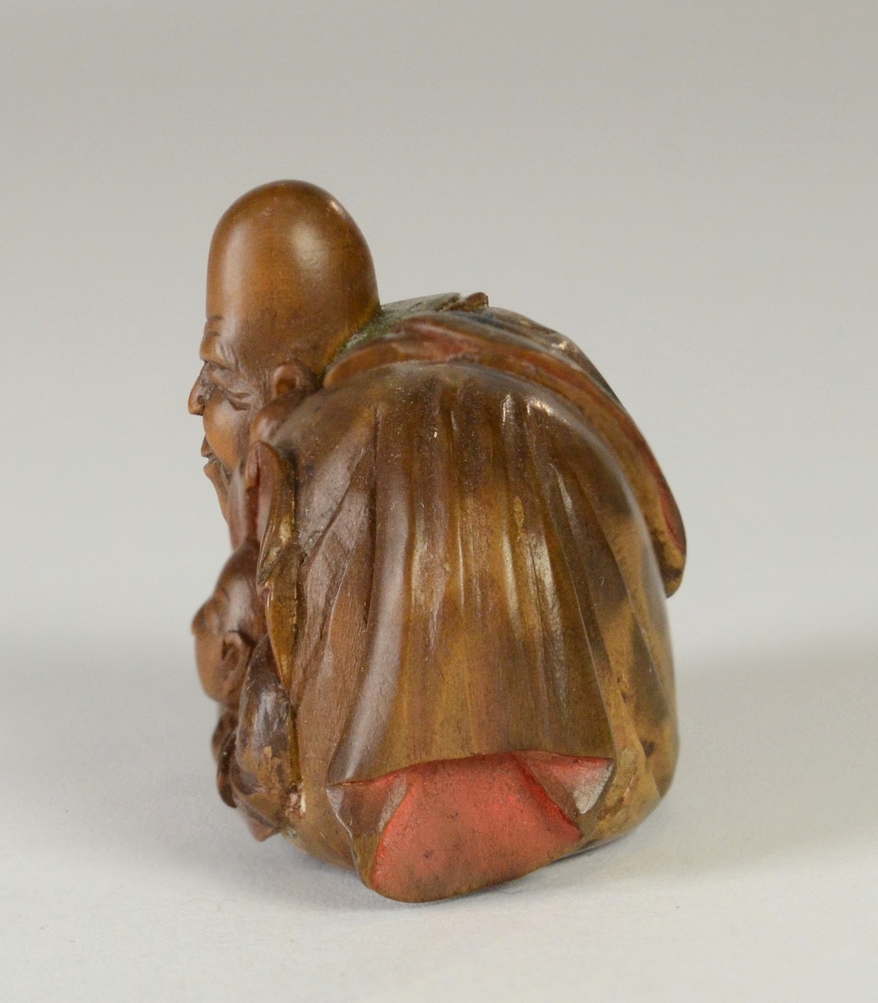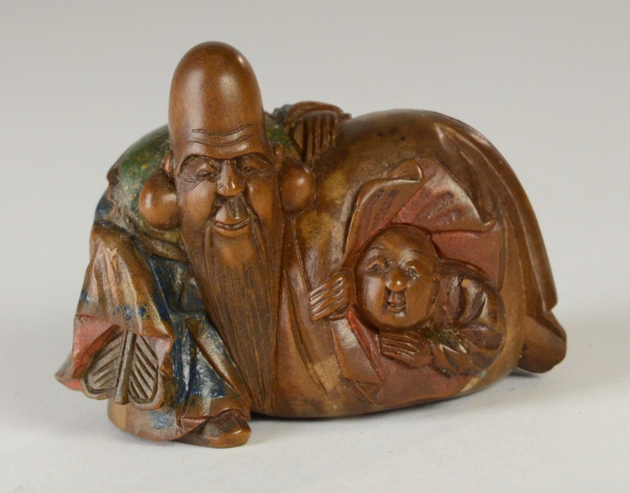 SHUZAN a wooden and partially lacquered netsuke depicting Fukurokuju with Hotei in his bag, signed to base4cm wide, 2.5cm deep and 3.2cm highProvenanceDorothy Ann Stevens Collection no. 190