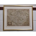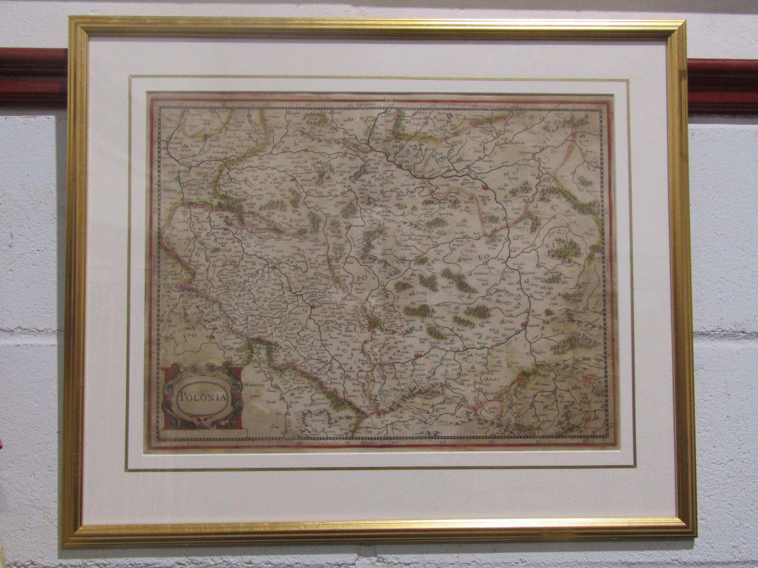 A Mercator engraved hand coloured map of Poland "Polonia" circa 1640, framed and glazed, 35.5cm x 46cm image size