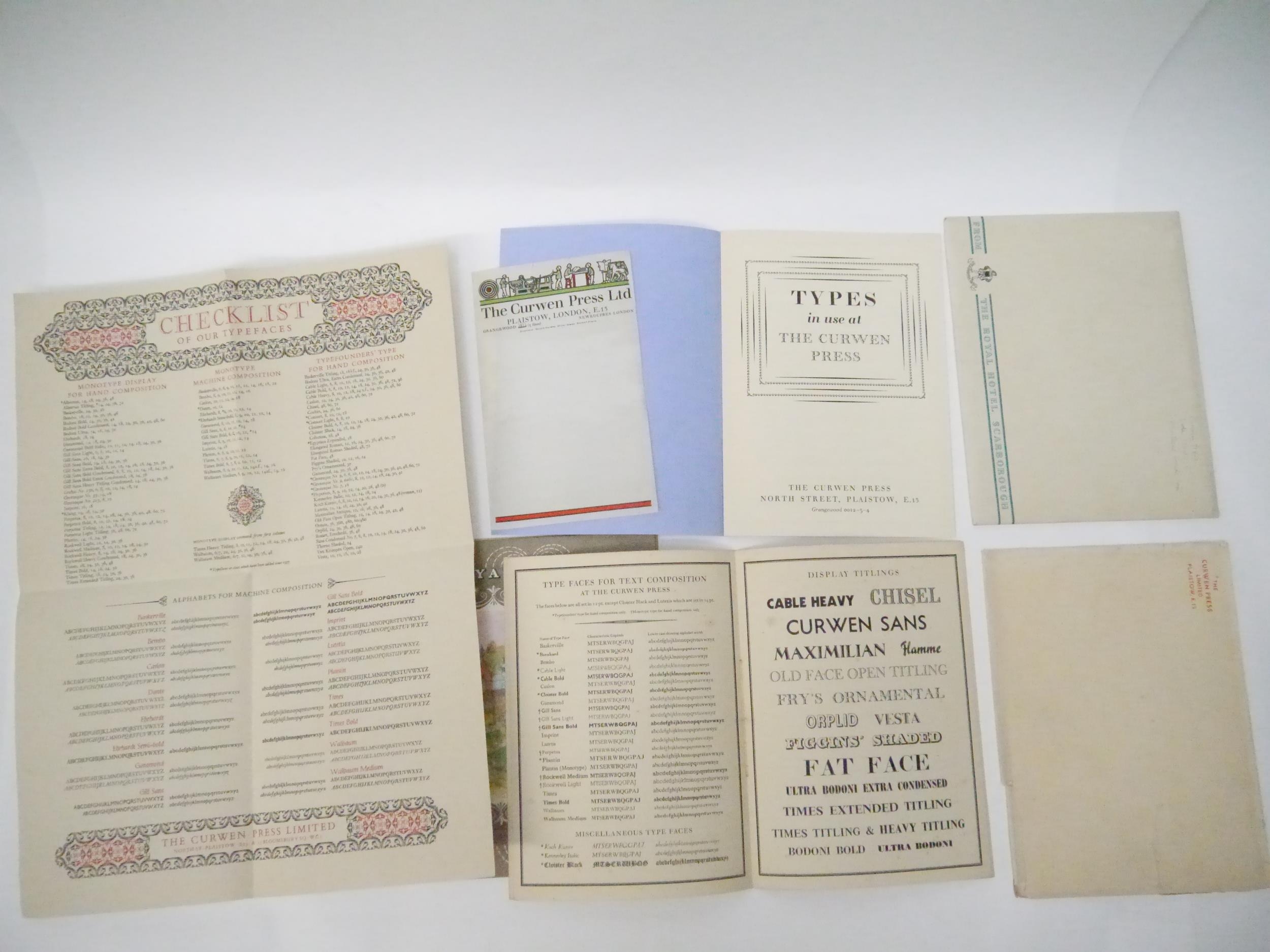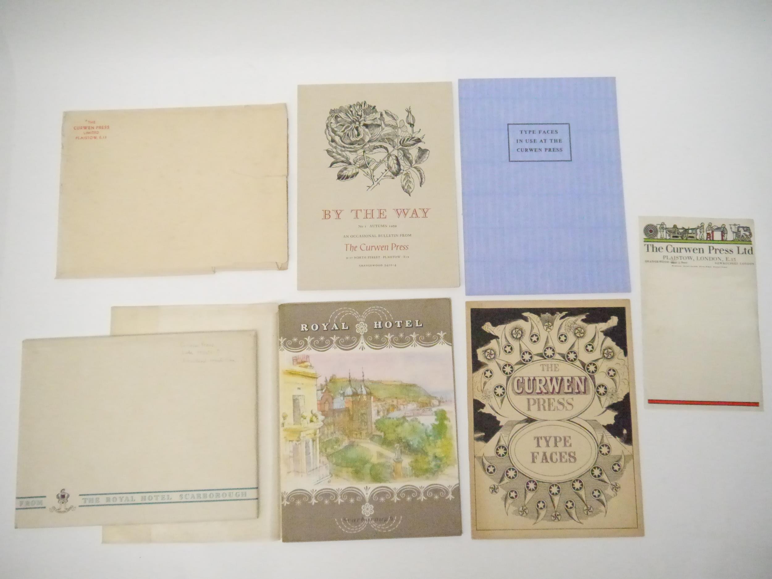 Curwen Press. A collection of five items, comprising 'Royal Hotel Scarborough: The Story of a Family Enterprise', by Tom Laughton, Printed at the Curwen Press, [nd], circa 1955, 1st edition, 20pp booklet, b/w illustrations from photographs, 4to, original pictorial boards, designed and decorated by Laurence Scarfe, original glassine dust wrapper, housed in the original printed envelope; 'The Curwen Press Type Faces, 1941', L, Curwen Press, January 1941, [8]pp (including covers), original stitched printed wraps, top wrap with decorative patterned design by Edward Bawden, housed in the original printed posting envelope; 'Type Faces in Use at the Curwen Press', L, Curwen Press, [nd], [8]pp (including covers], original stitched pale blue printed wraps; 'By The Way, No.1, Autumn 1959, an Occasional Bulletin from the Curwen Press', L, Curwen Press, 1959, signle sheet folded in four, 4to, [8]pp, John Nash vignette illustration to front cover; plus a sheet of unused Curwen Press headed notepaper circa 1960's (5)