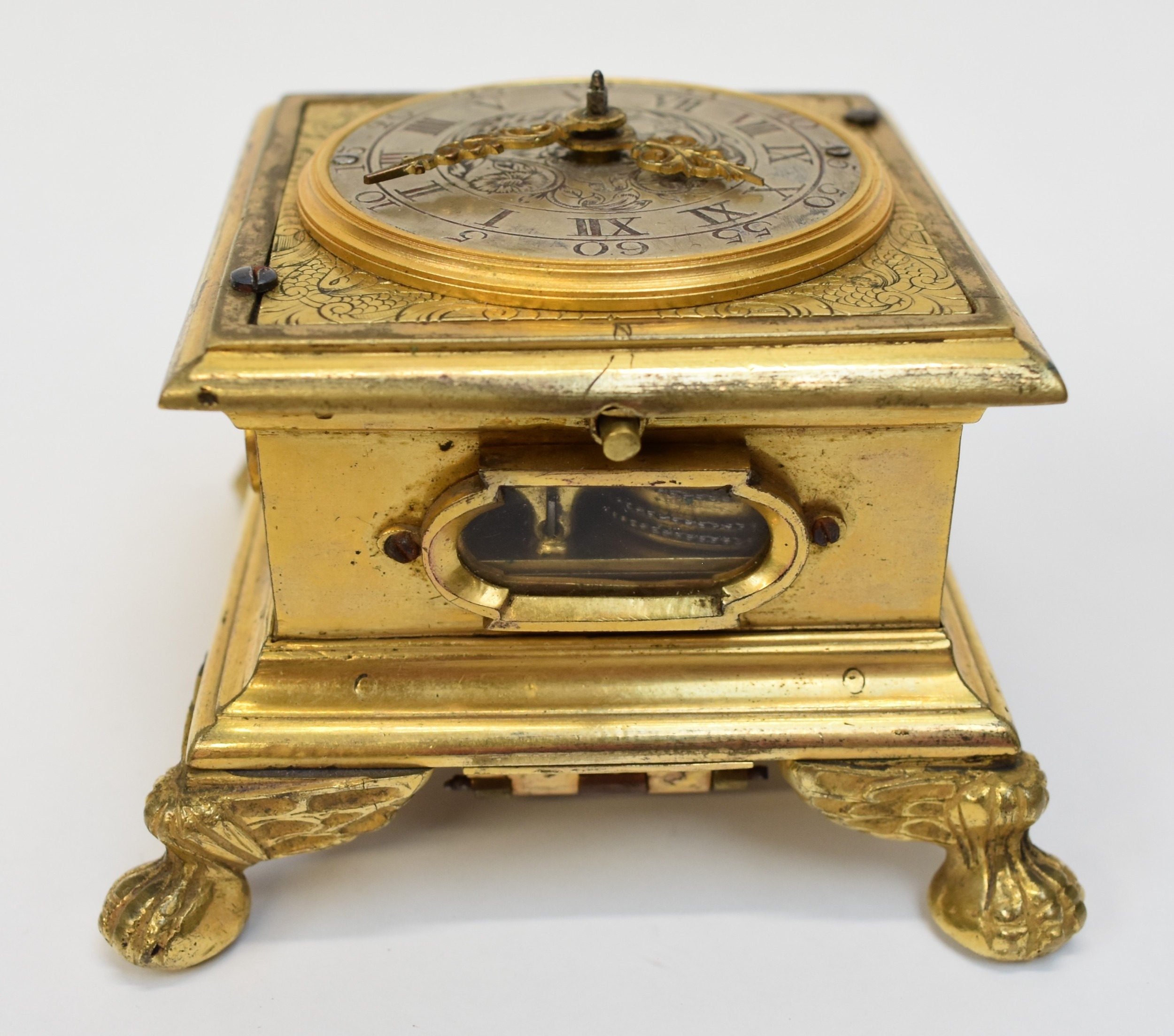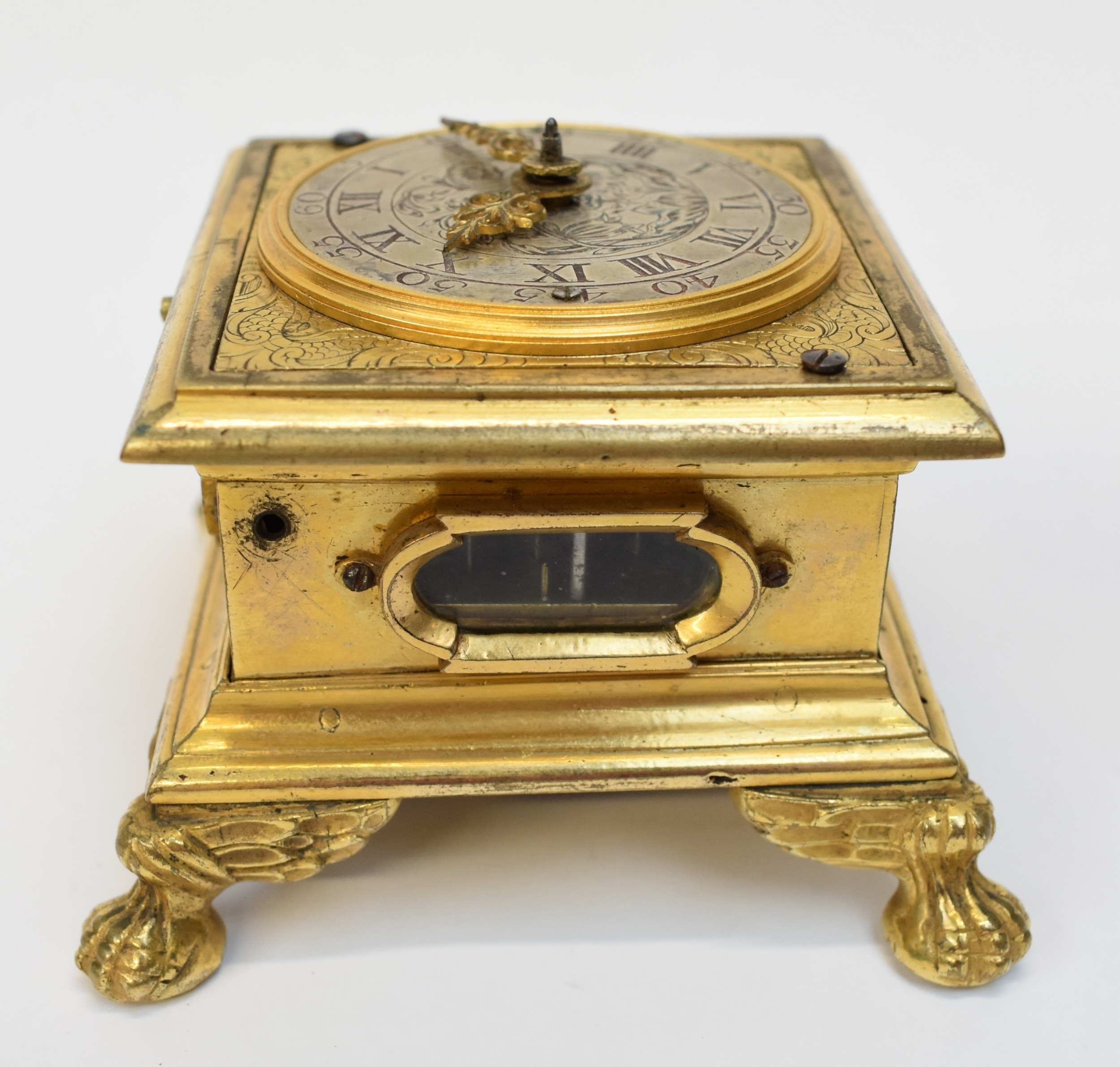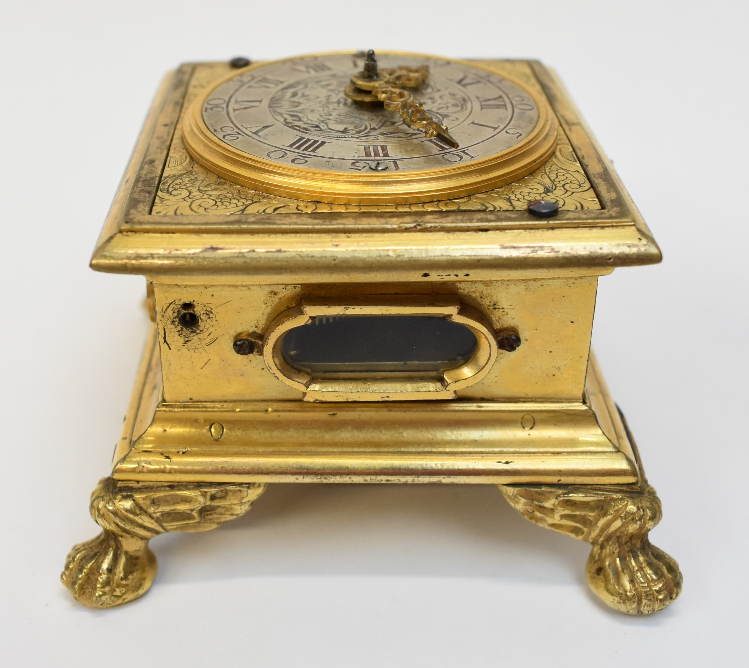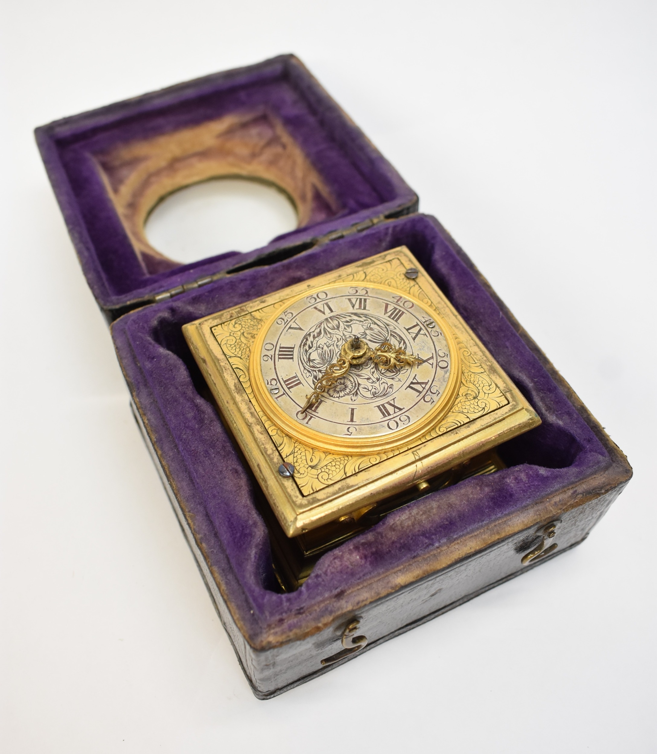 A late 17th / early 18th Century gilt metal Horizontal table clock with repeat and alarm button, square form case on bracket paw and wing form feet, four glass panels showing movement to each side, the top with engraved detailing around the circular silvered dial, the dial with outer Arabic track and inner Roman track, central floral engraved detailing, pierced gilt hands, the underside bell with door showing the pierced and engraved balance cock, the bell striking movement signed N. Reitig (?) of London, fish form hammers, 6.5cm tall x 8.3cm square. The piece is housed within a made to fit black leather case with glass to top for viewing and carry handle, dimensions 8cm tall x 10cm square.
