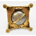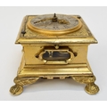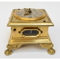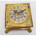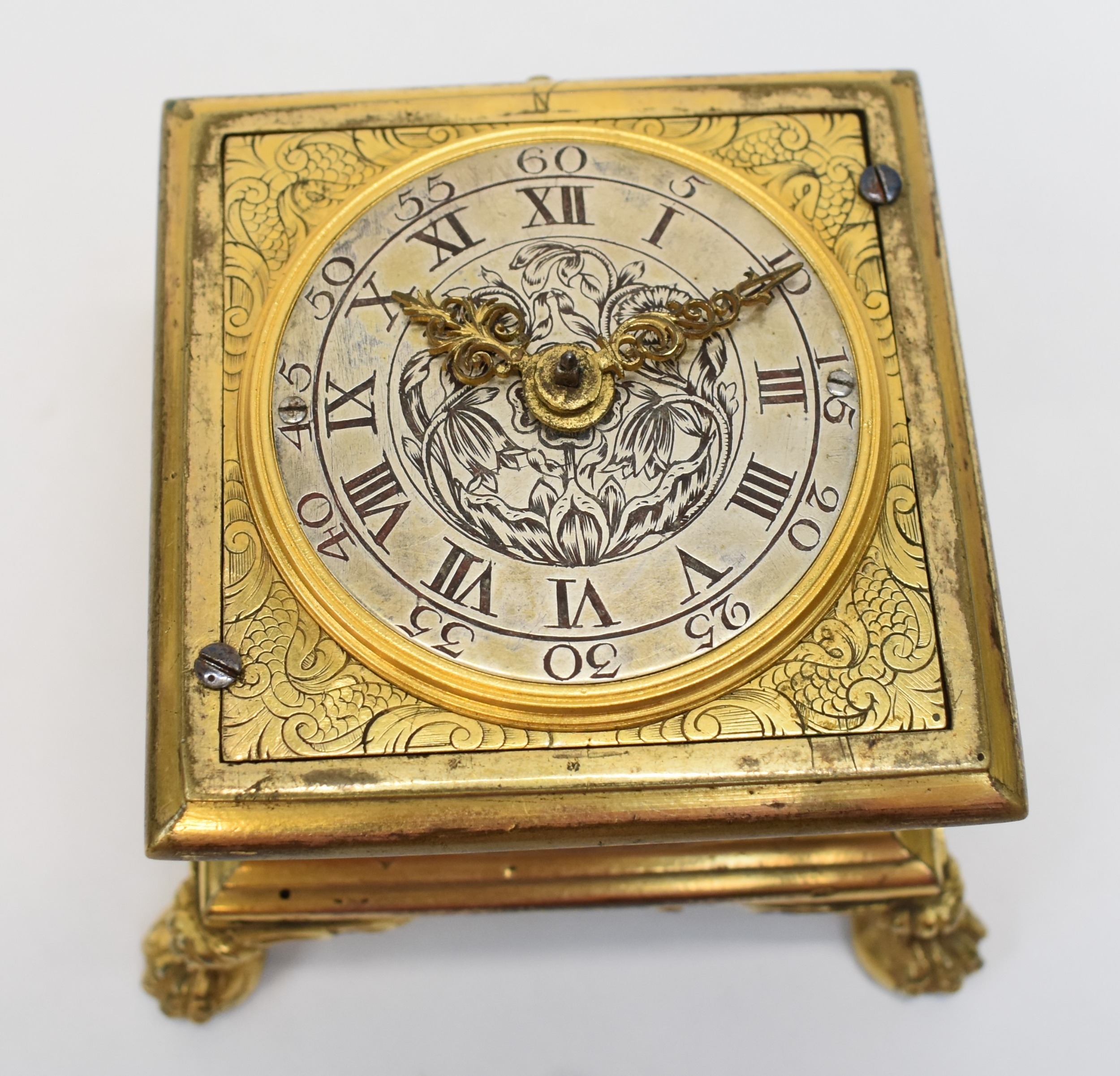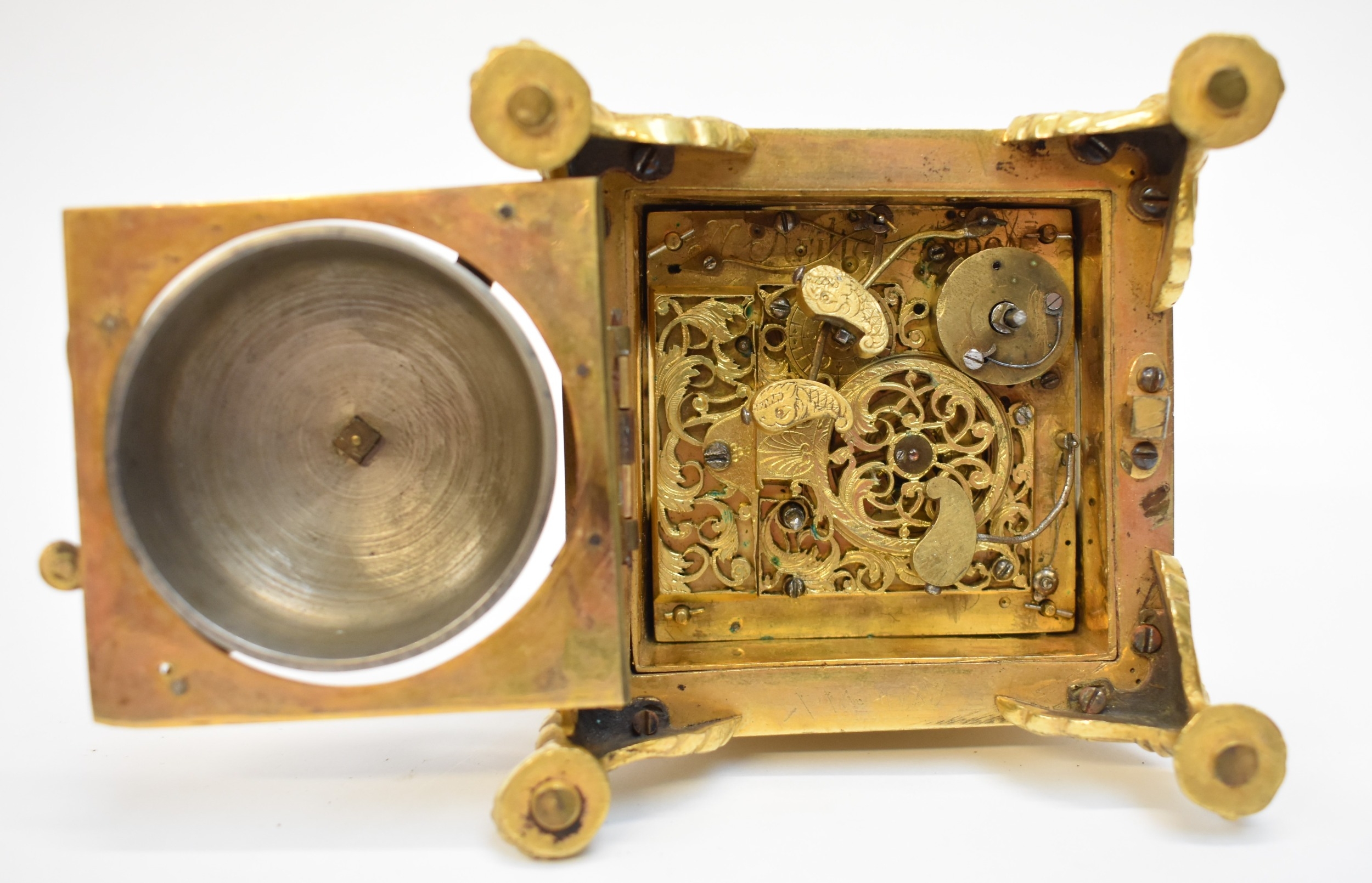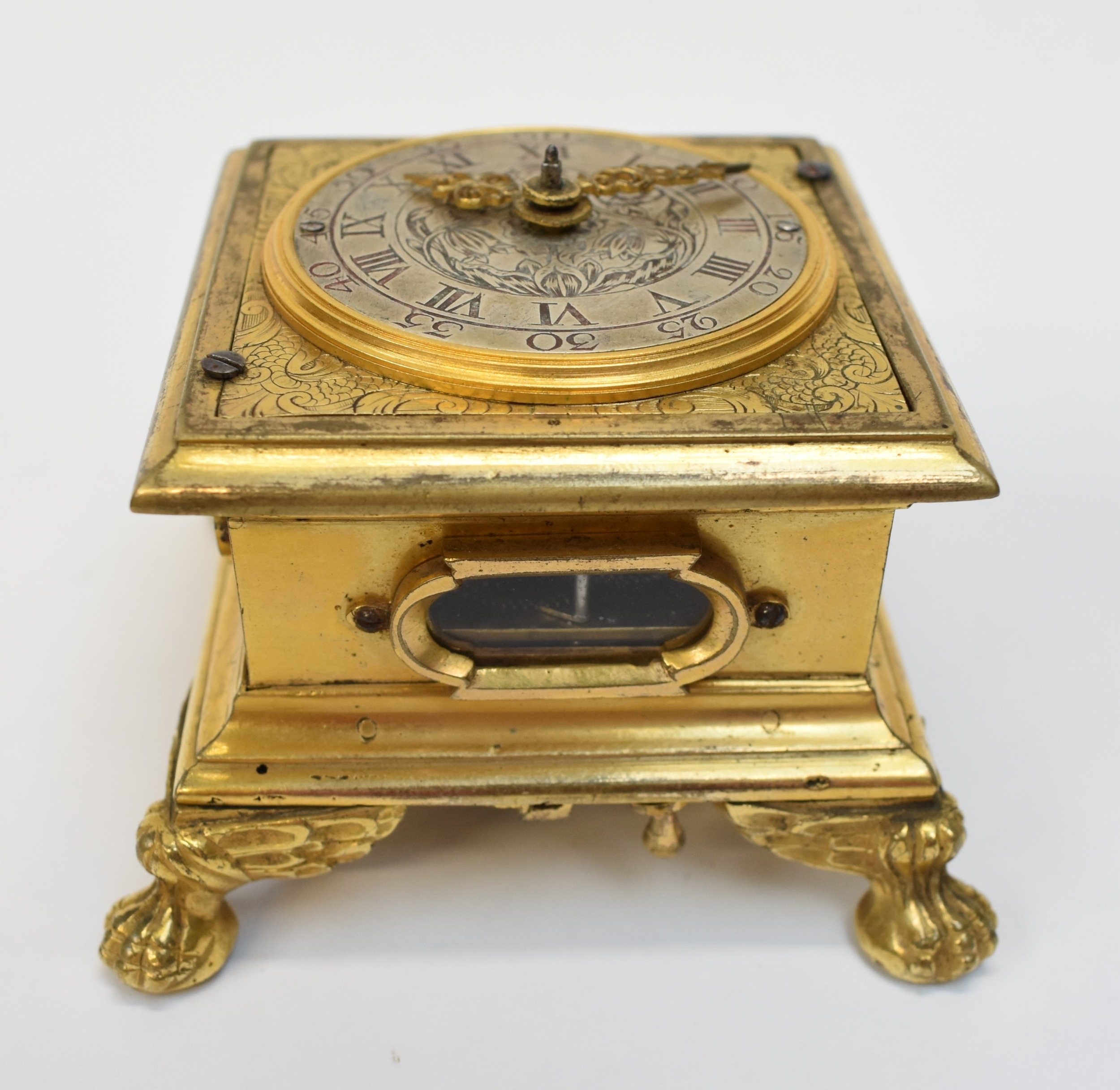 A late 17th / early 18th Century gilt metal Horizontal table clock with repeat and alarm button, square form case on bracket paw and wing form feet, four glass panels showing movement to each side, the top with engraved detailing around the circular silvered dial, the dial with outer Arabic track and inner Roman track, central floral engraved detailing, pierced gilt hands, the underside bell with door showing the pierced and engraved balance cock, the bell striking movement signed N. Reitig (?) of London, fish form hammers, 6.5cm tall x 8.3cm square. The piece is housed within a made to fit black leather case with glass to top for viewing and carry handle, dimensions 8cm tall x 10cm square.