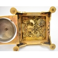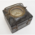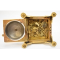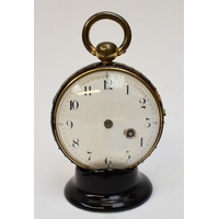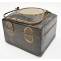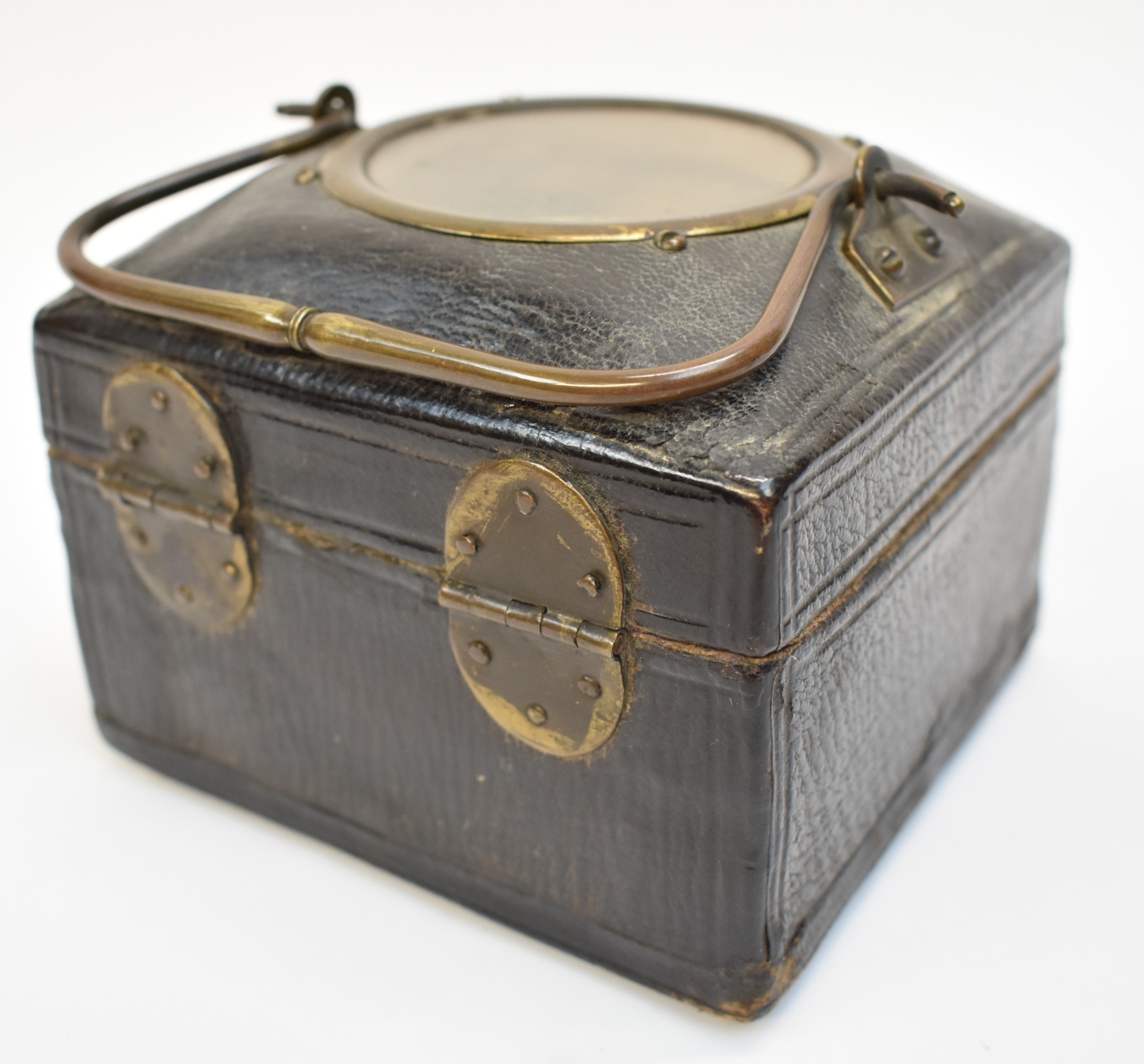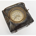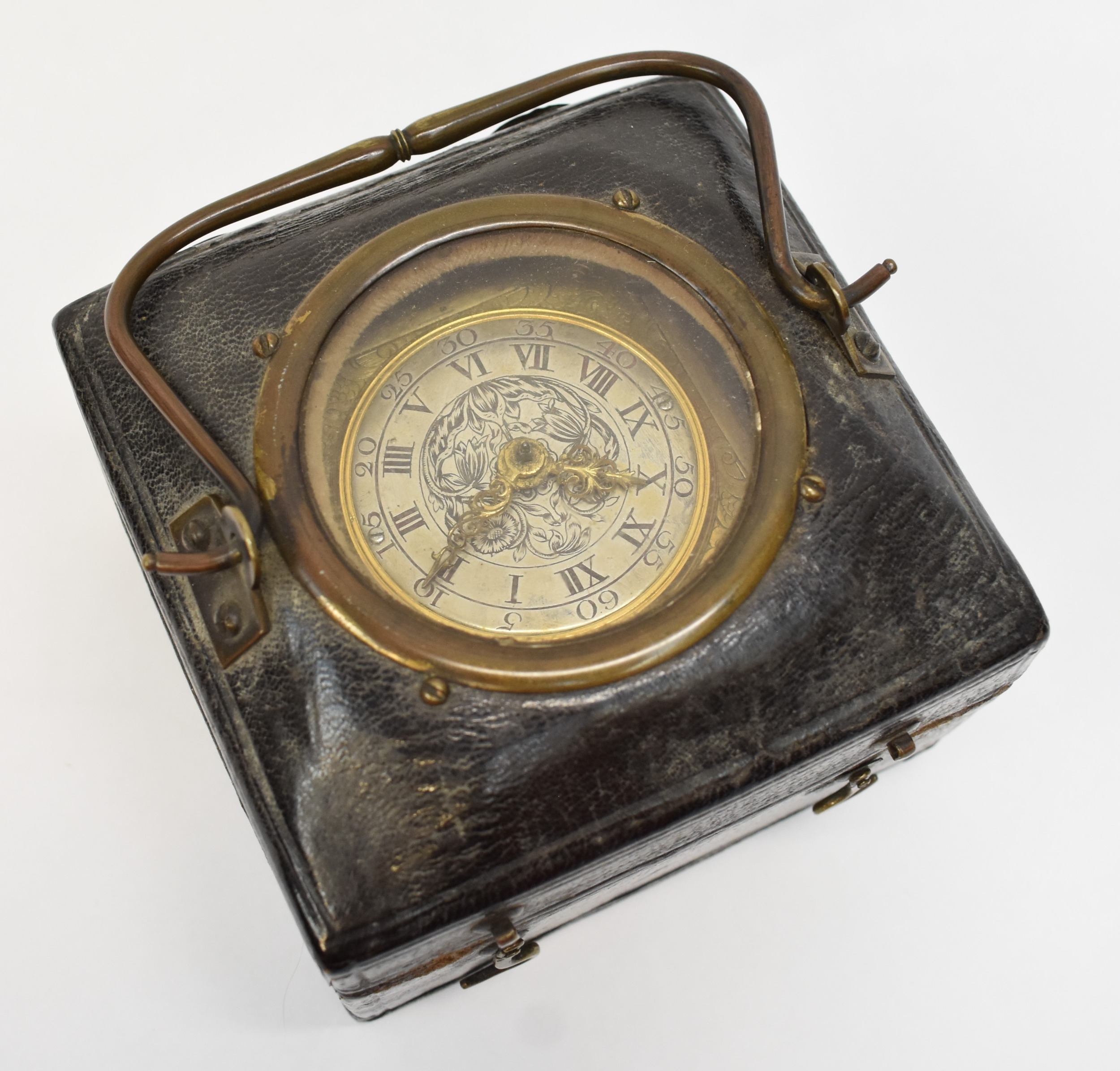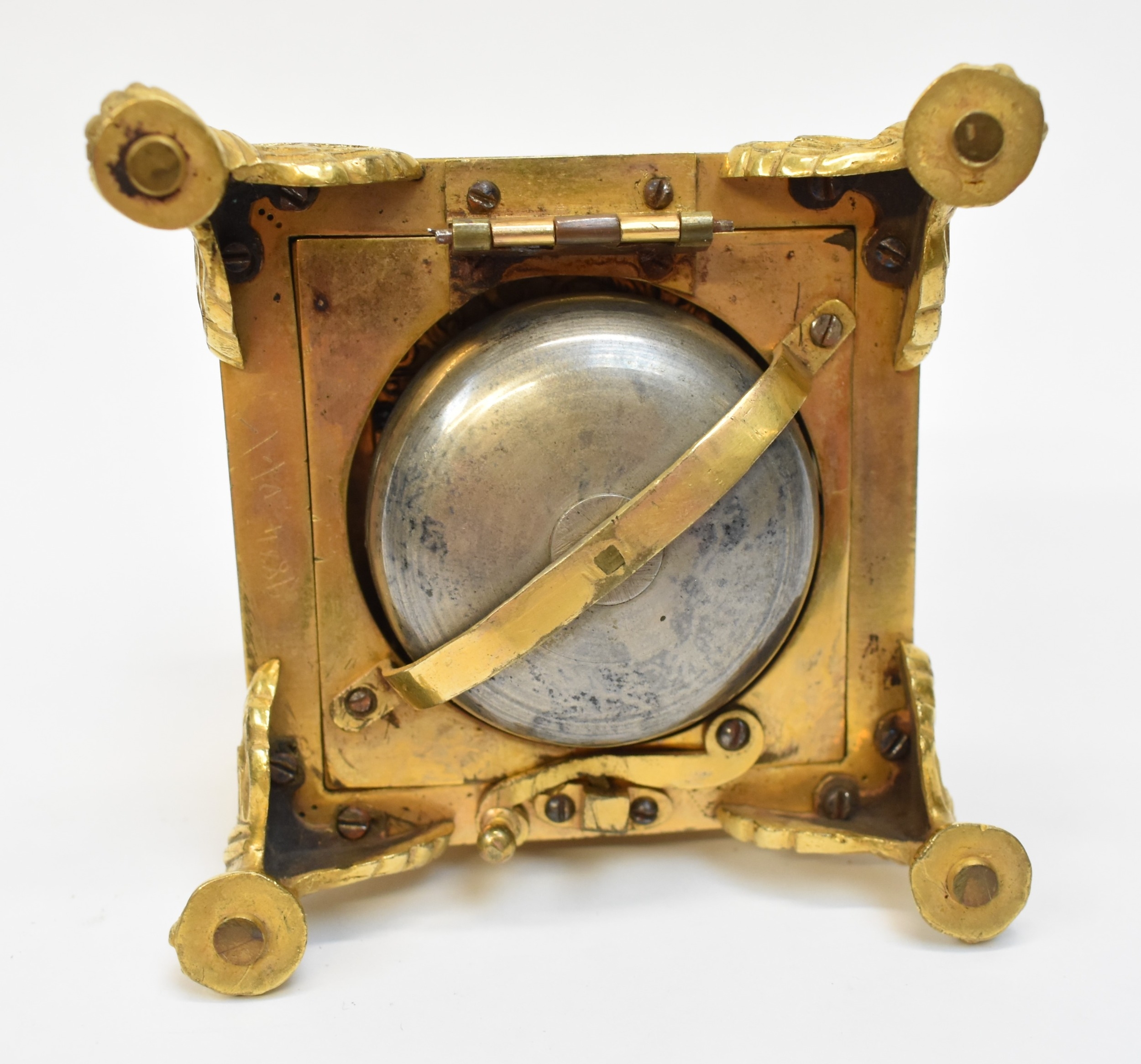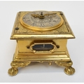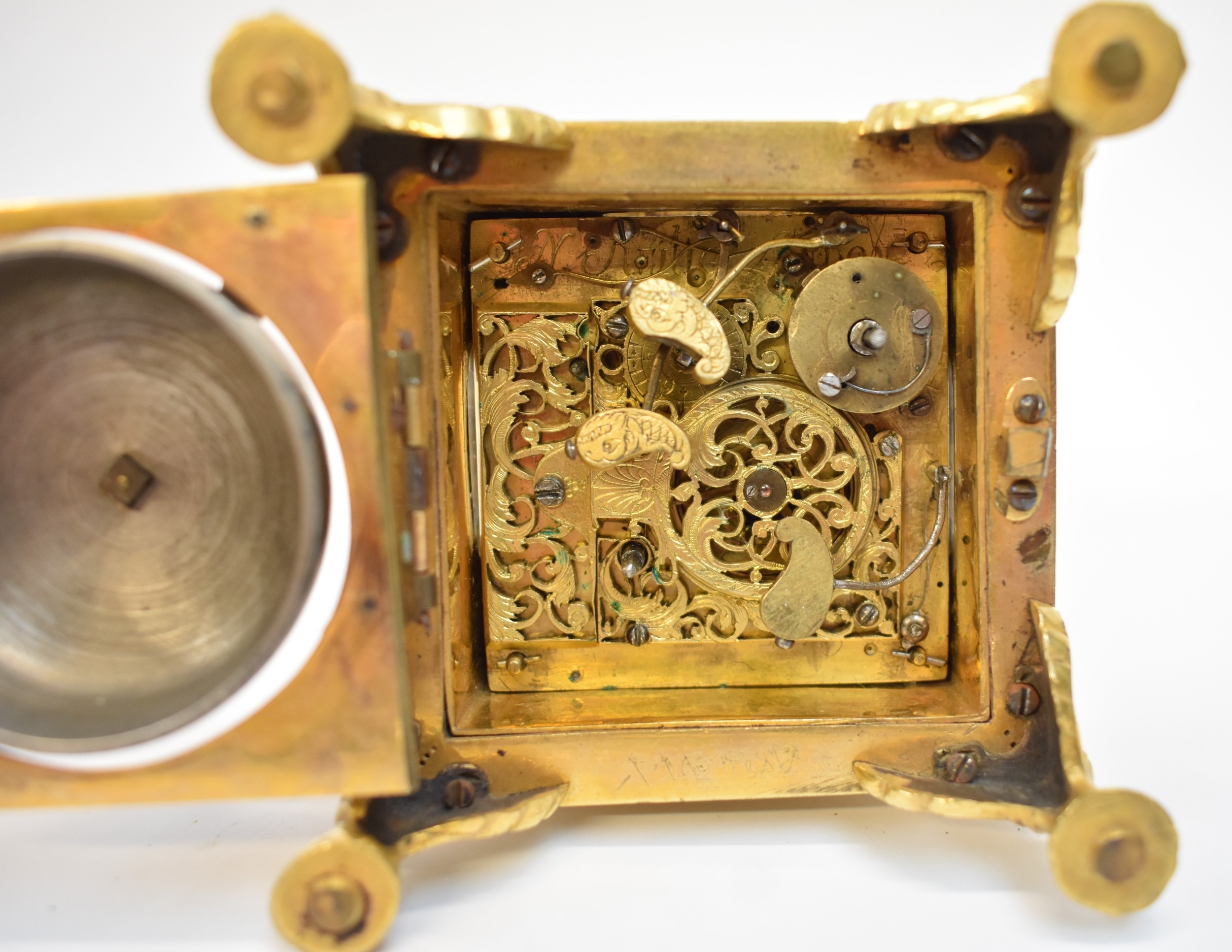 A late 17th / early 18th Century gilt metal Horizontal table clock with repeat and alarm button, square form case on bracket paw and wing form feet, four glass panels showing movement to each side, the top with engraved detailing around the circular silvered dial, the dial with outer Arabic track and inner Roman track, central floral engraved detailing, pierced gilt hands, the underside bell with door showing the pierced and engraved balance cock, the bell striking movement signed N. Reitig (?) of London, fish form hammers, 6.5cm tall x 8.3cm square. The piece is housed within a made to fit black leather case with glass to top for viewing and carry handle, dimensions 8cm tall x 10cm square.