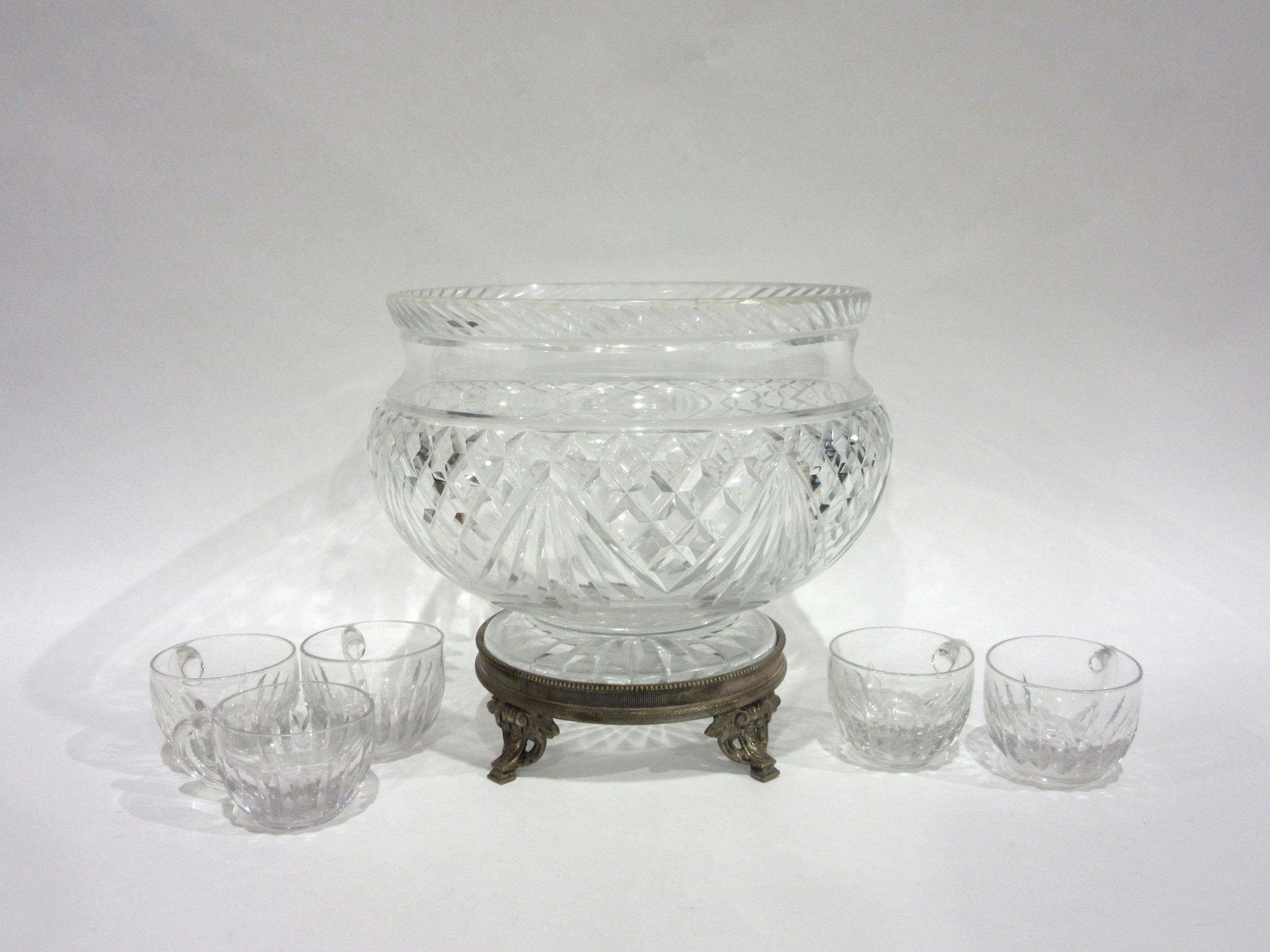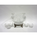 A cut crystal glass table centrepiece/punch bowl raised on footed base, 21cm diameter, together with punch cups