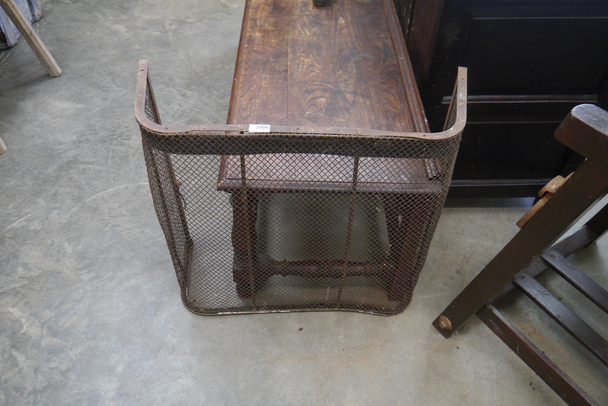 A wrought iron and wire fire screen