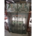 A pair of Art Nouveau copper framed leaded window lights and a smaller panel, some cracks 157x50cm