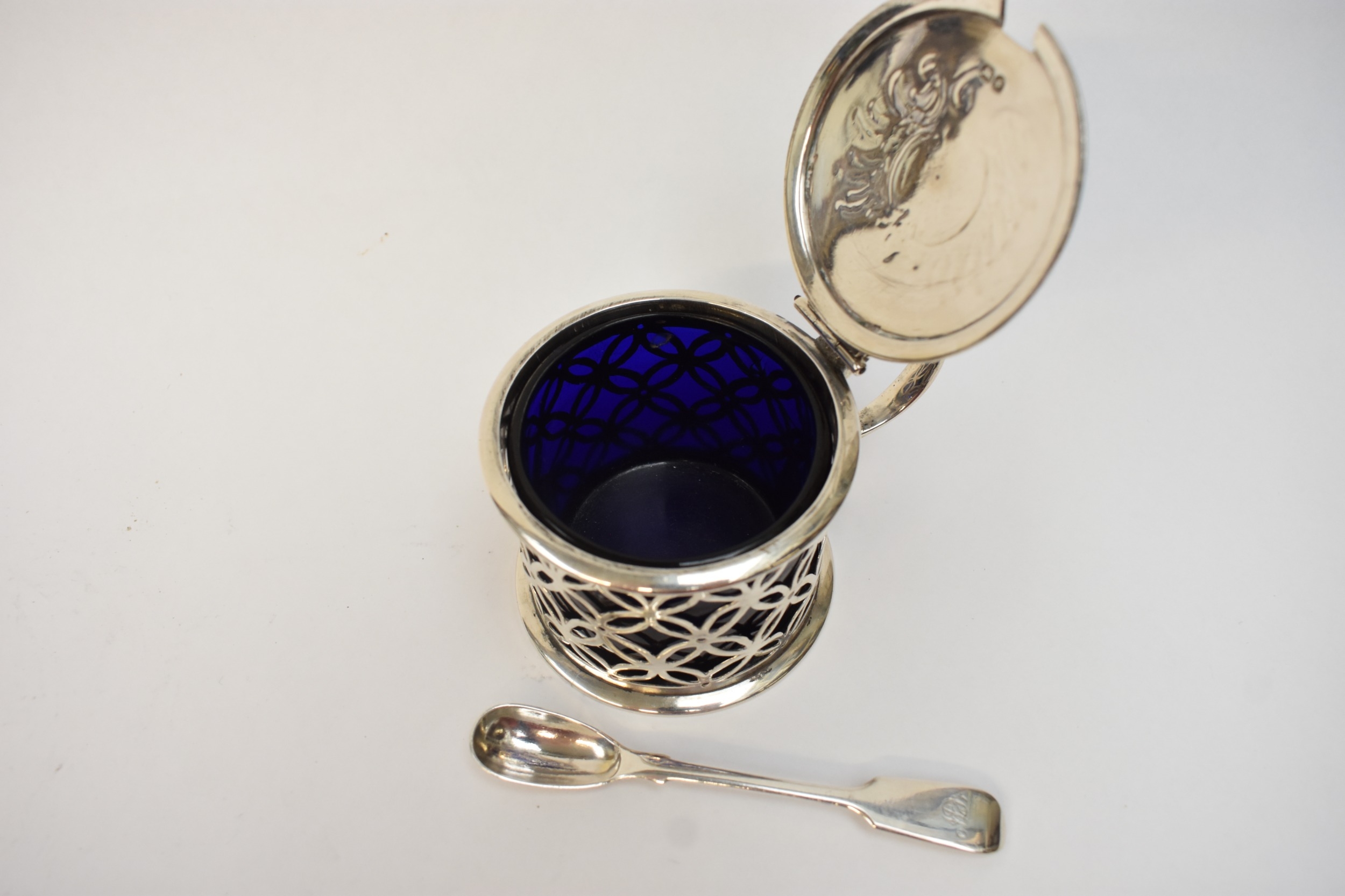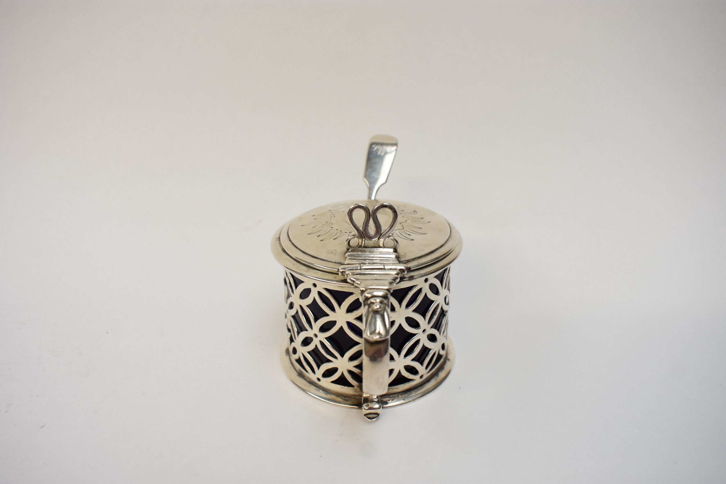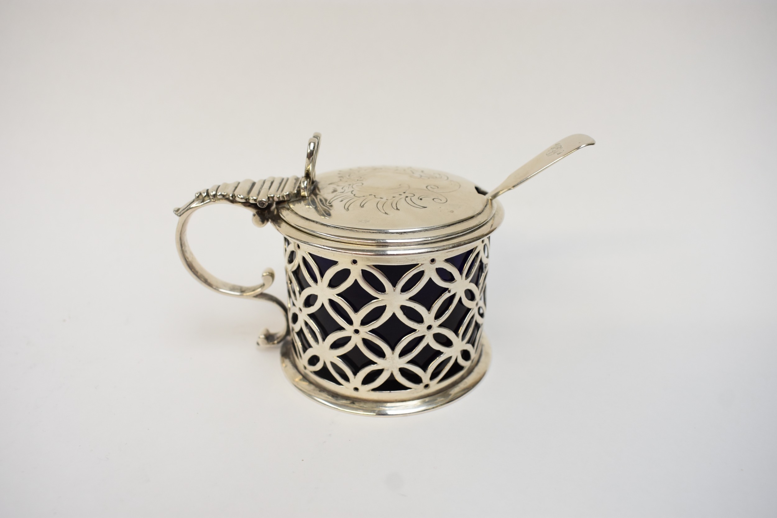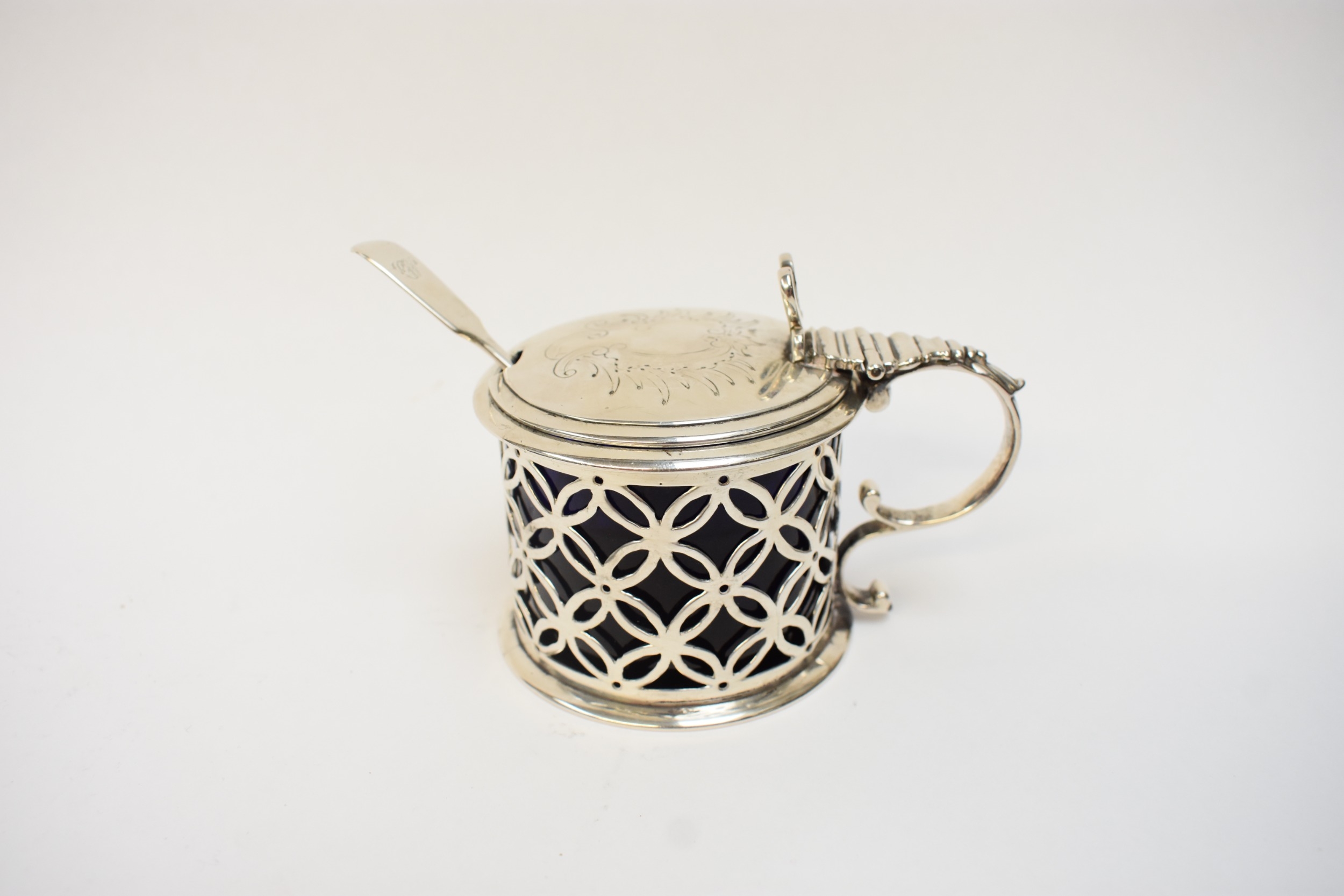 A late William IV/ early Victorian silver drum-shaped mustard pot, with hinged lid, pierced sides and blue glass liner. London 1837. By Edward Farrell. 148g. Together with a Victorian silver "Fiddle" pattern mustard spoon. London 1878. By Chauner & Co (George William Adams) (2)