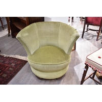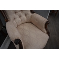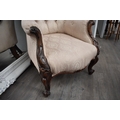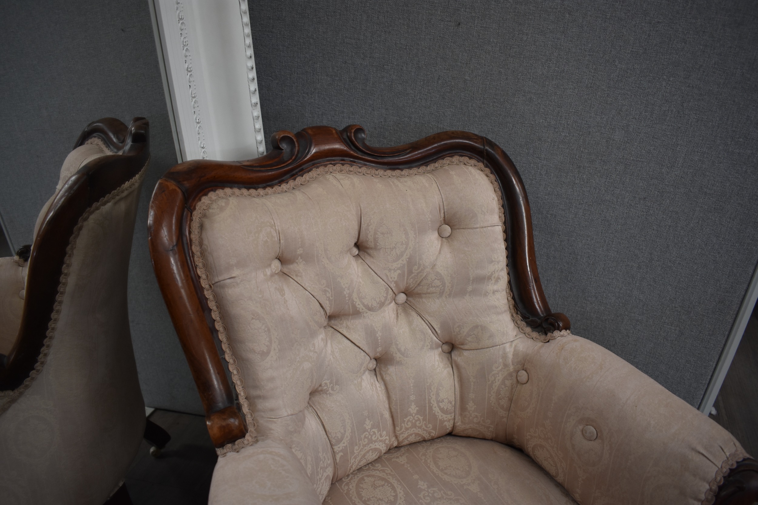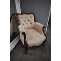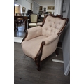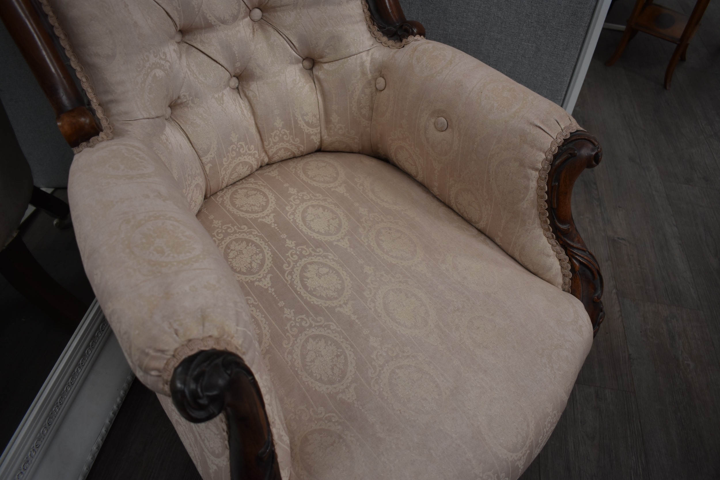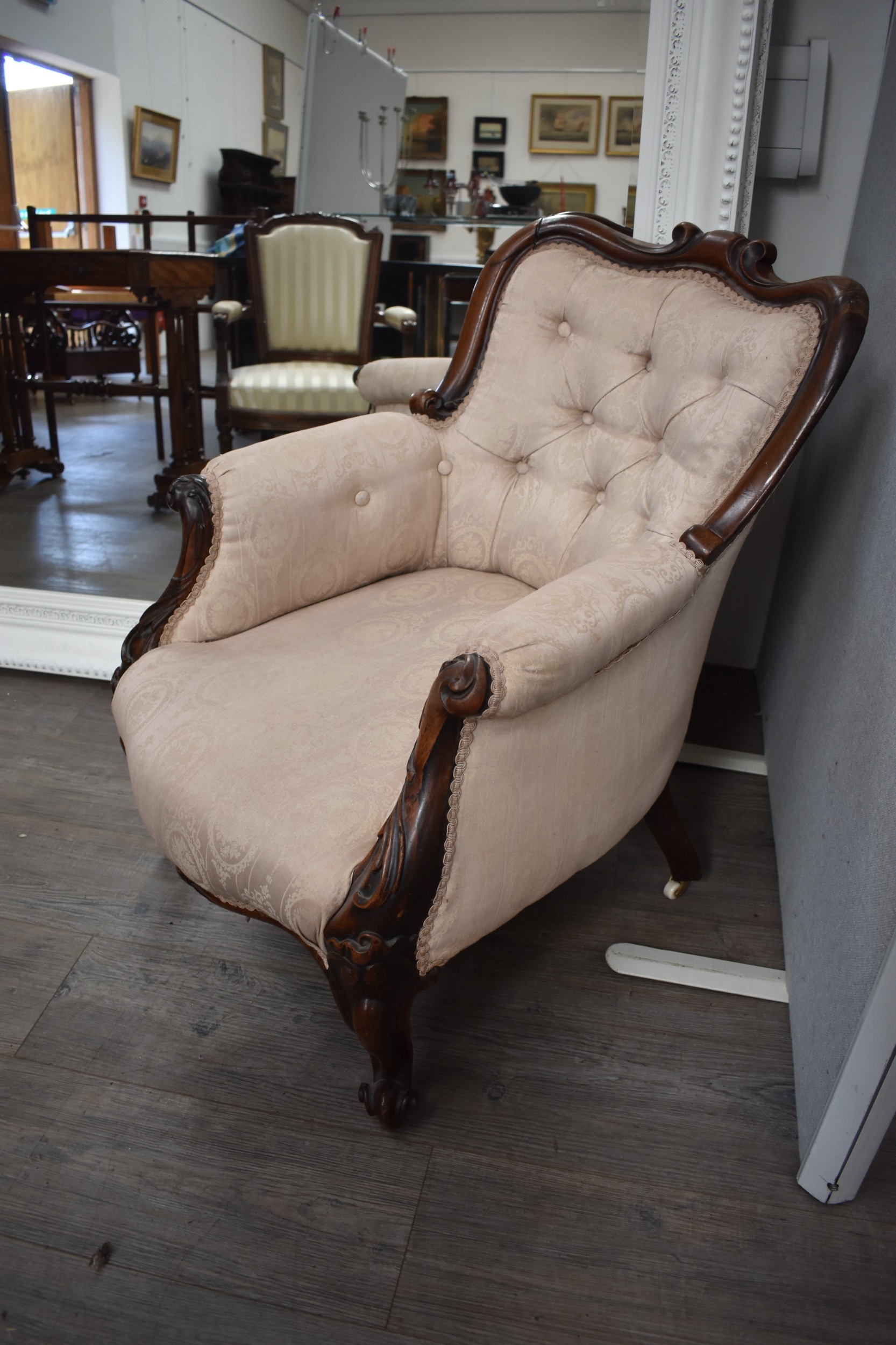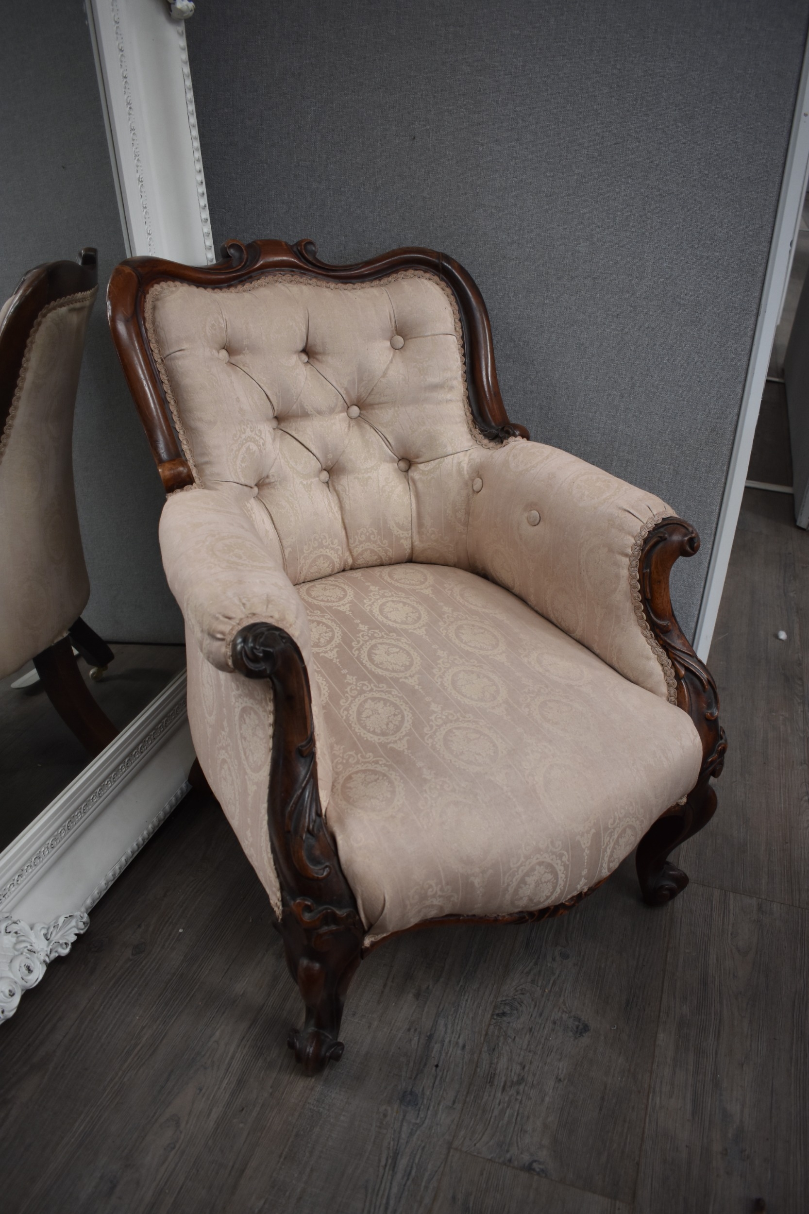 An early-mid 19th century rosewood ladies button back armchair, the shaped scroll back leading to acanthus scroll arms to cabriole legs, silk patterned upholstery, 79.5cm tall x 61cm wide x 75cm deep