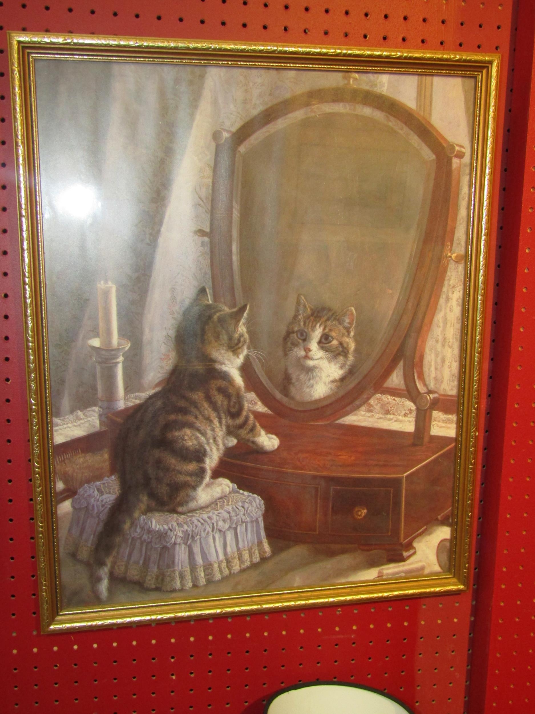 A Victorian print of a kitten looking in a mirror, framed and glazed, 50cm x 40cm image size