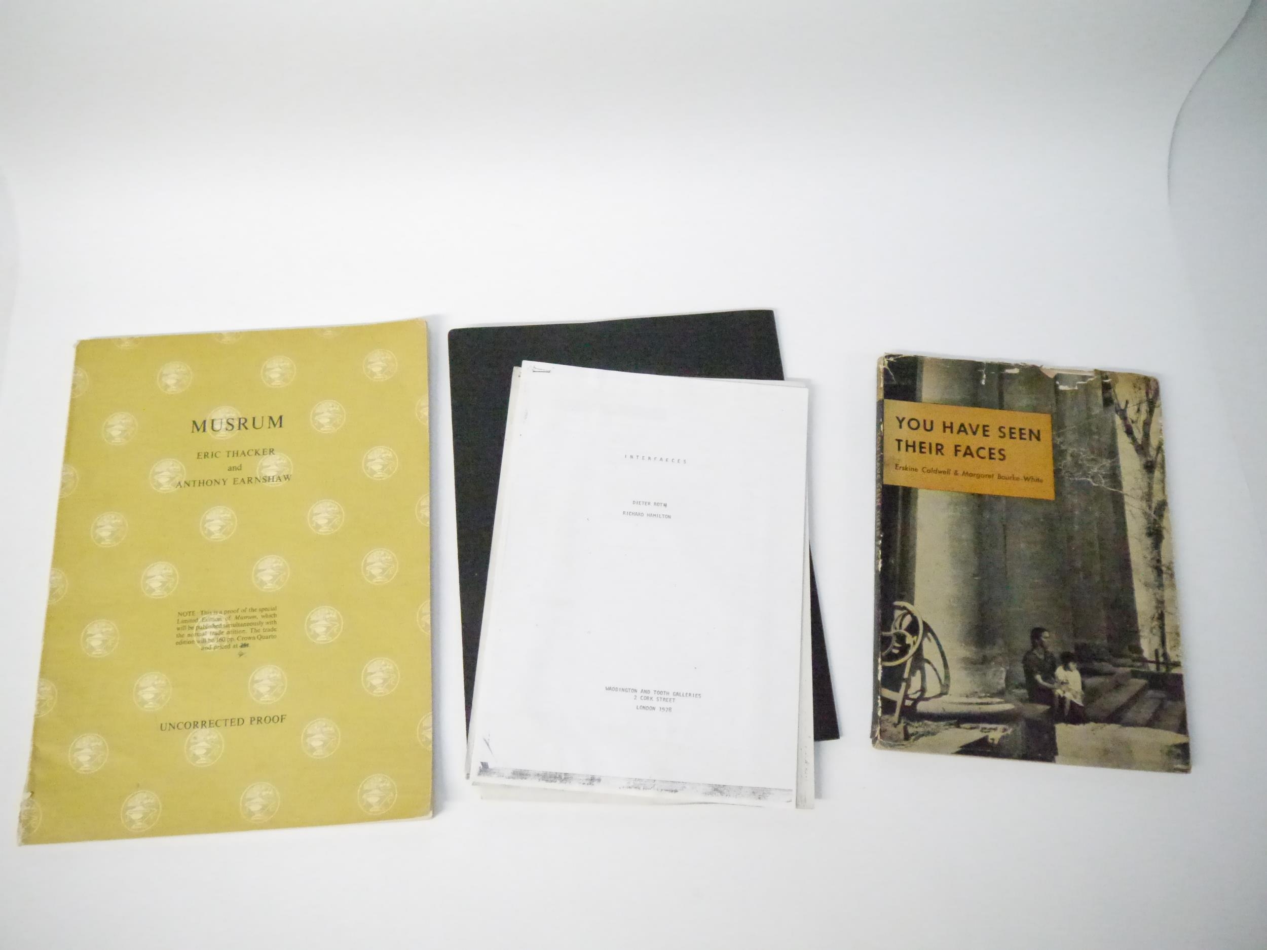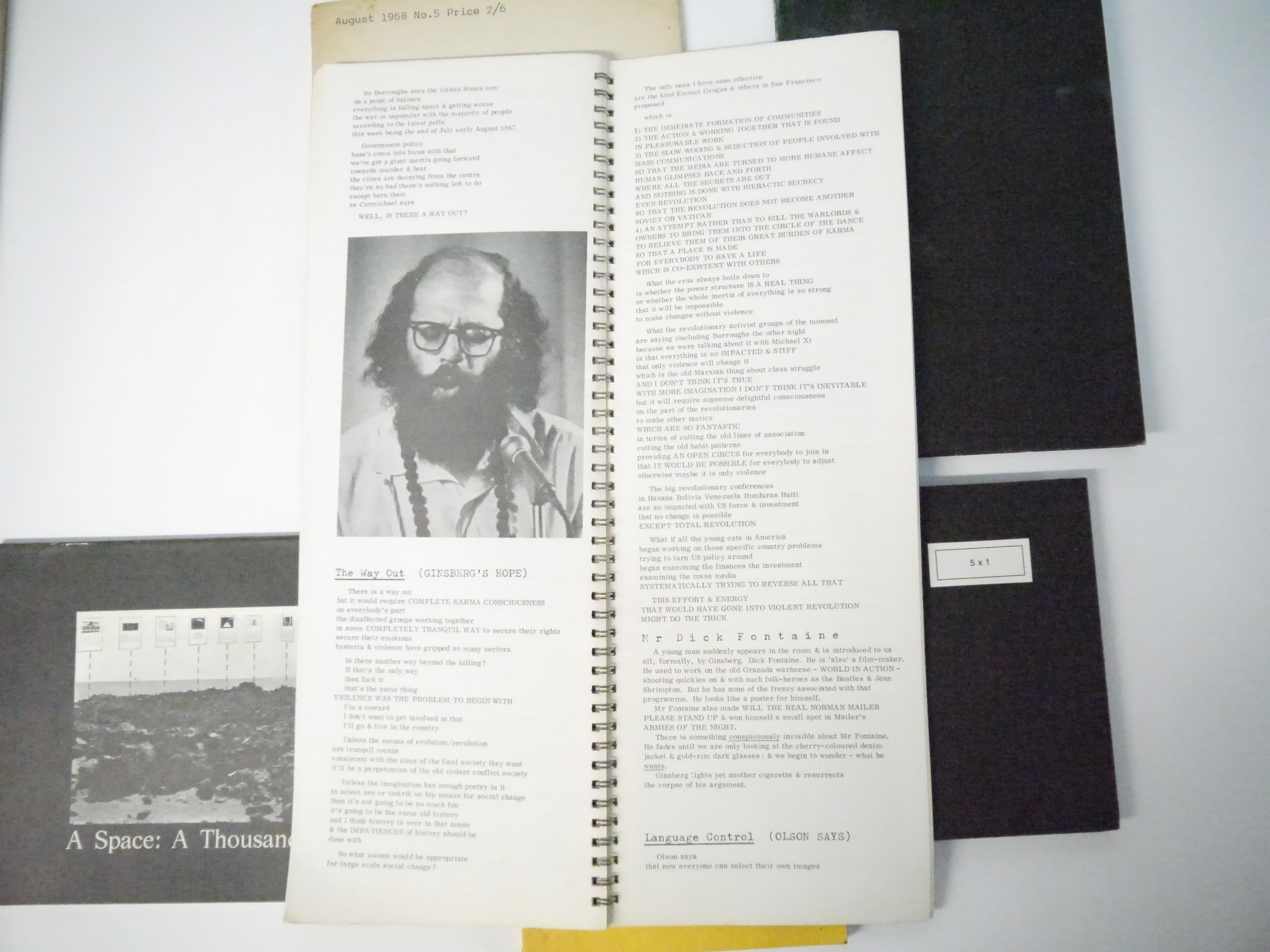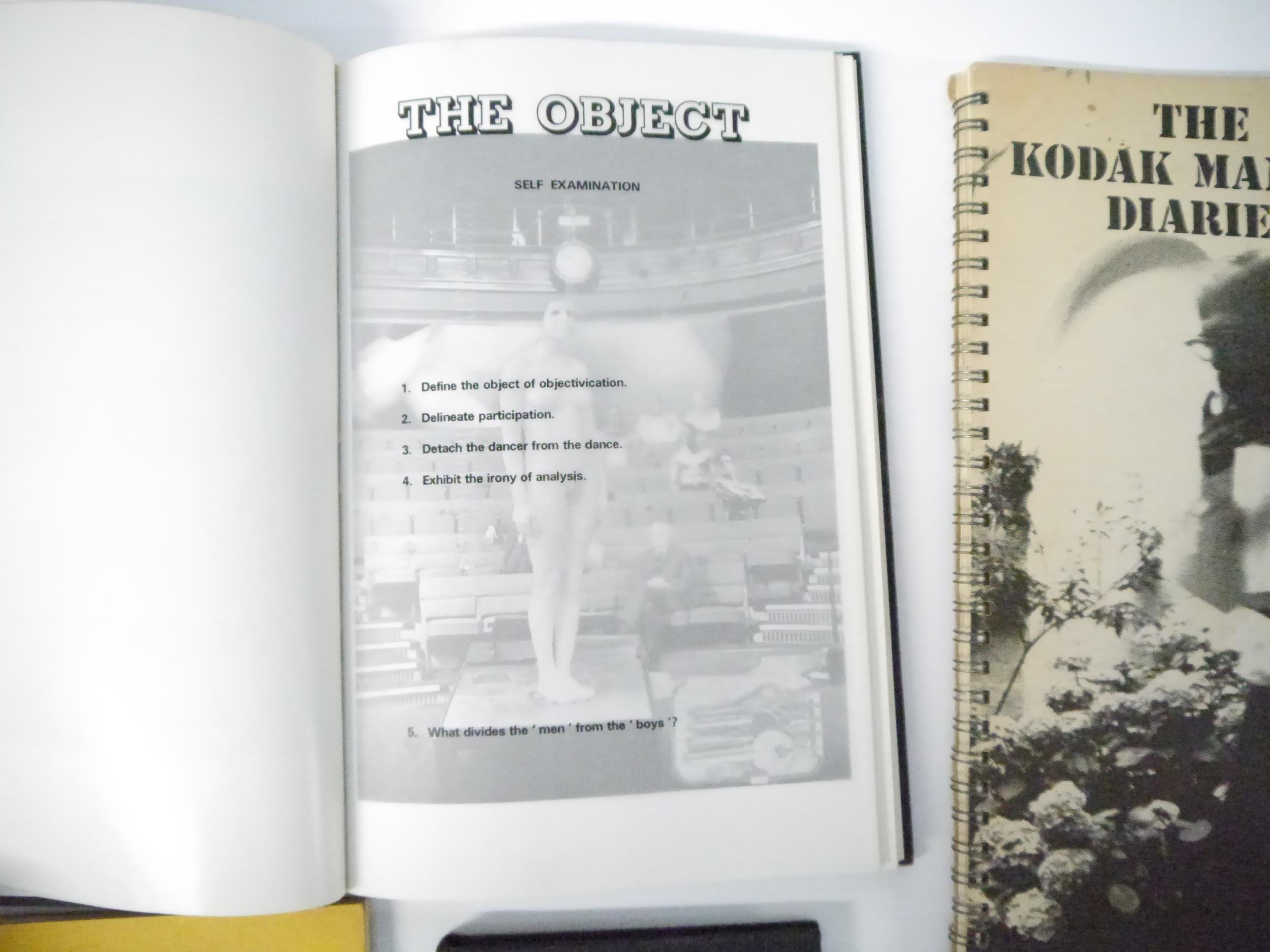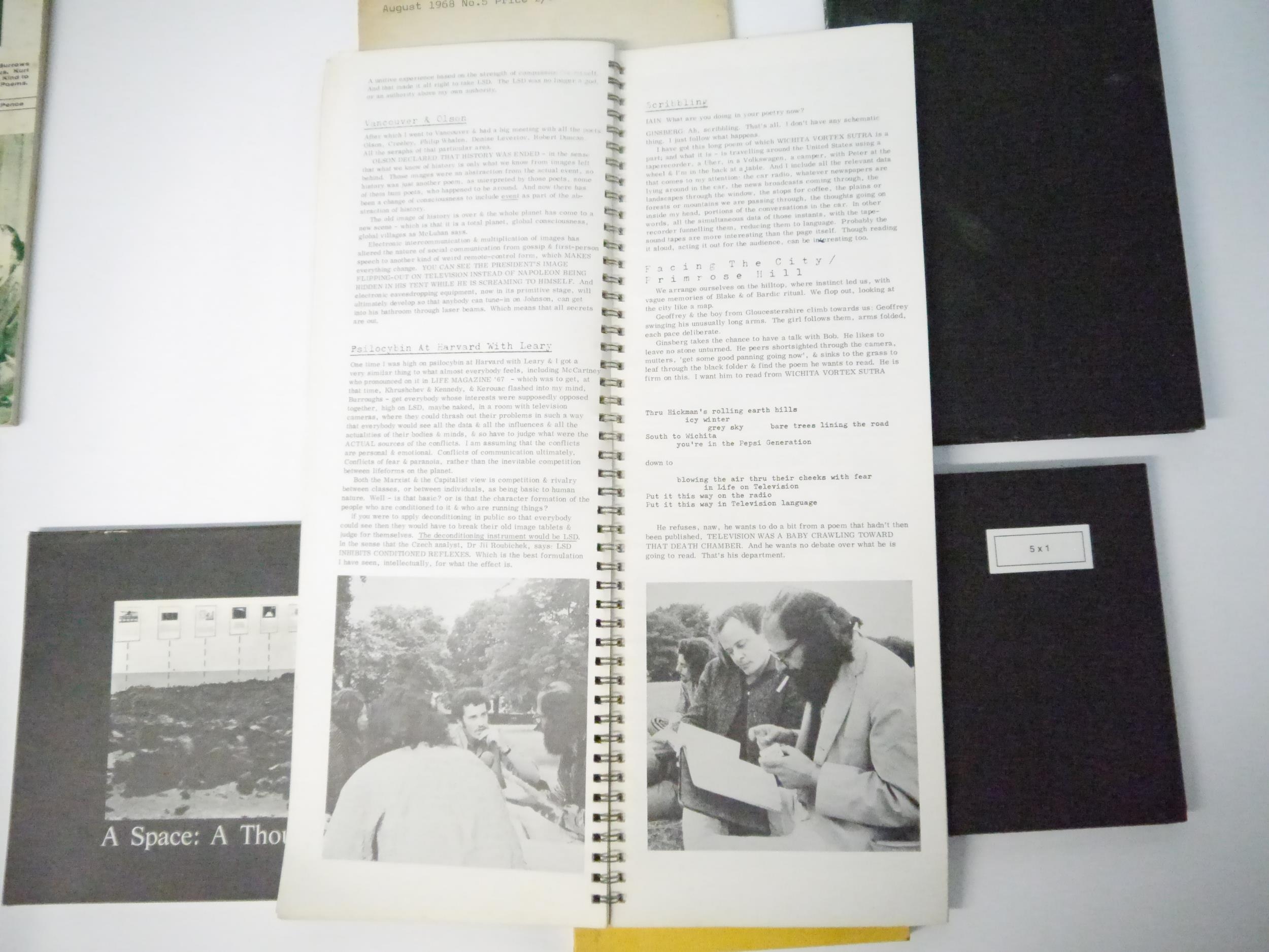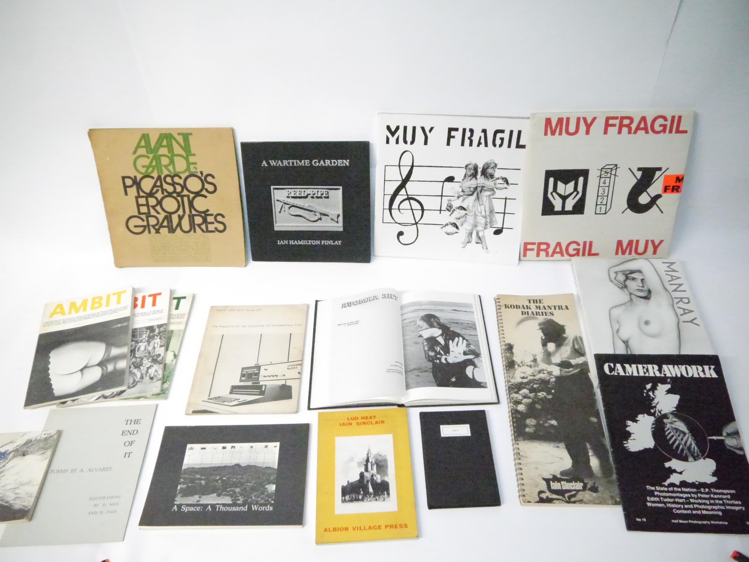 A collection of 19 books and booklets avant garde photography, art, poetry, literature etc, including Penelope Slinger: '50% The Visible Woman. A book of collage/poems', London, Narcis Publishing Ltd, 1971, 1st edition, 50 full page b/w illustrations from photographs of the author as muse in a photo collage, each overlaid with her poetry on printed transparent paper, printed statement at front "Of this edition fifty copies have been numbered and signed by the author", unnumbered and unsigned, original black cloth, spine silver lettered, silvered end papers/paste downs. Penny Slinger, sometimes Penelope Slinger, is a British-born American artist and author based in California. As an artist, she has worked in different mediums, including photography, film and sculpture. Her work has been described as being in the genres of surrealism and feminist surrealism. Her work explores the nature of the self, the feminine and the erotic. Her first book, when published, Rolling Stone said, '"This book will become as important on your bookshelf as Sgt. Pepper is on your record rack."; Michael Kustow; Jasia Reichardt (ed.): 'The Magazine Of The Institute Of Contemporary Arts August 1968 No. 5.', Institute Of Contemporary Arts, London, 1968, 1st edition, 40pp, content includes The Four-bug problem and its outcome; Relation between mathematics and the ordered patterns of Op art; The poem as a schema, etc, b/w illustrations, original pictorial wraps, front cover of an oil on canvas by Lowell Nesbitt depicting IBM 1440 Data Processing system, 1965, rear cover also by Lowell Nesbitt of an IBM 1440. Scarce; Iain Sinclair: 'The Kodak Mantra Diaries: October 1966 to June 1971', Albion Village Press, 1971, 1st edition, Illustrated account of Allen Ginsberg in London, tall narrow folio (41 x 15cm), original spiral bound pictorial printed wraps; plus others Man Ray, Iain Sinclair, Erskine Caldwell & Maragaret Bourke-White, Ian Hamilton Finlay, Picasso, 'Muy Fragil', proof of the special limited edition of 'Musrum' by Erick Thacker and Anthony Earnshaw, etc etc (19)