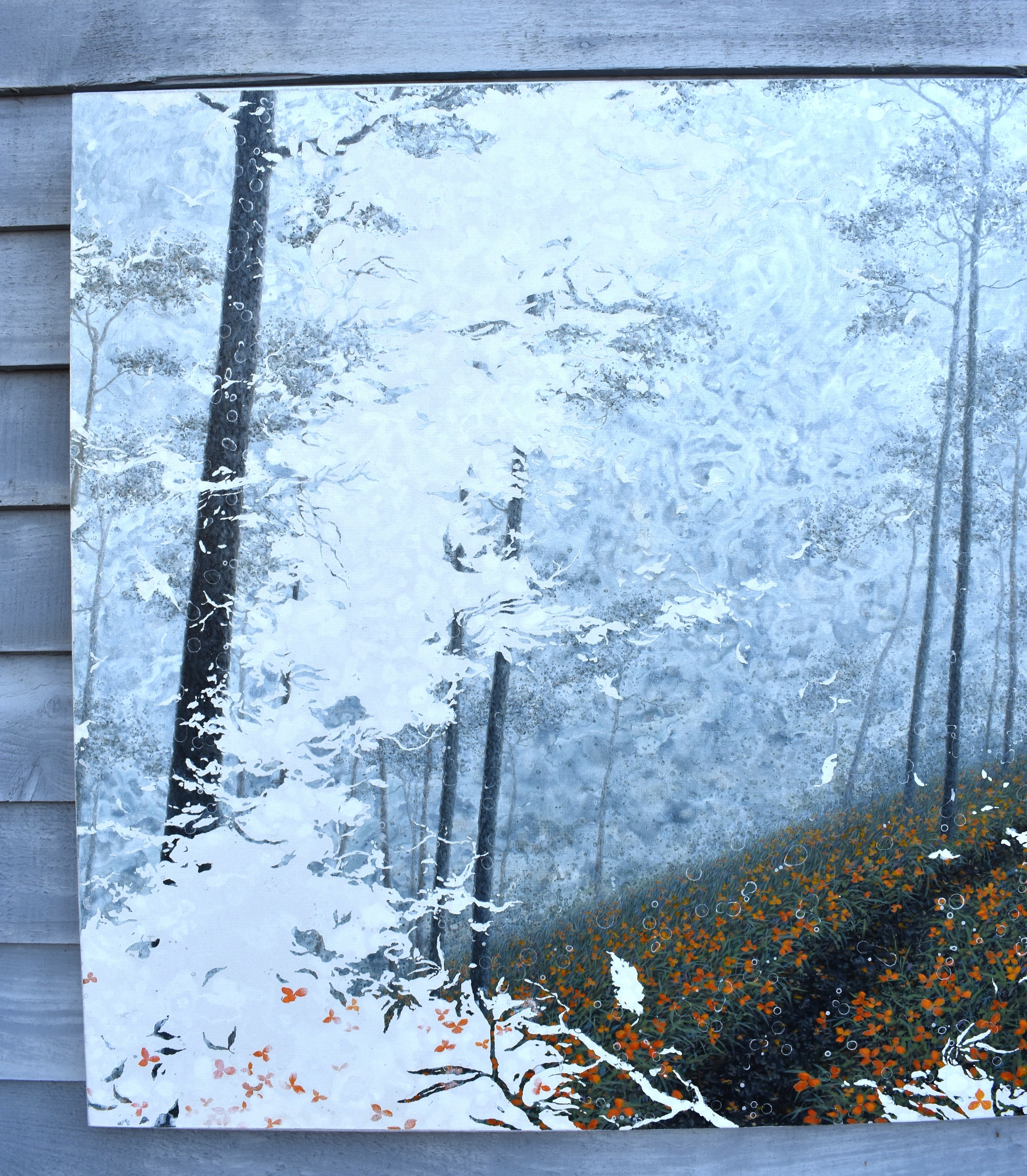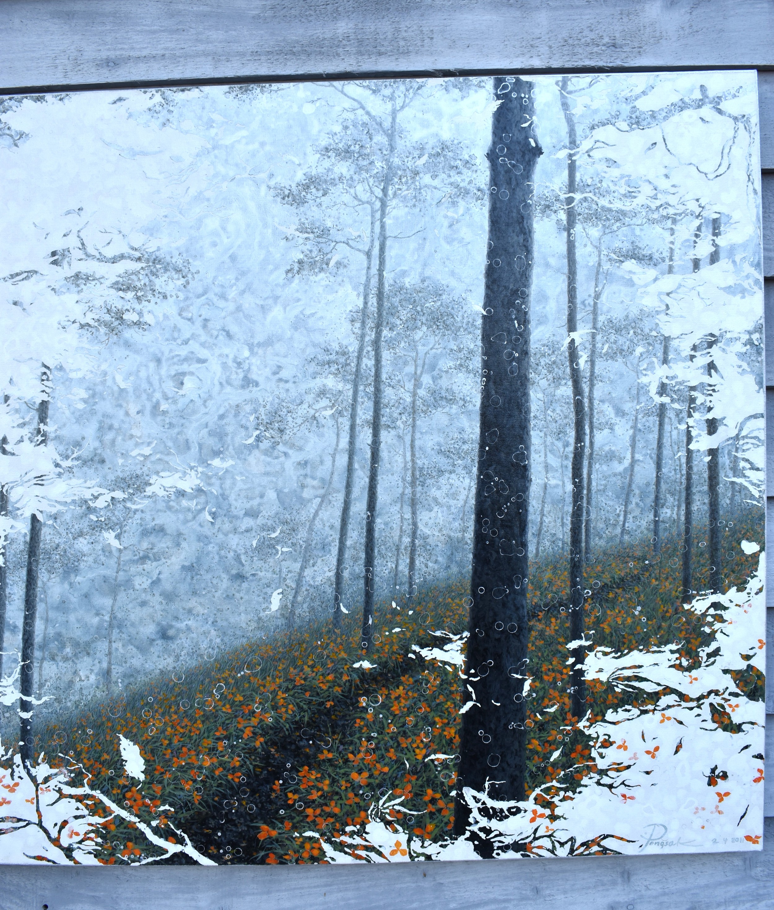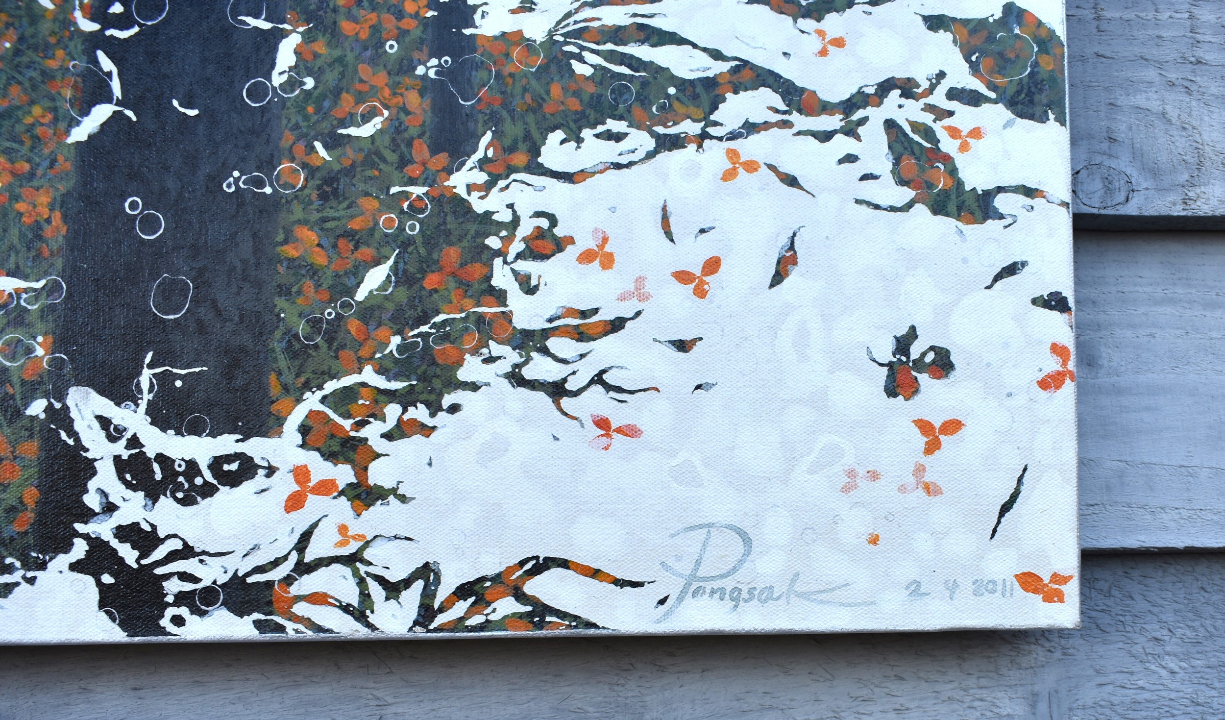 PONGSAK KAMJORNRASAMEKIT (b.1974) Thai Contemporary Artist: abstract painting depicting woodland and leaves. This natural scene exudes a sense of tranquillity with the artists deliberate omission of certain elements, dated 2011, oil on canvas, 90cm x 12.5cm