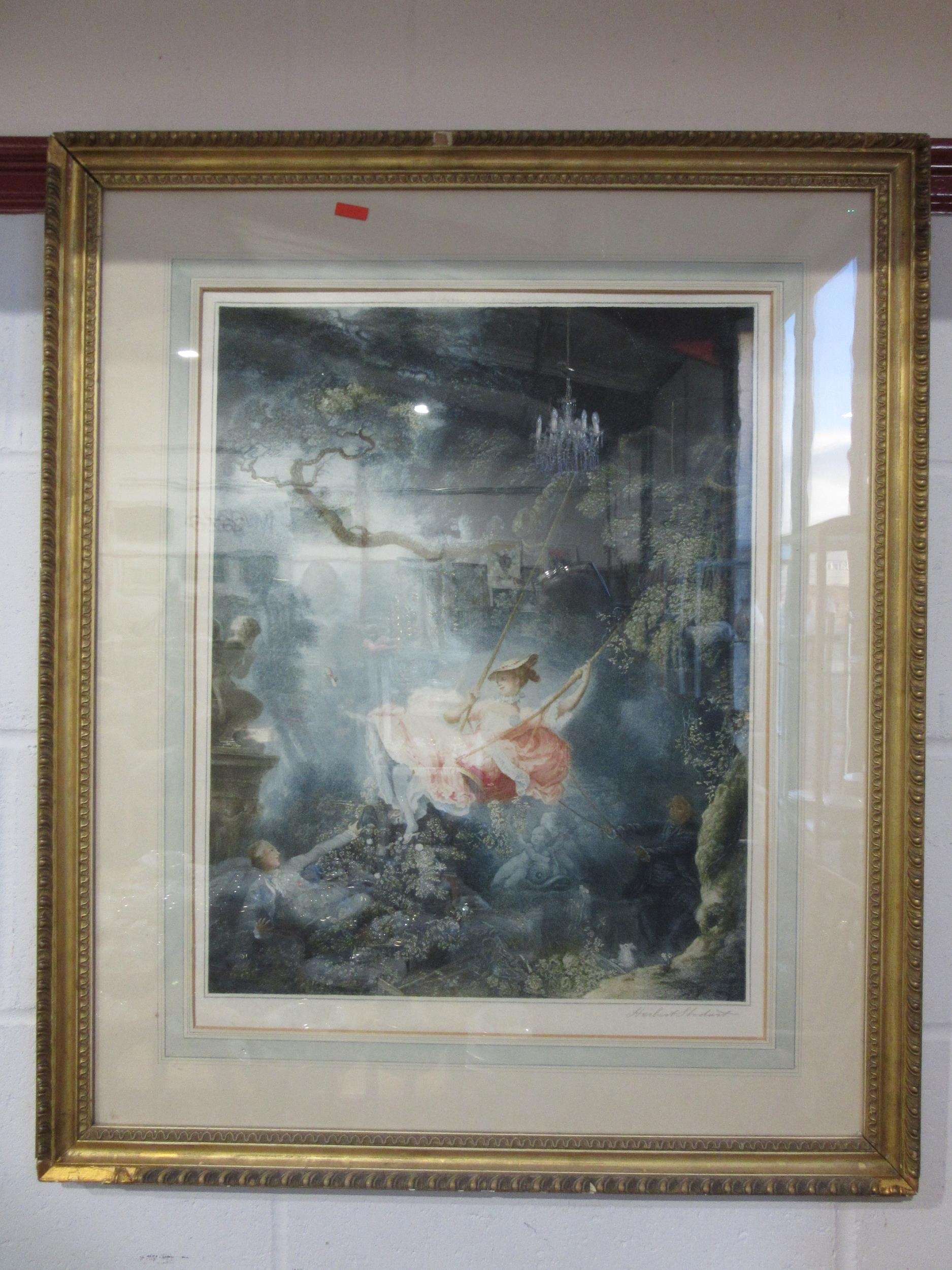 A Herbert Stodart mezzotint, girl on a swing, signed, framed and glazed, 58cm x 45cm image size
