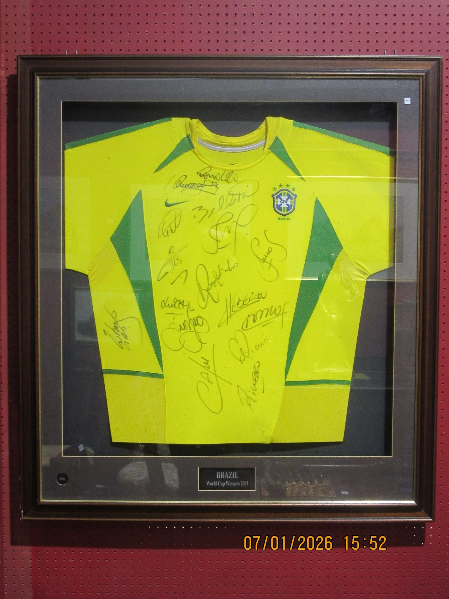 A 2002 Brazil football shirt bearing signatures, framed and ...
