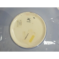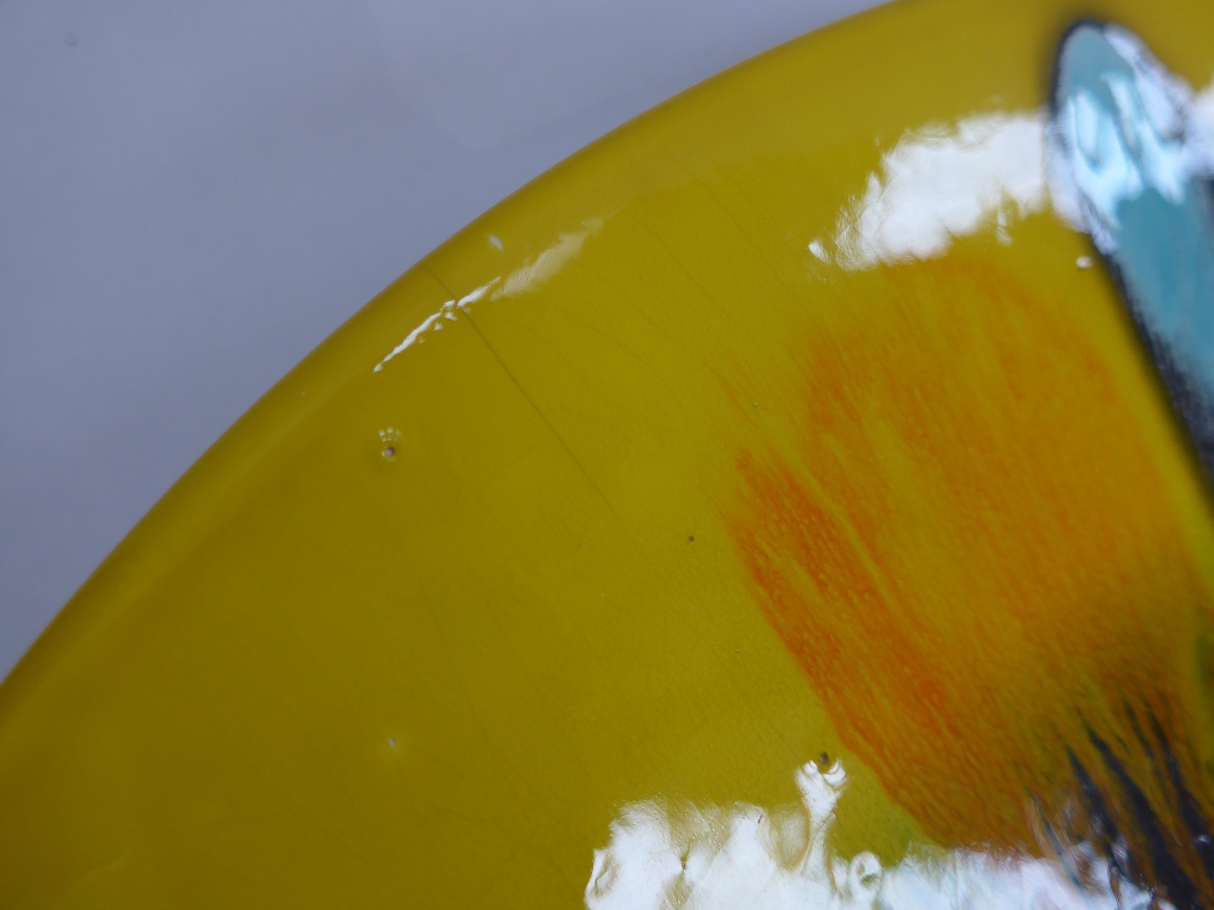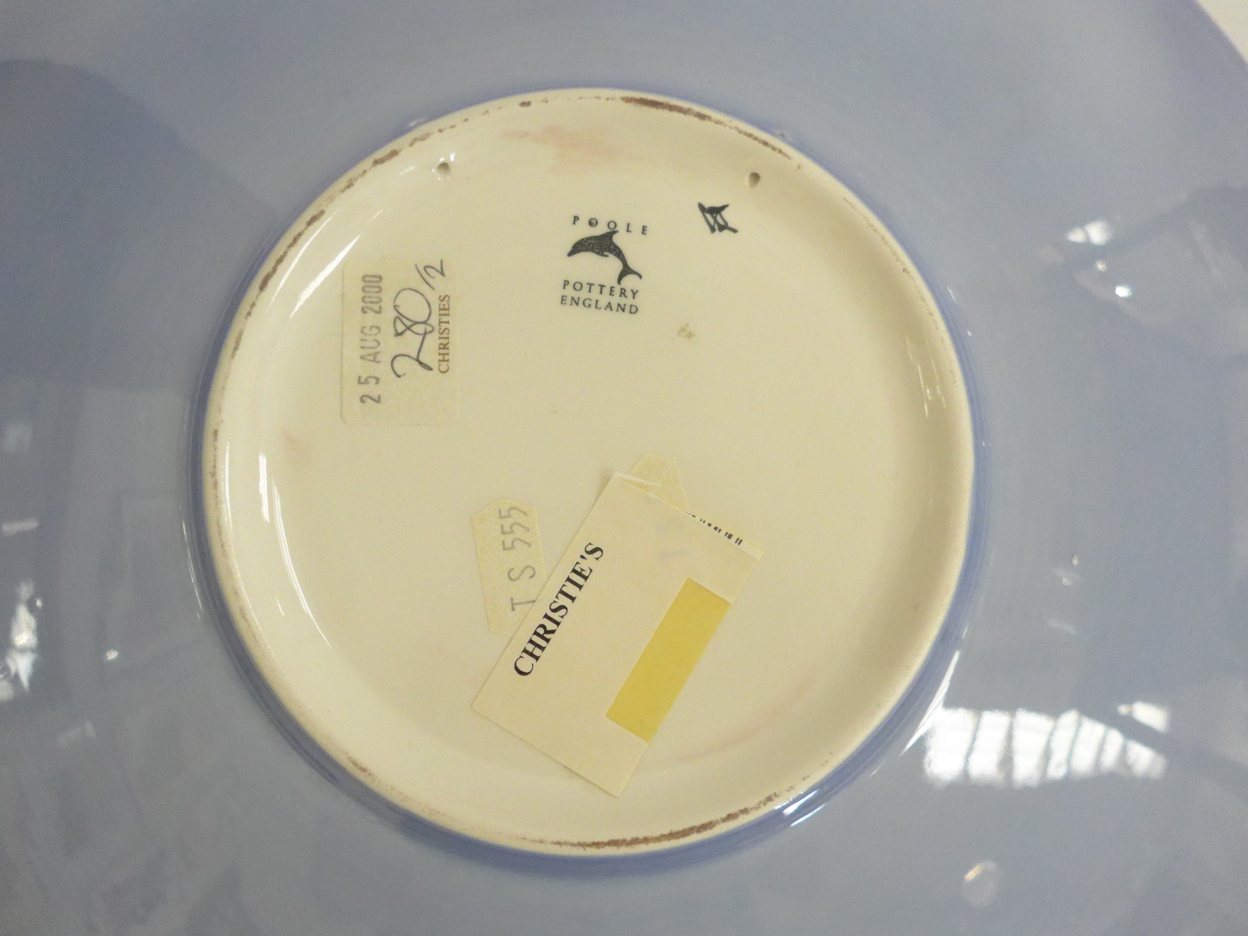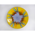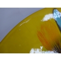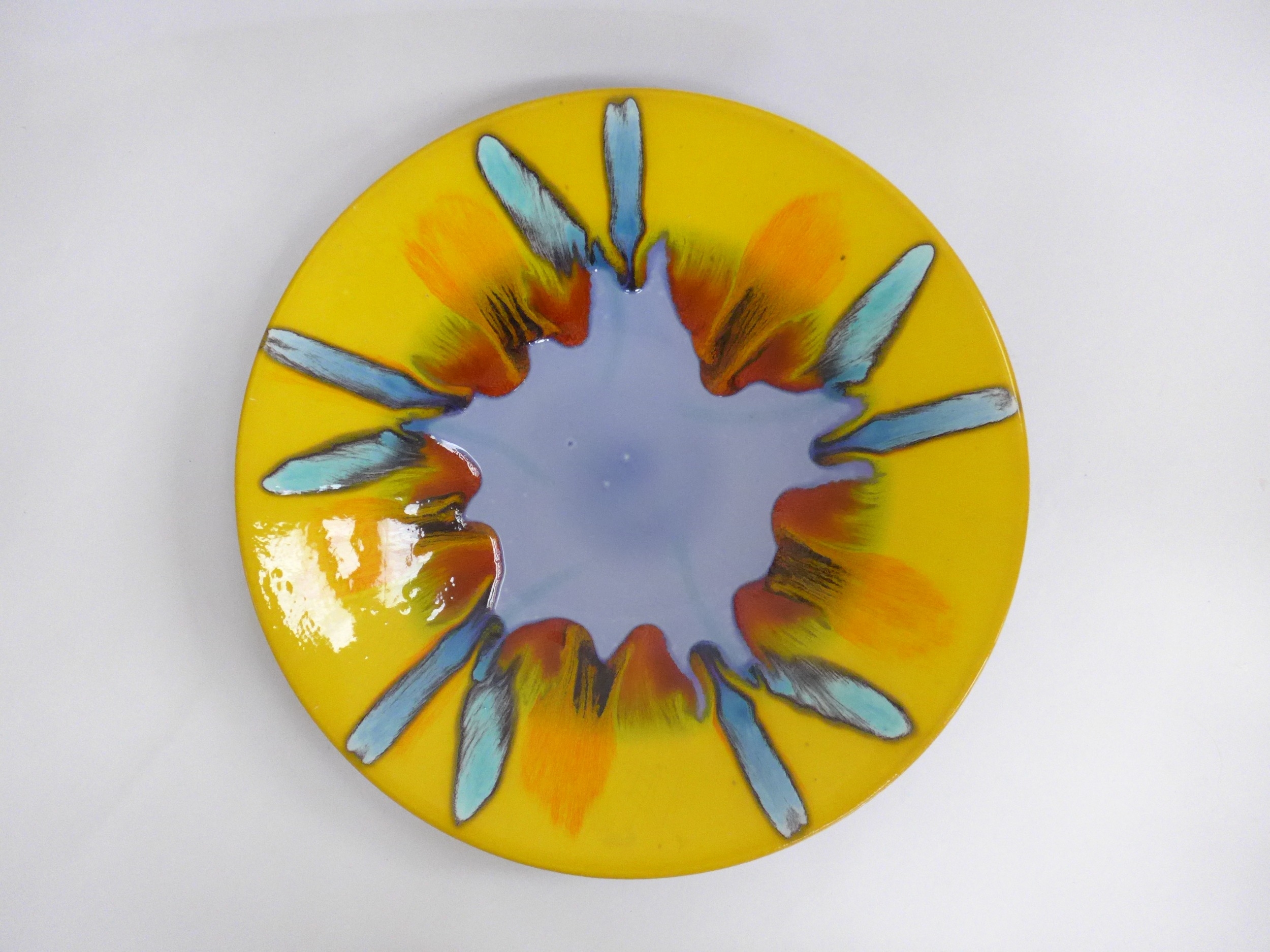 A large modern Poole Pottery shallow dish with yellow, pale blue and red colours. Black backstamp. 41.5cm diameter (Hairline from rim)