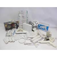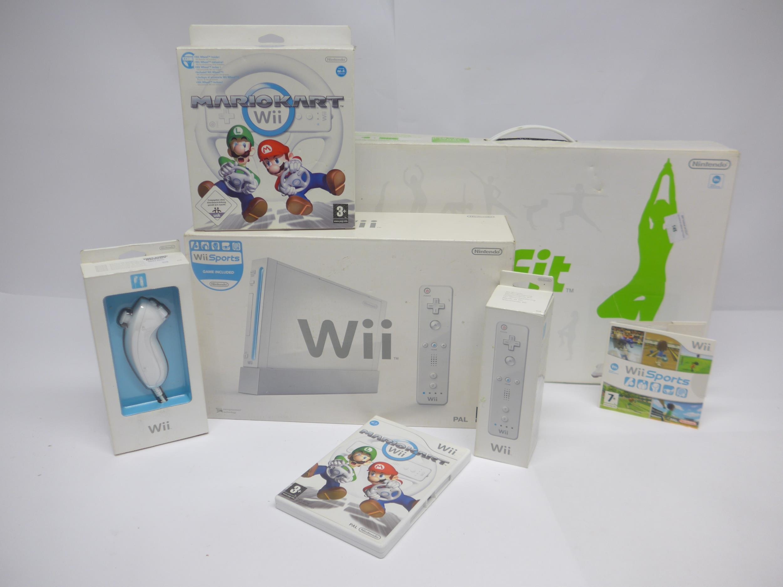Retro Gaming - A boxed Nintendo Wii computer games console with boxed accessories to include remote and nunchuck, Wii Fit board, steering wheel and Mario Kart and Wii Sports games