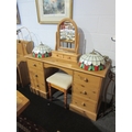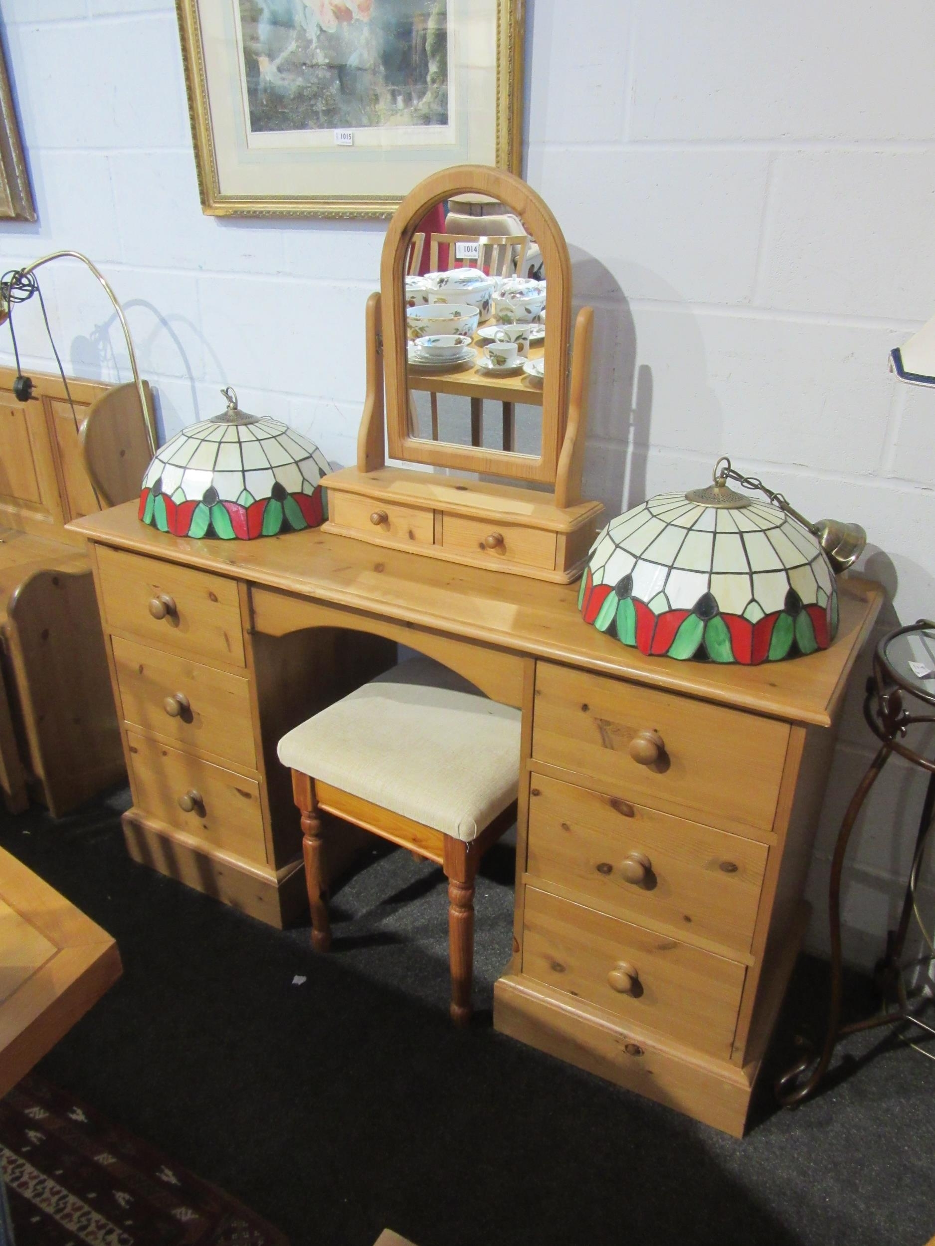 A pine dressing table with six drawers, stool and mirror