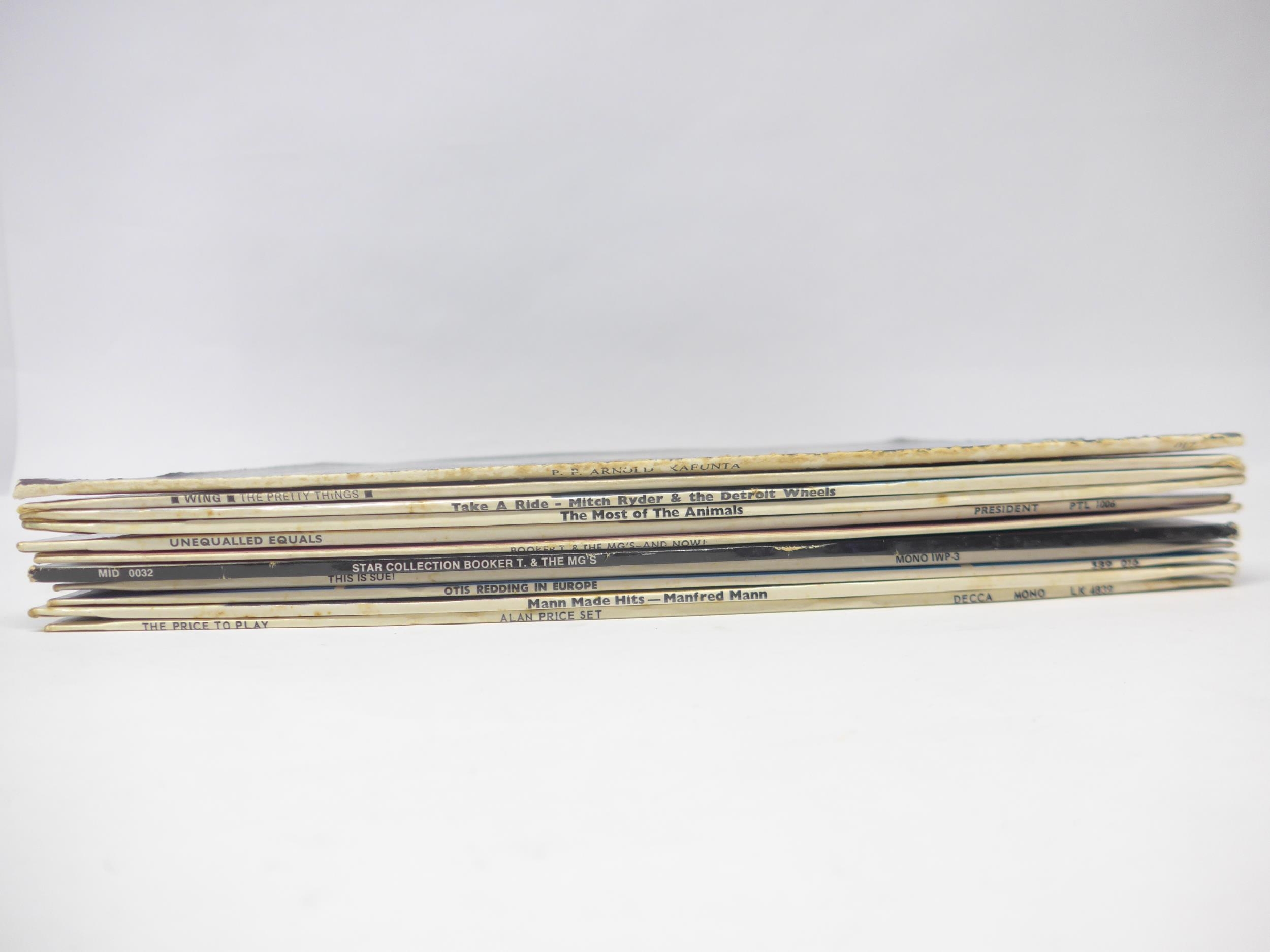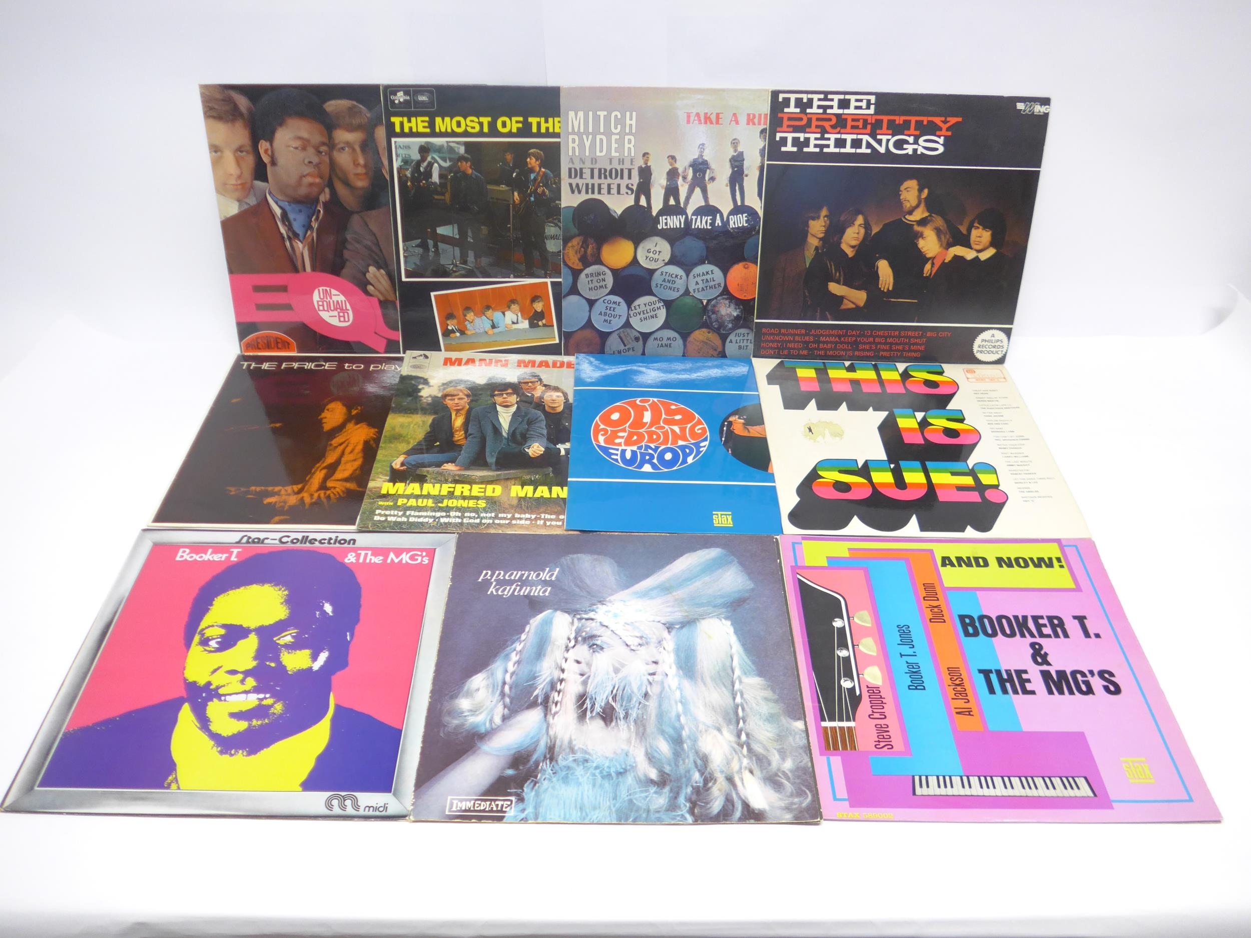 R&B / Soul / Beat / Mod - A collection of eleven LPs to include P.P. ARNOLD: 'Kafunta' in Unipak style gatefold sleeve (Immediate IMSP 017), BOOKER T & THE MG'S: 'And Now!' (Stax 589002) and 'Star Collection' (Midi MID 0032), THE ANIMALS: 'The Most Of The Animals' (Columbia SX 6035), THE EQUALS: 'Unequalled' (President Records PTL 1006), MITCH RYDER AND THE DETROIT WHEELS: 'Take A Ride...' (Stateside SSL 10178), OTIS REDDING: 'Otis Redding In Europe' (Stax 589 016), MANFRED MANN: 'Mann Made Hits' (HMV CLP 3559), ALAN PRICE SET: 'The Price To Play' (Decca LK 4839), THE PRETTY THINGS: 'The Pretty Things' (Wing Records WL1167), and 'This Is Sue!' compilation album (Island Records IWP 3) (11, vinyl and sleeves generally VG-VG+)