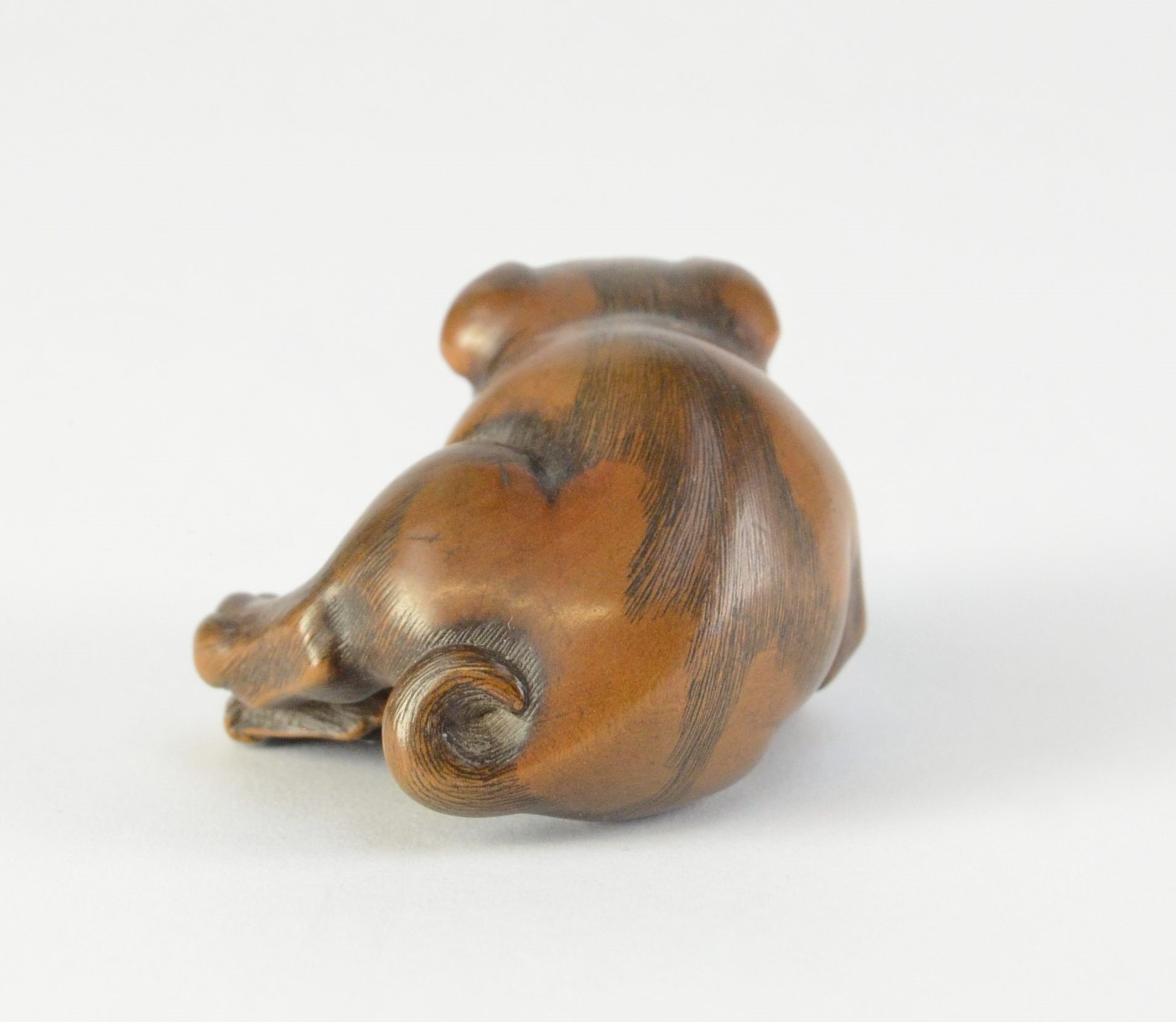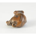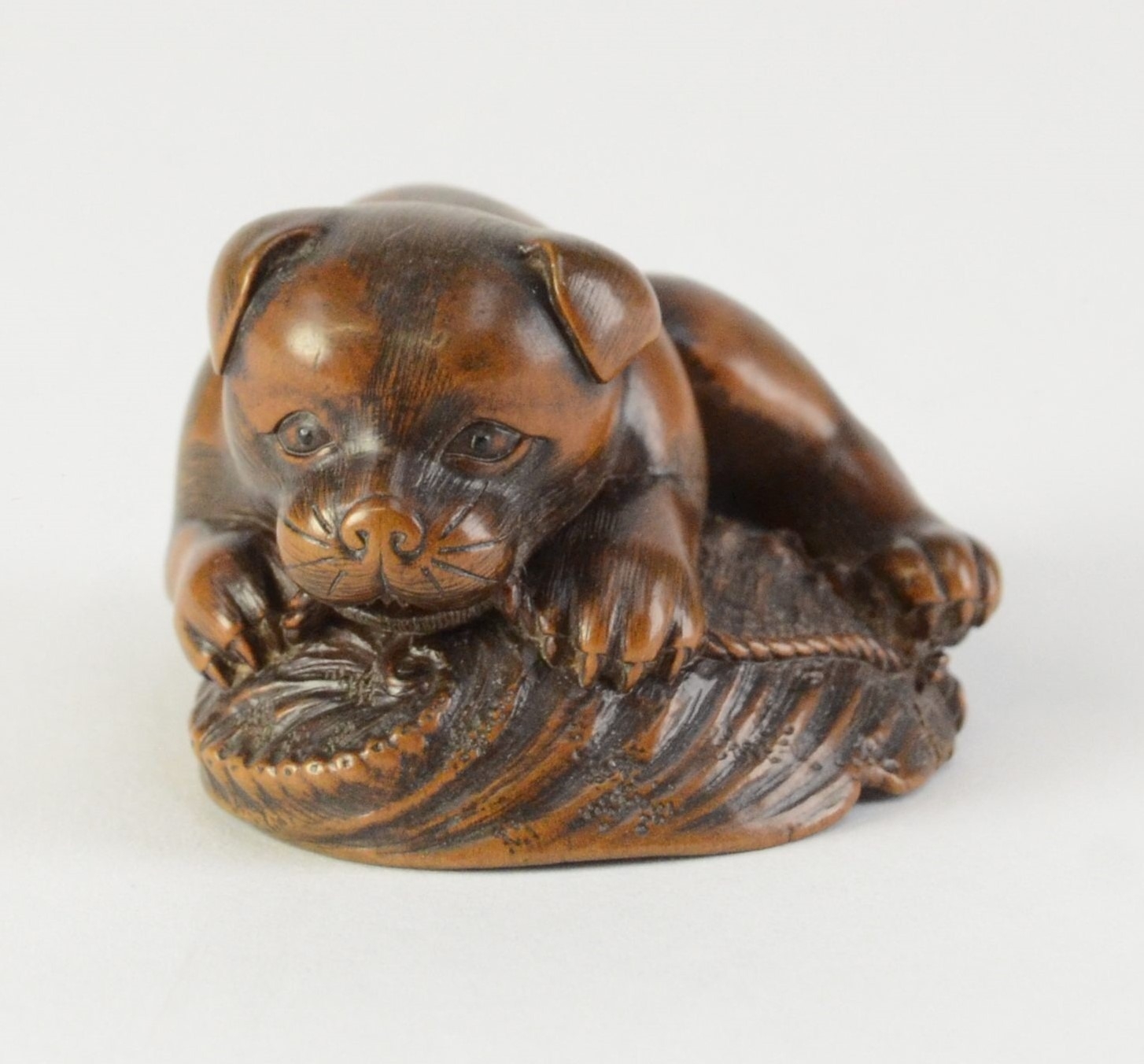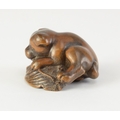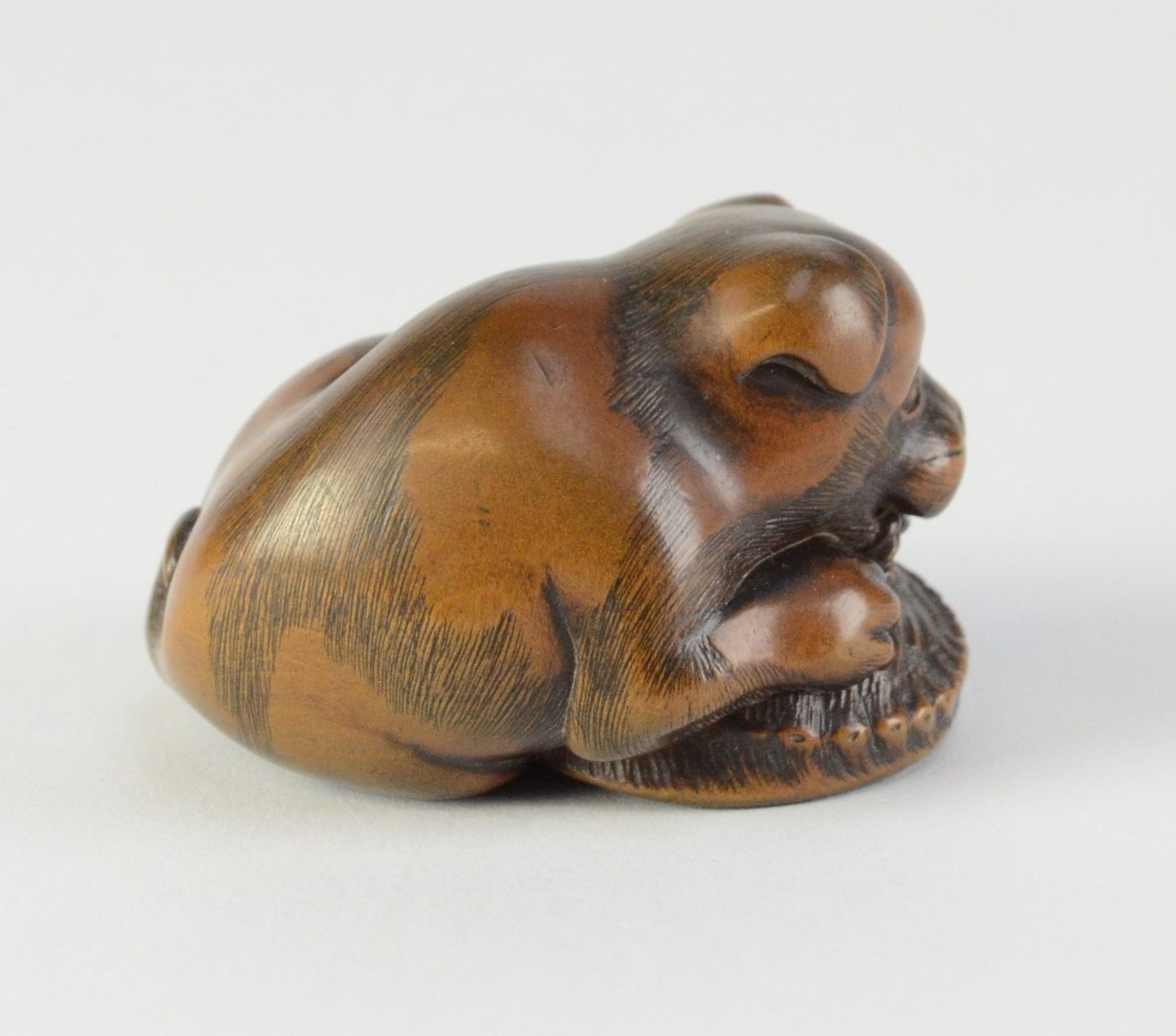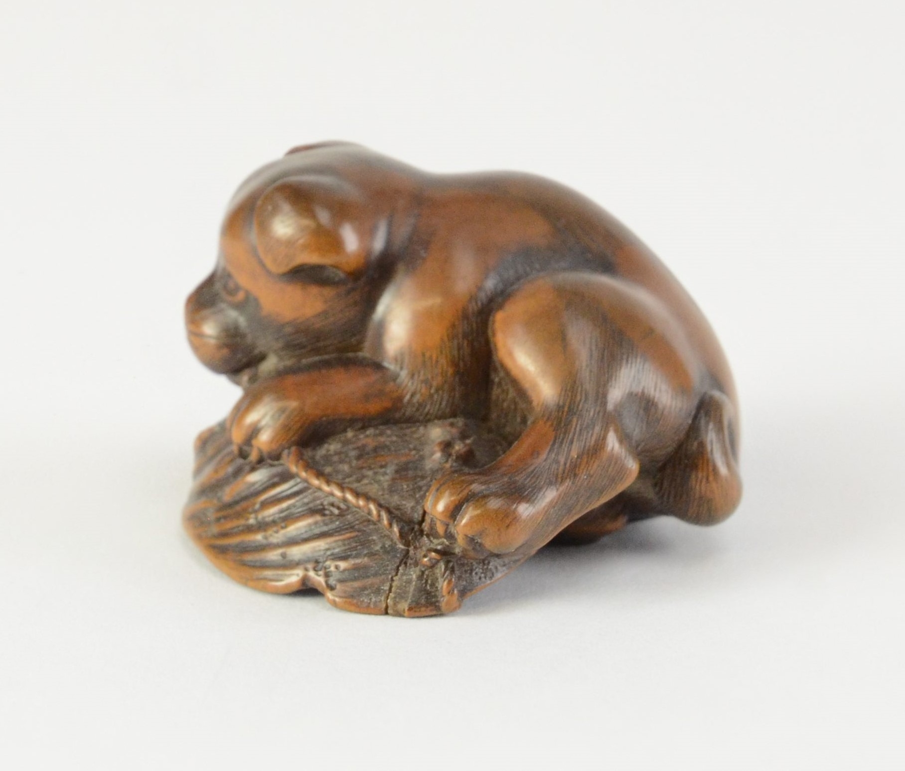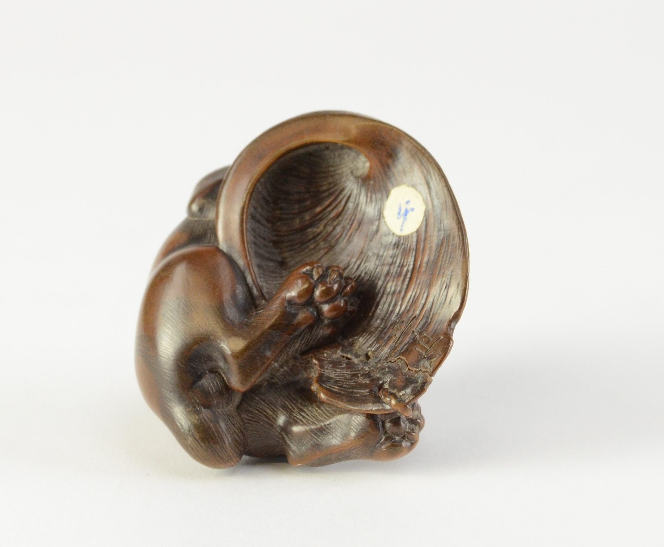 MASANAO- a carved wooden netsuke of a dog gnawing on a shell, signed to shell, a/f4cm wide, 4.5cm deep and 3cm highProvenanceDorothy Ann Stevens Collection no. 6Glendining & Co 7/3/52 lot 6