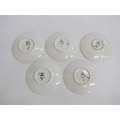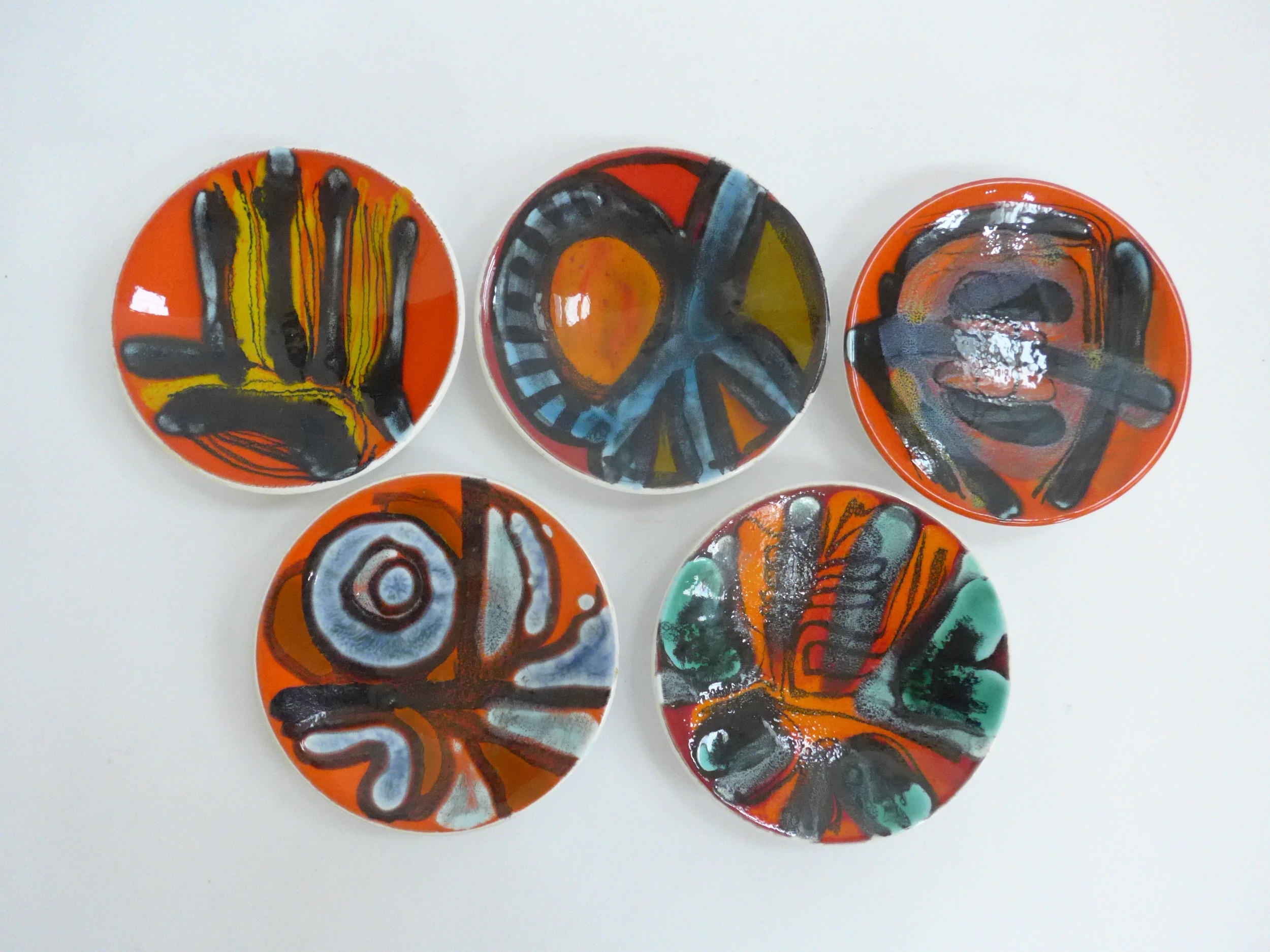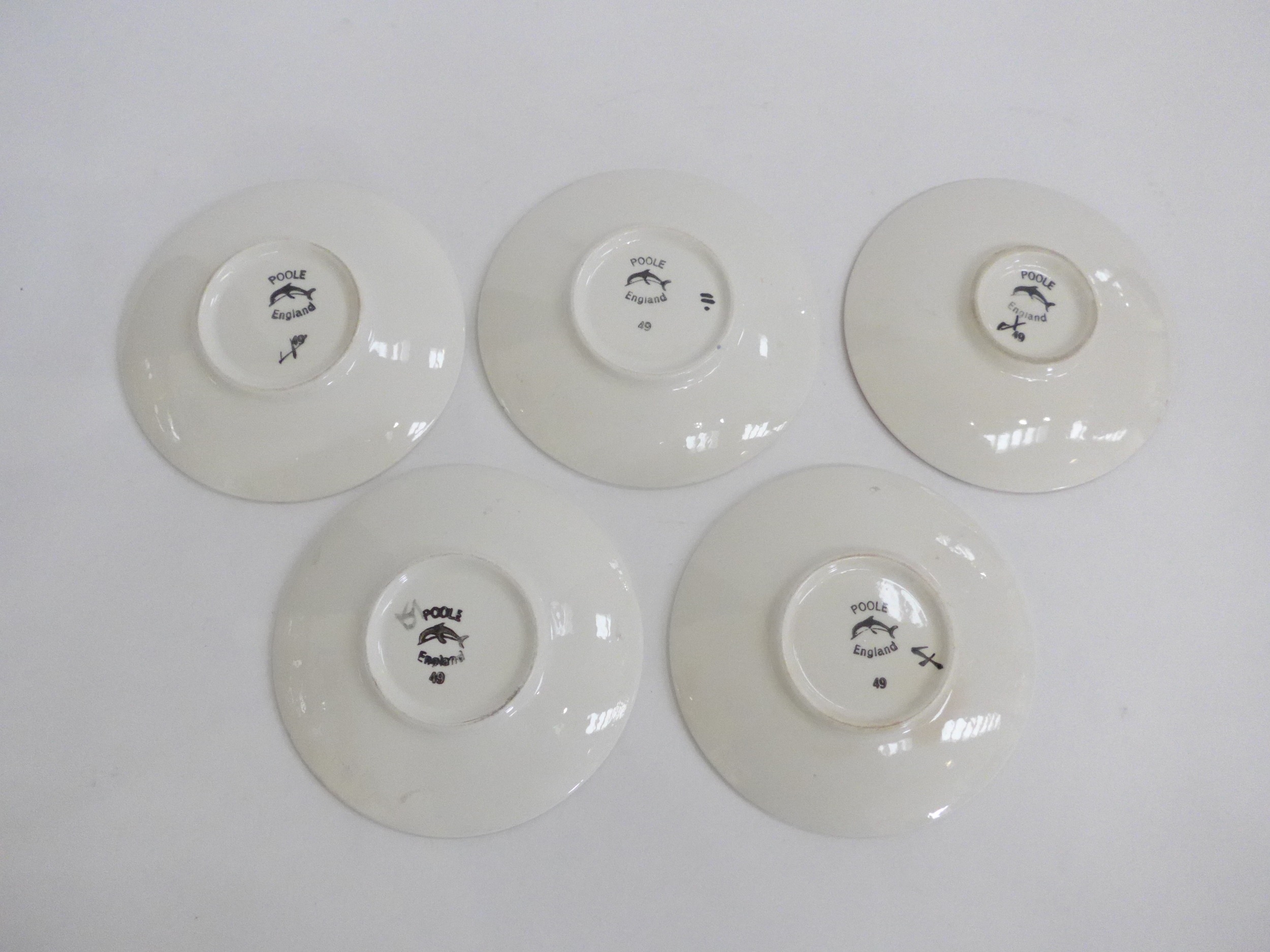 Five small Poole Pottery Delphis range pin dishes, various colours. Black backstamps. 12.5cm diameter