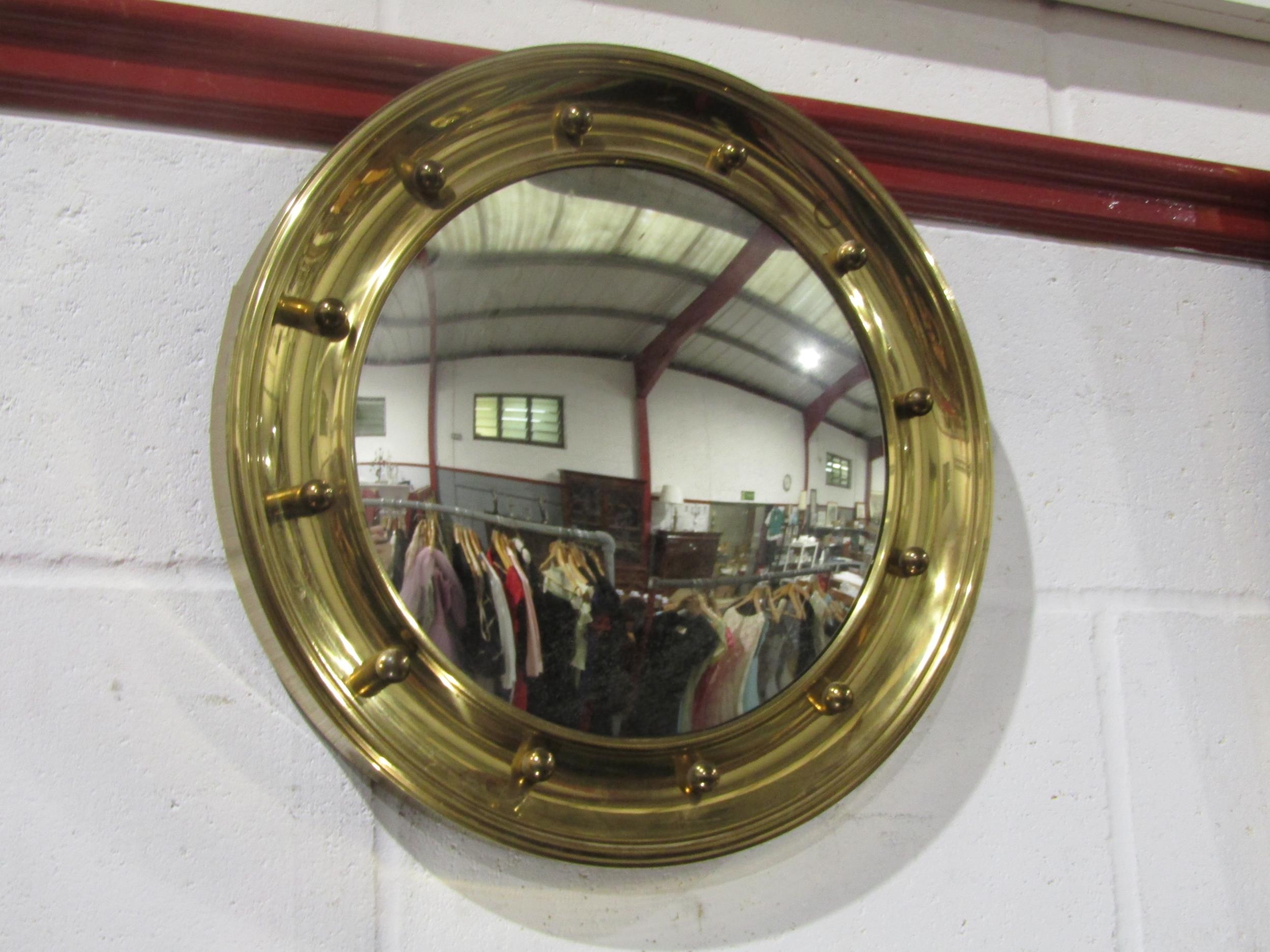 A porthole style brass framed wall mirror with convex mirror plate, 41cm diameter