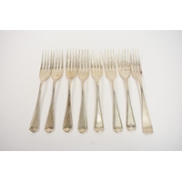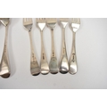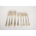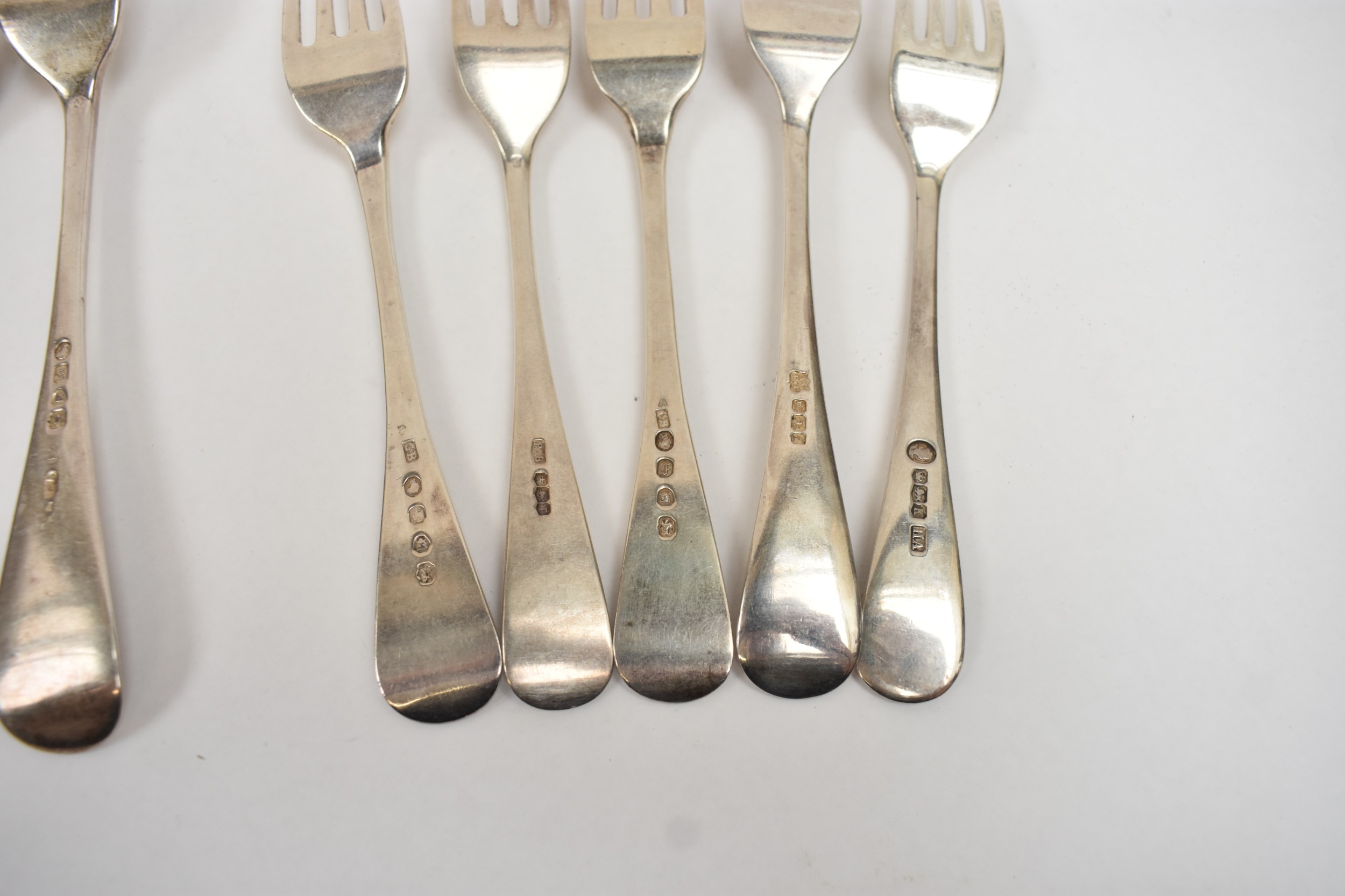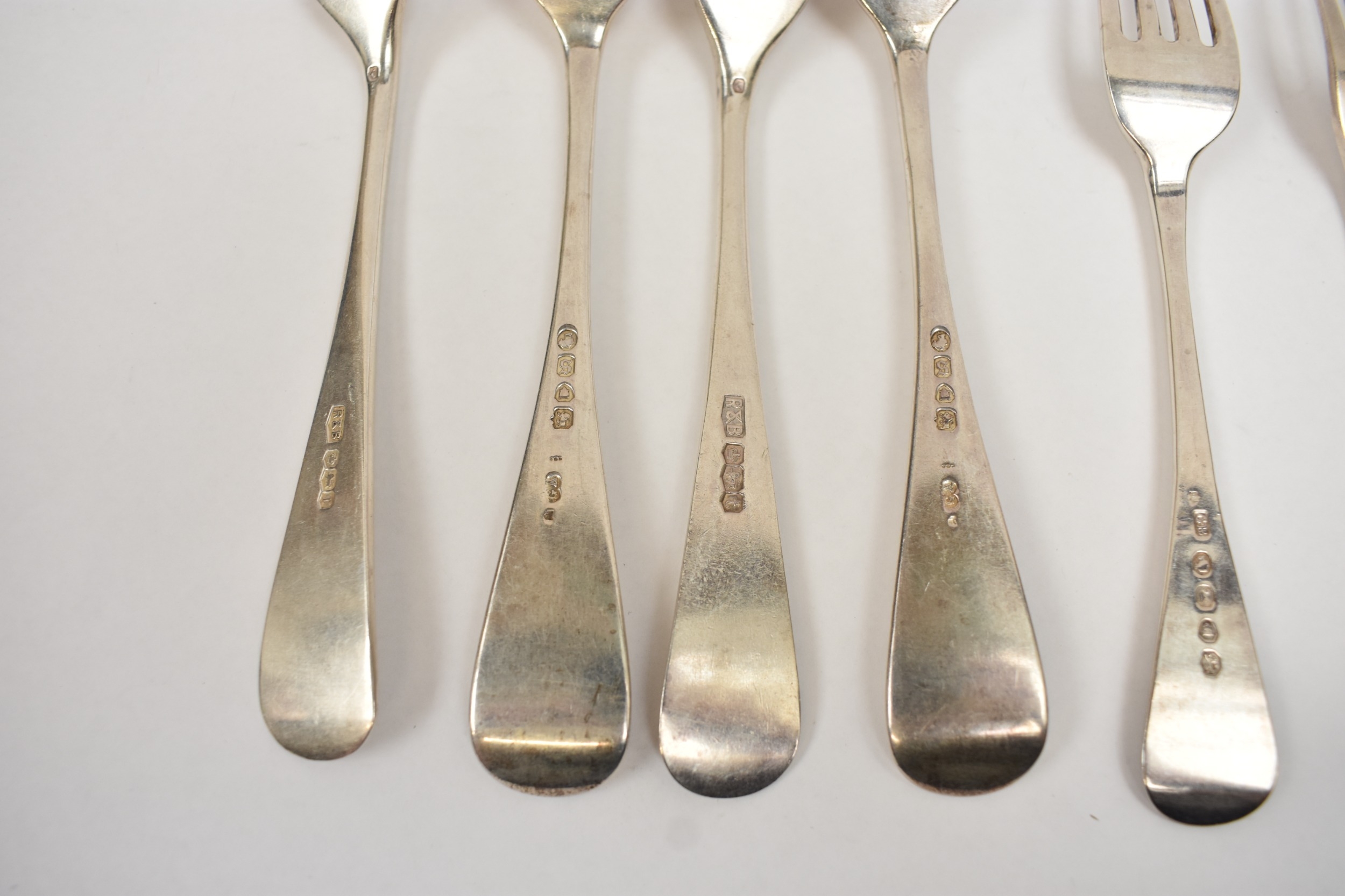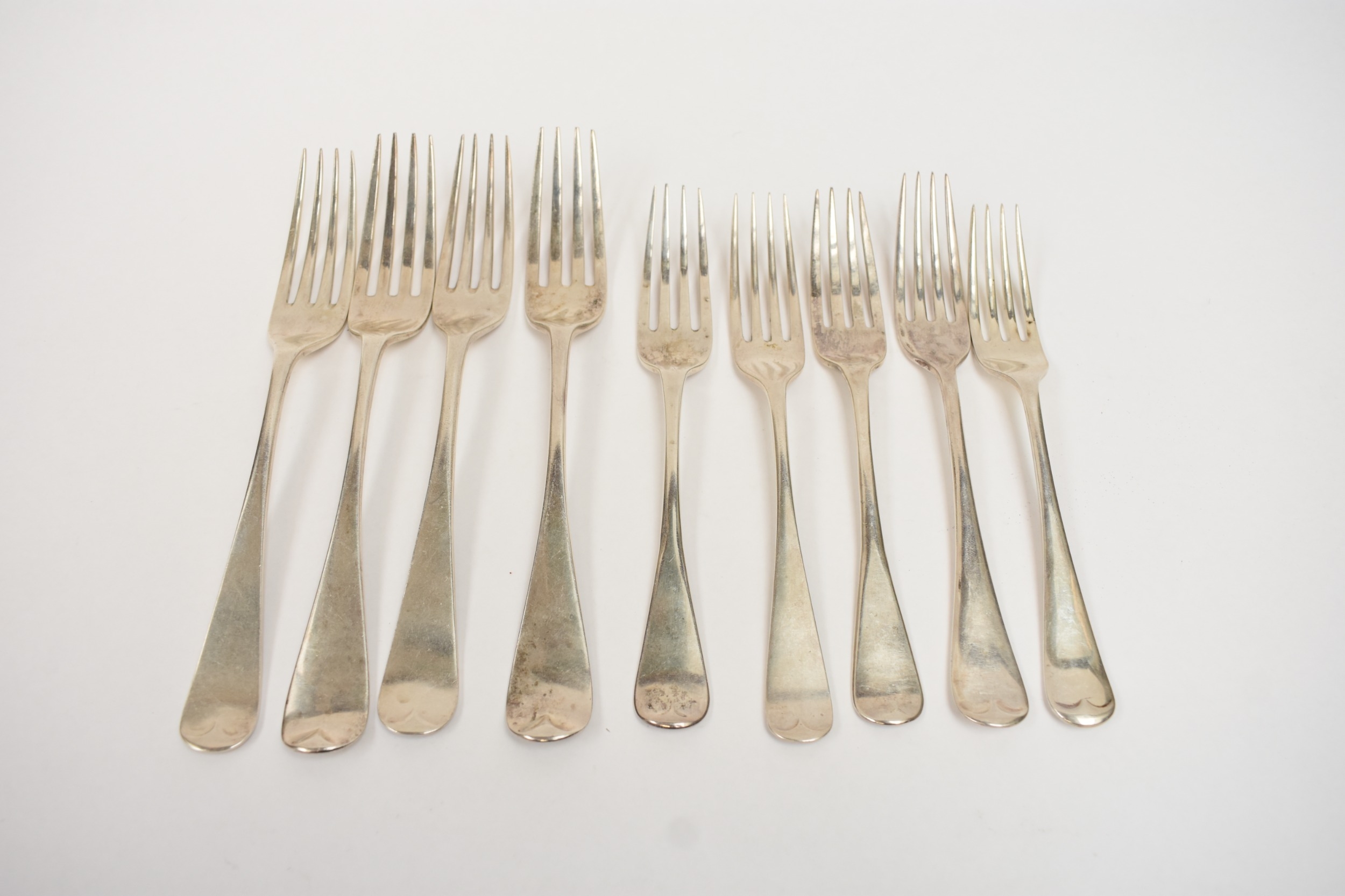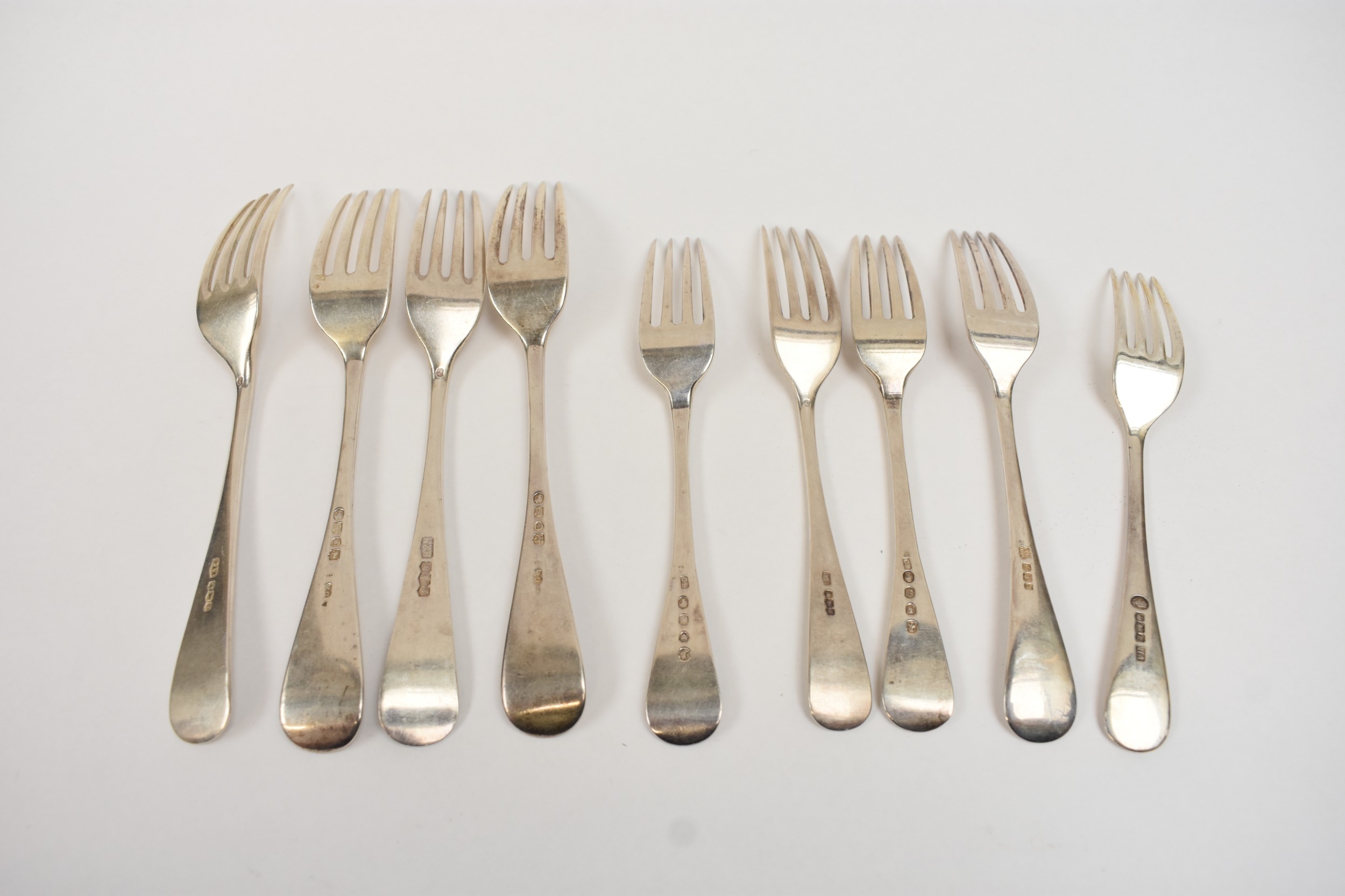 Four silver "Old English" pattern large forks, two by Roberts & Belk, two by Chawner & Co., 19.5cm long and five small forks by four different makers, 16.7cm long. 481g