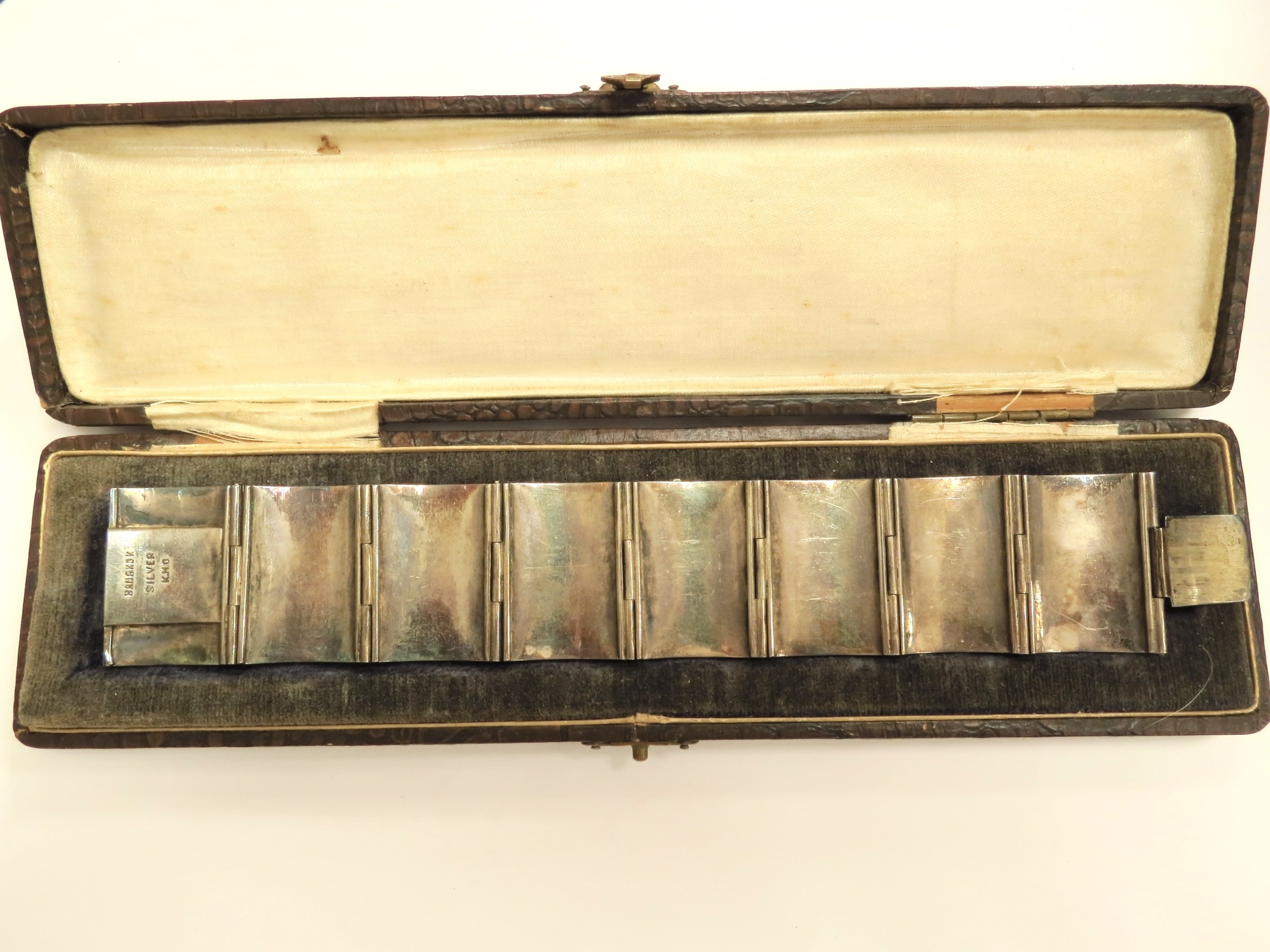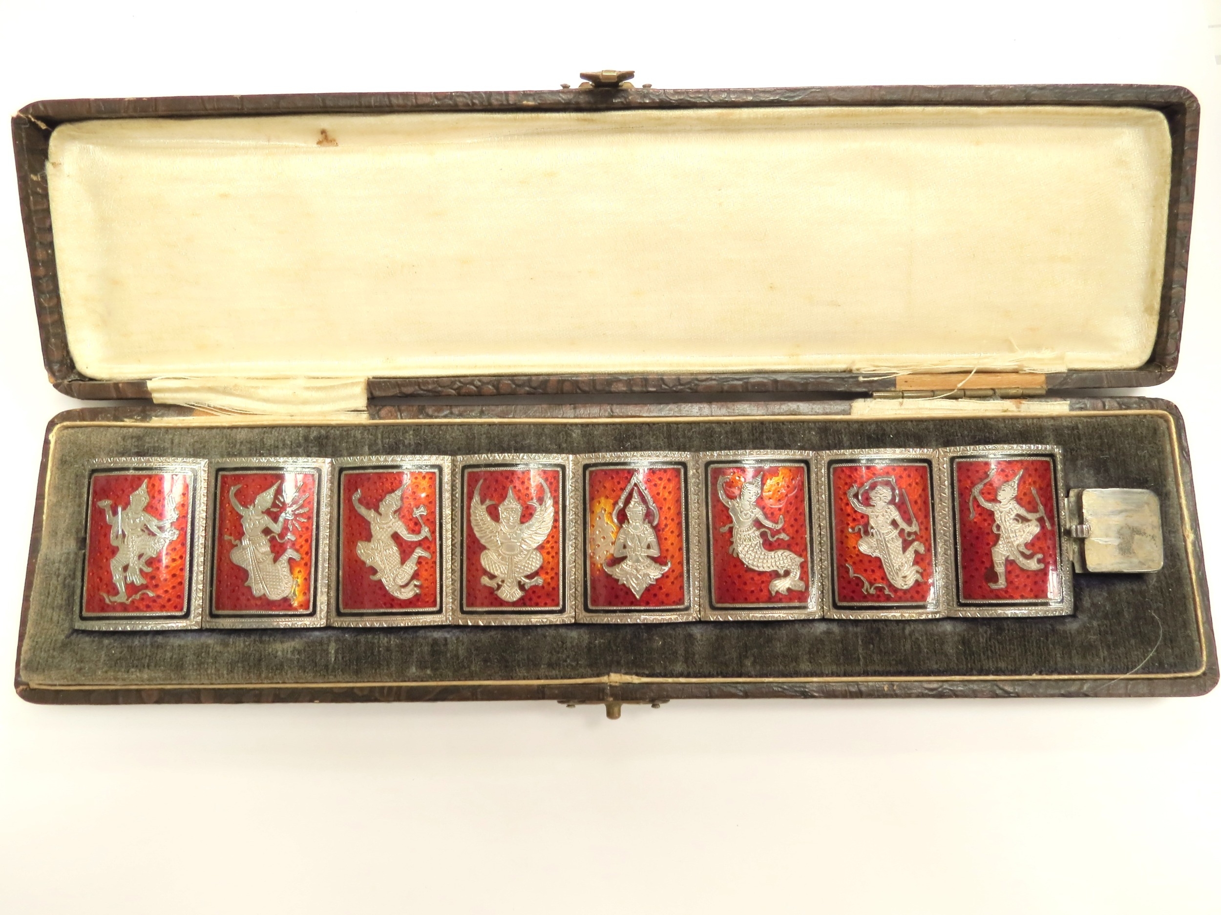 A Bangkok silver enamelled panel bracelet, some damage to enamel, in original fitted box