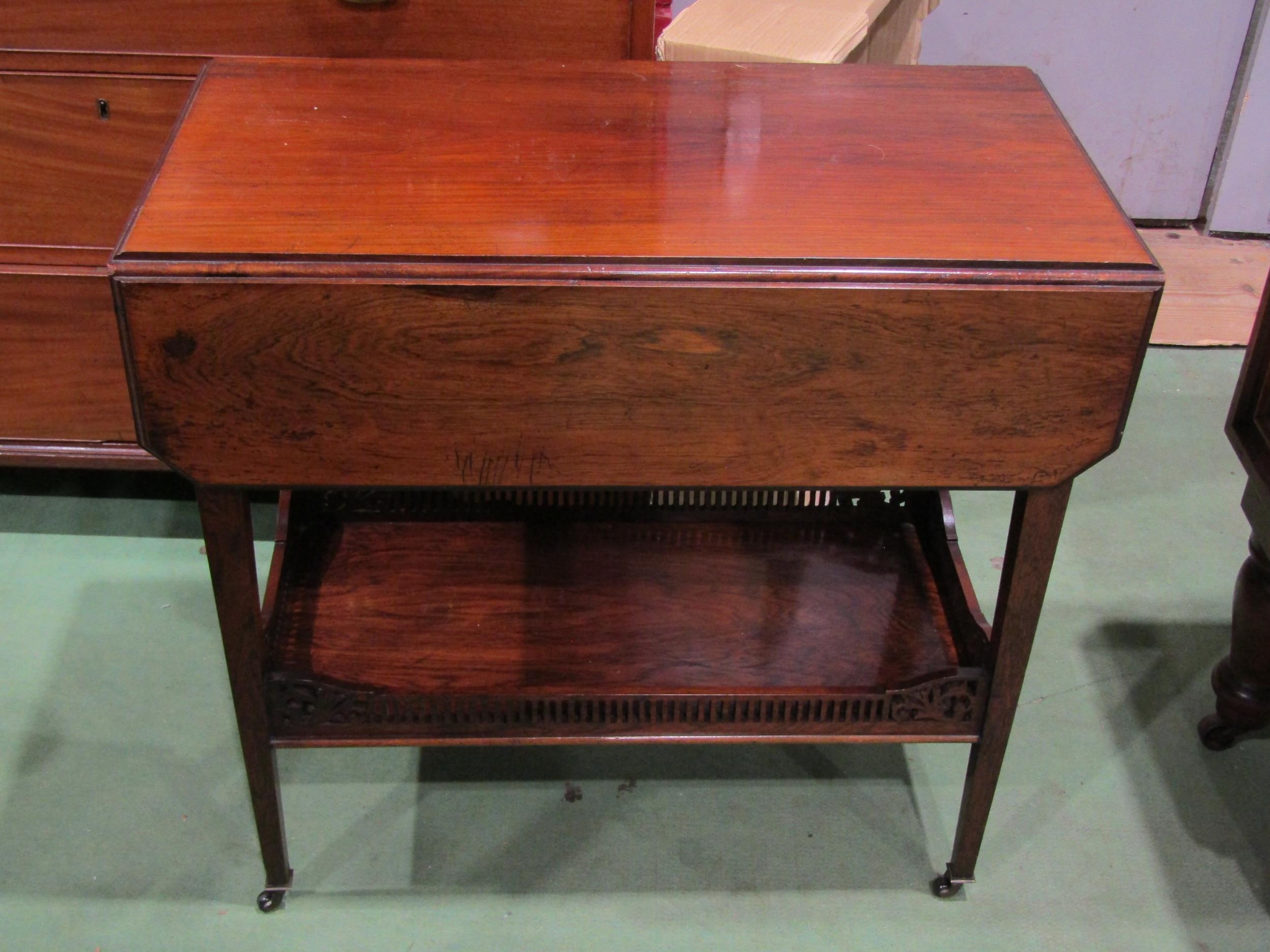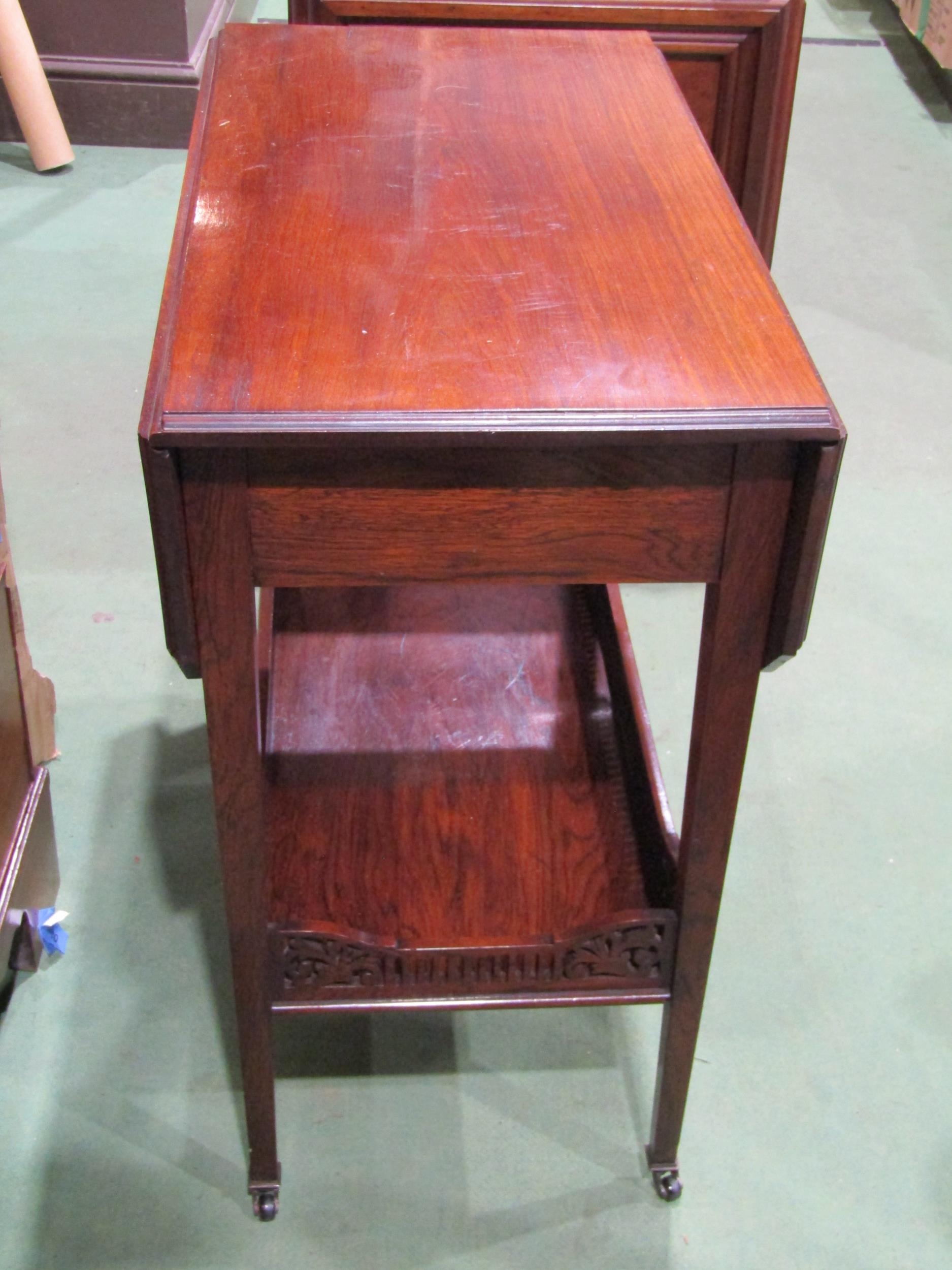 A Circa 1900 late Victorian rosewood two-tier drop-flap table the rising leaves over a single drawer and square tapering legs on black ceramic castors united by an under-shelf having a fretwork gallery