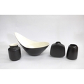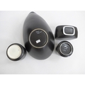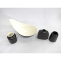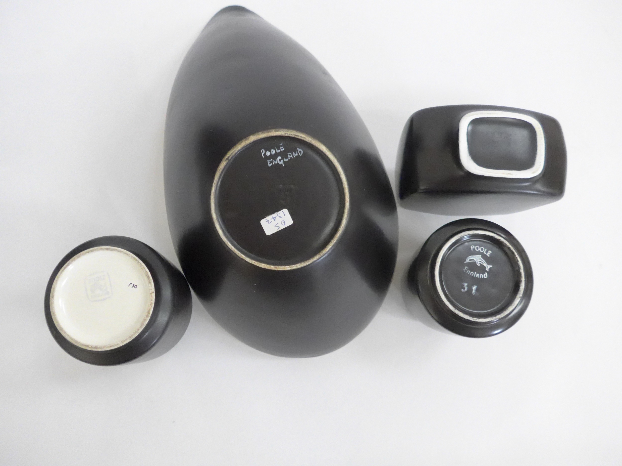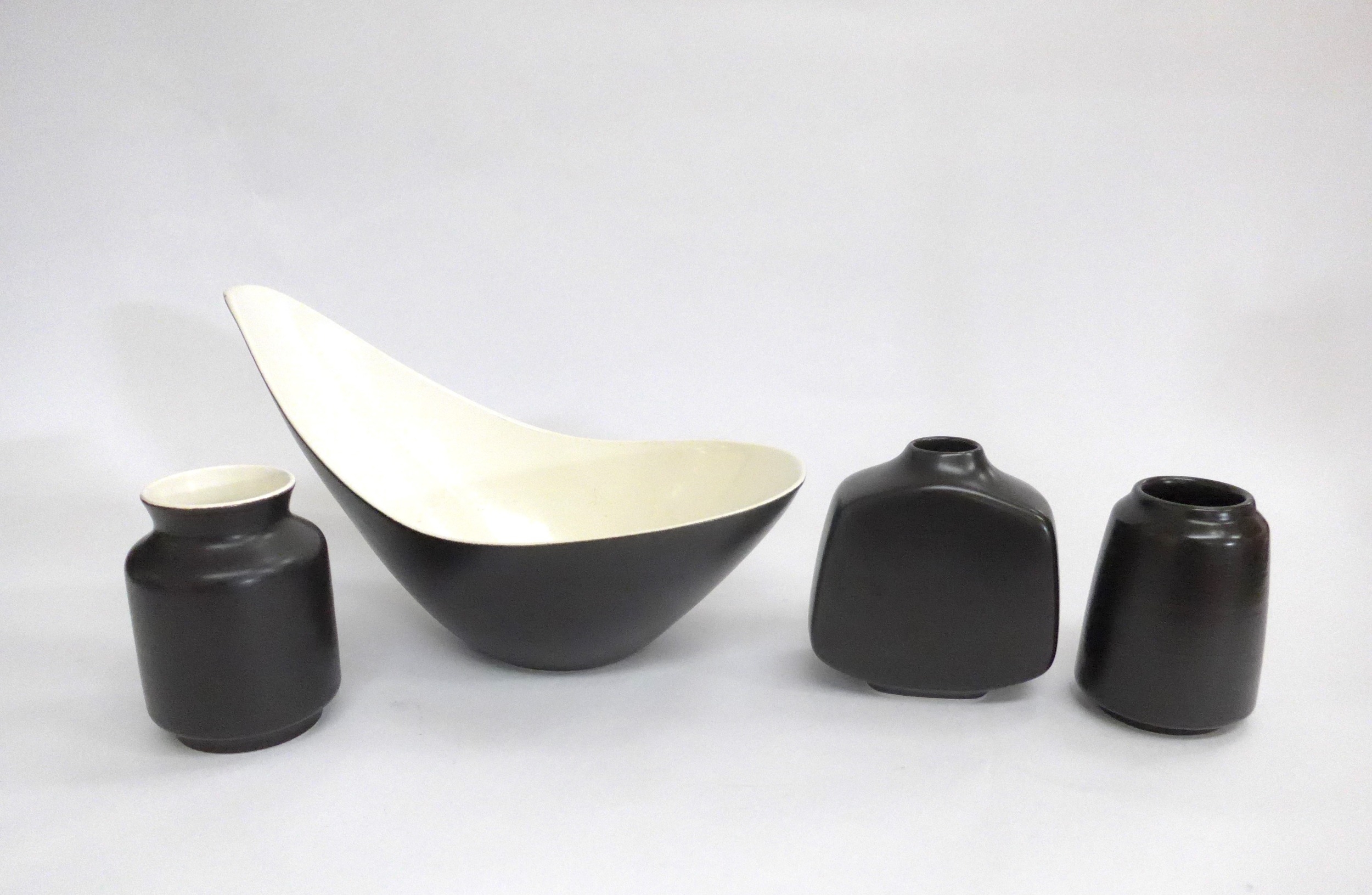 Three Poole Freeform vases and bowl designed by Alfred Read & Guy Sydenham, various shapes, Black Panther glazes. Various backstamp marks. Tallest 16cm high (4)
