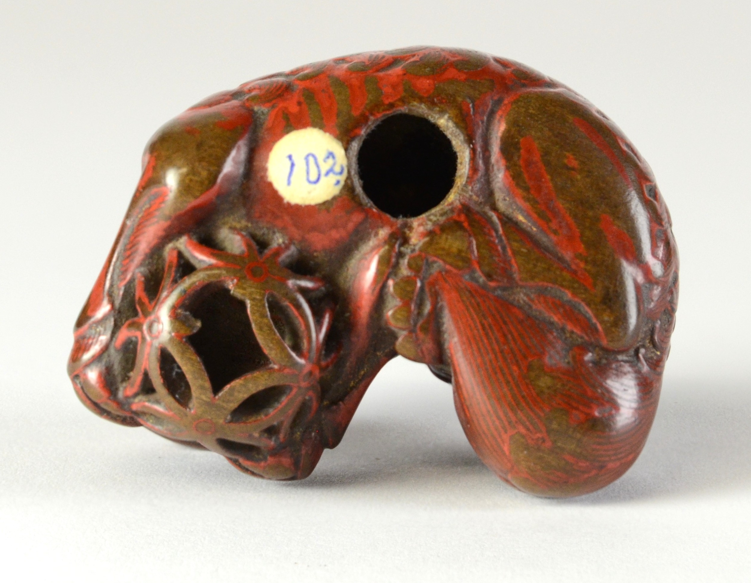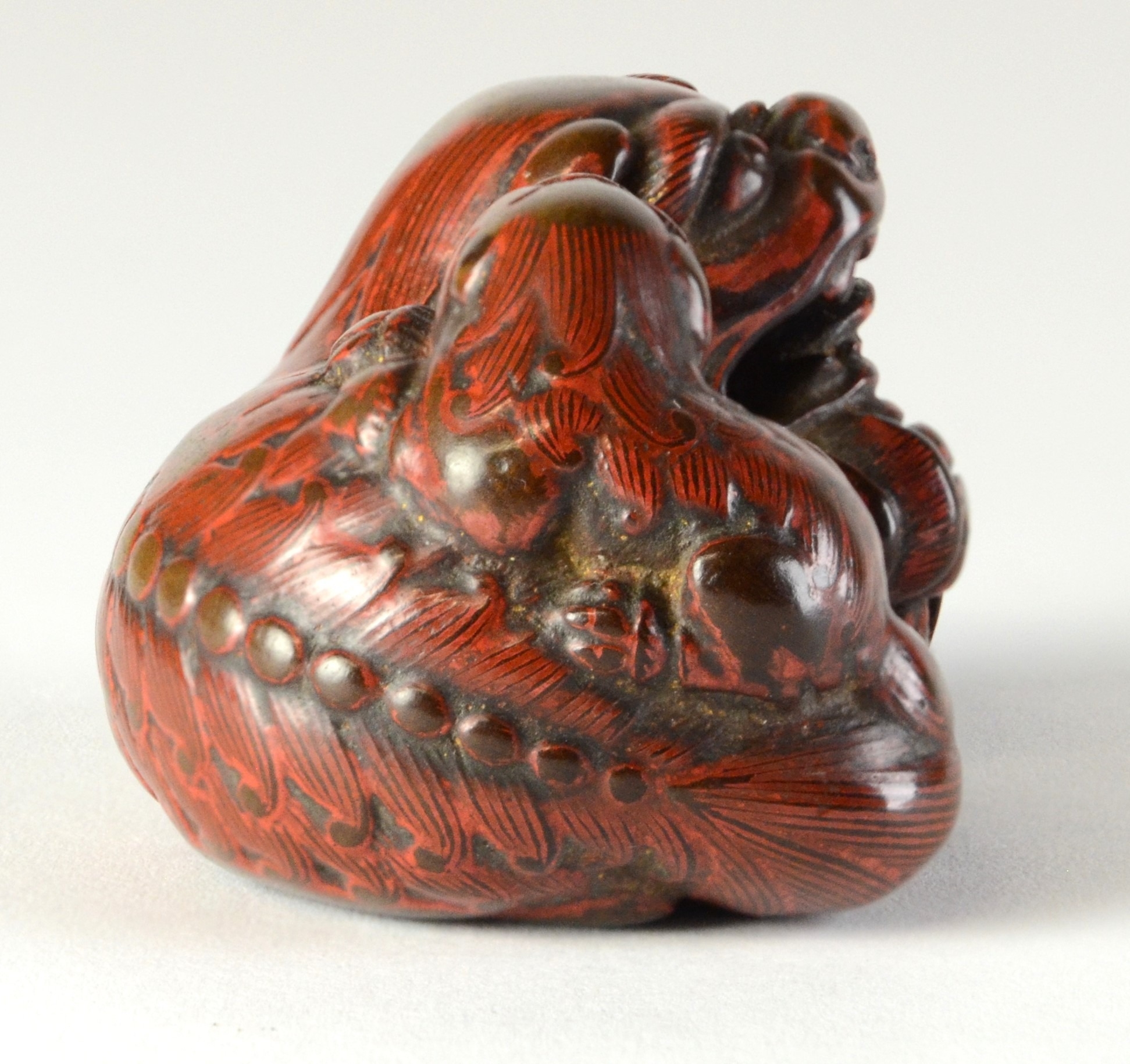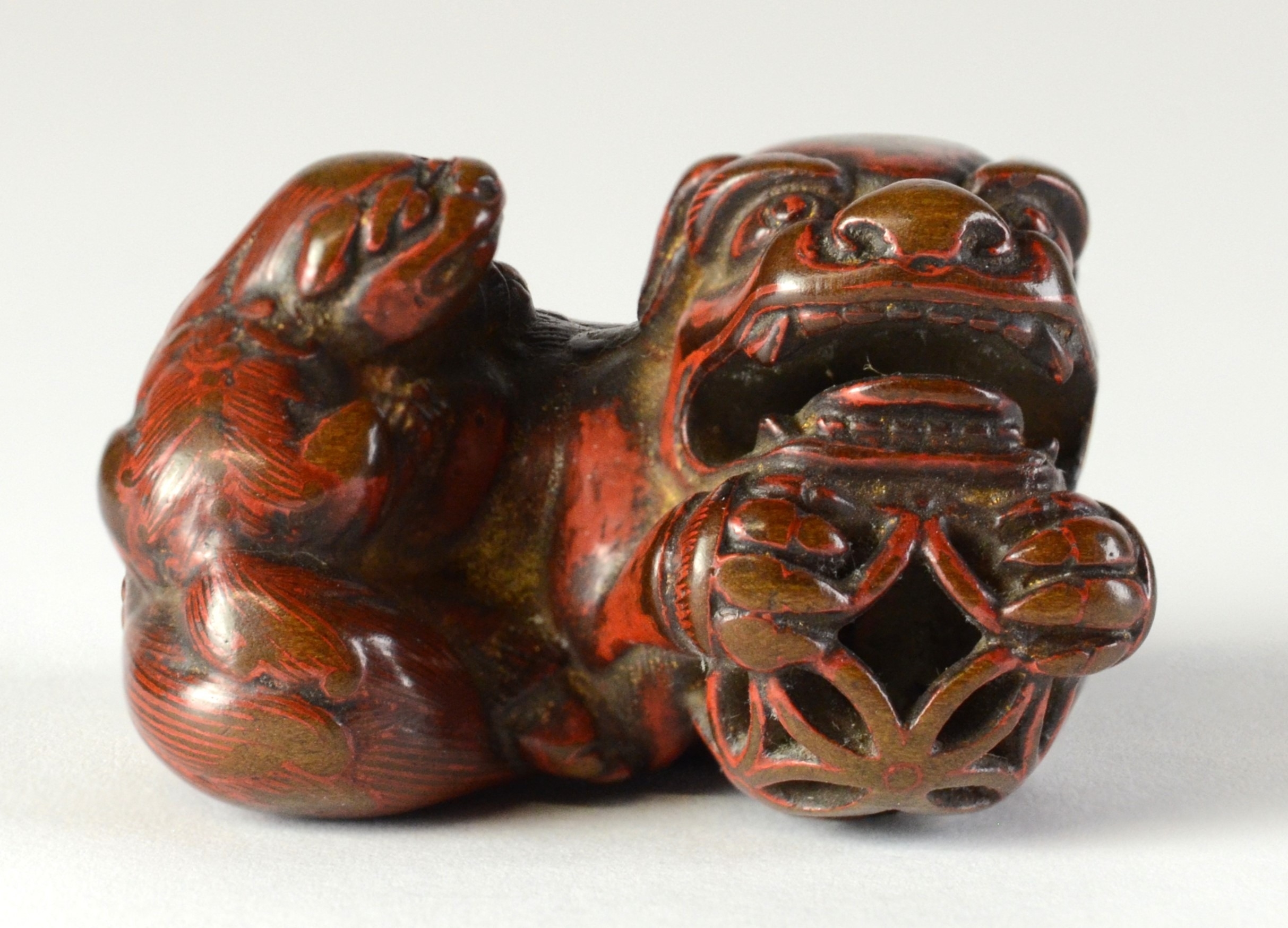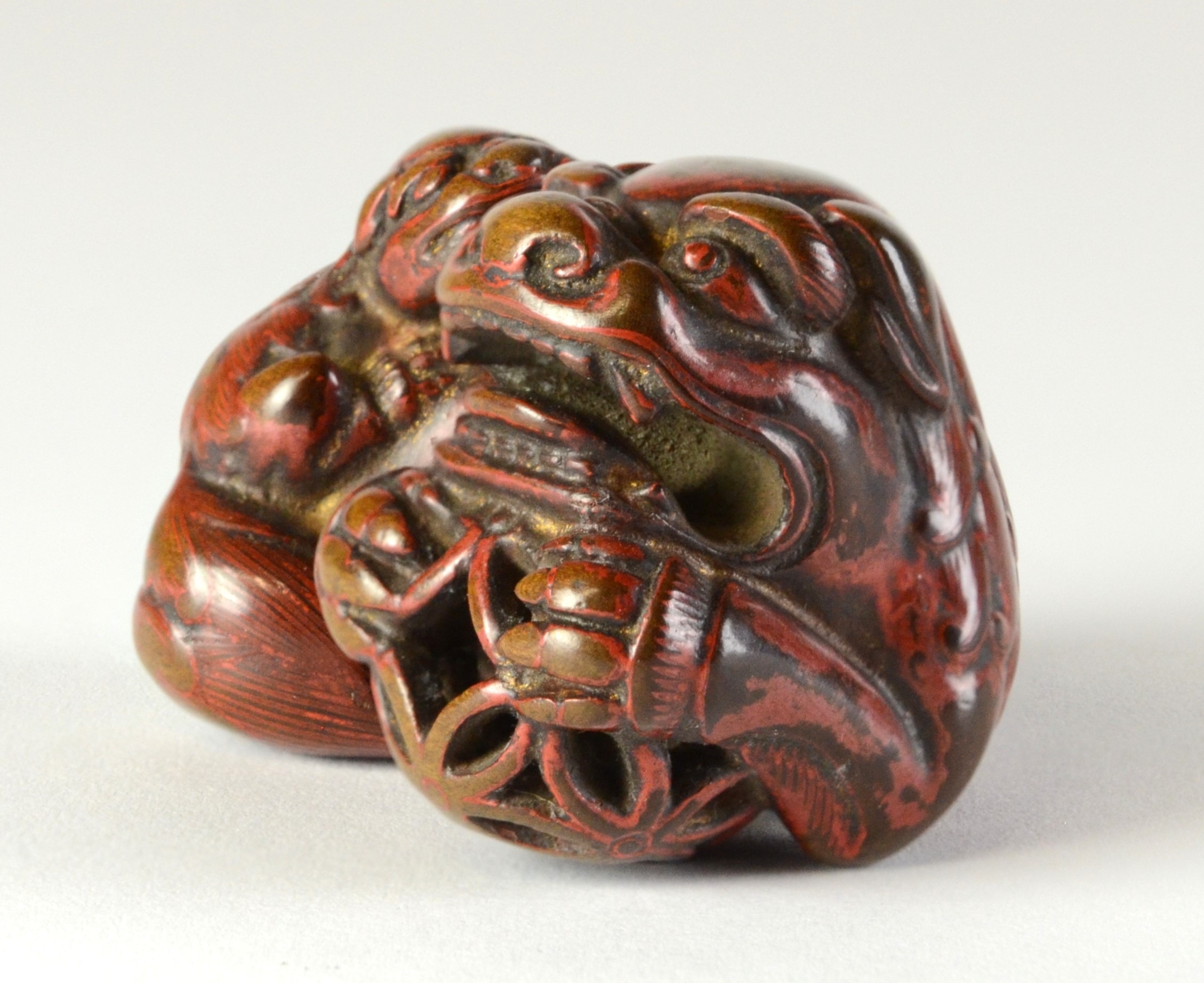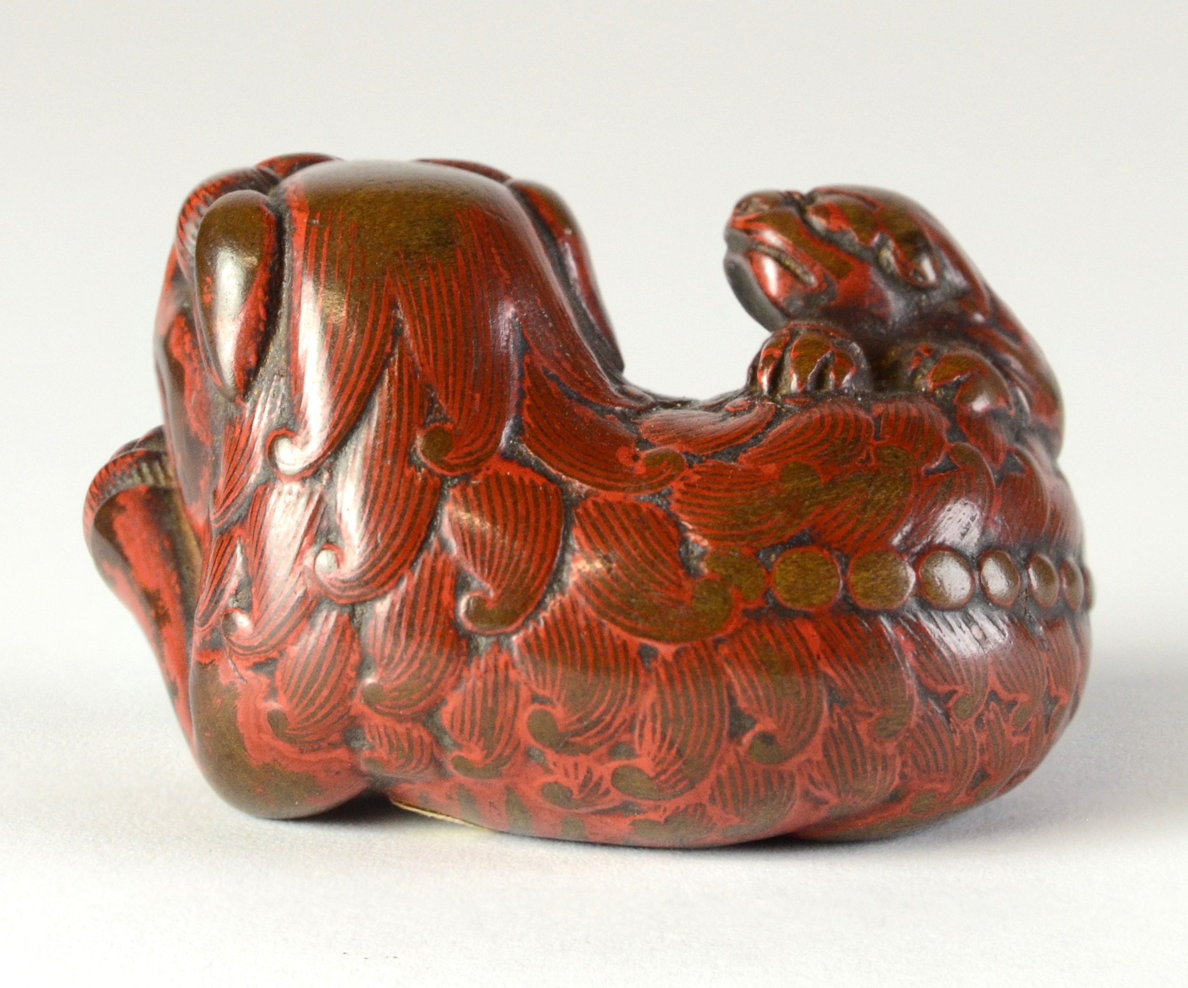 A lacquered negoro netsuke of a shishi with baby on back, holding a ball in front paws4cm wide x 3cm deep ProvenanceDorothy Ann Stevens Collection no. 102