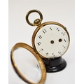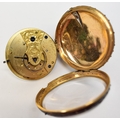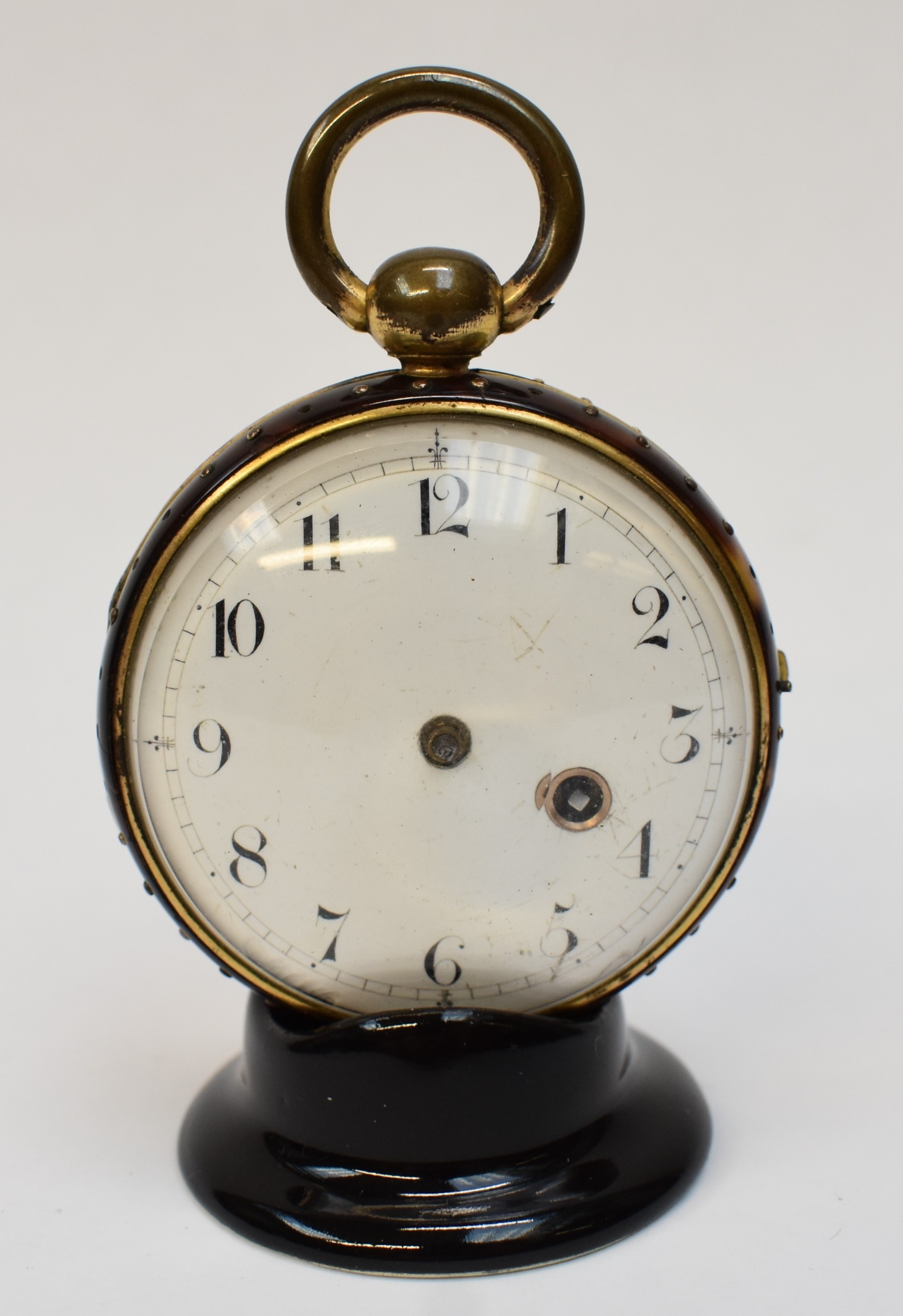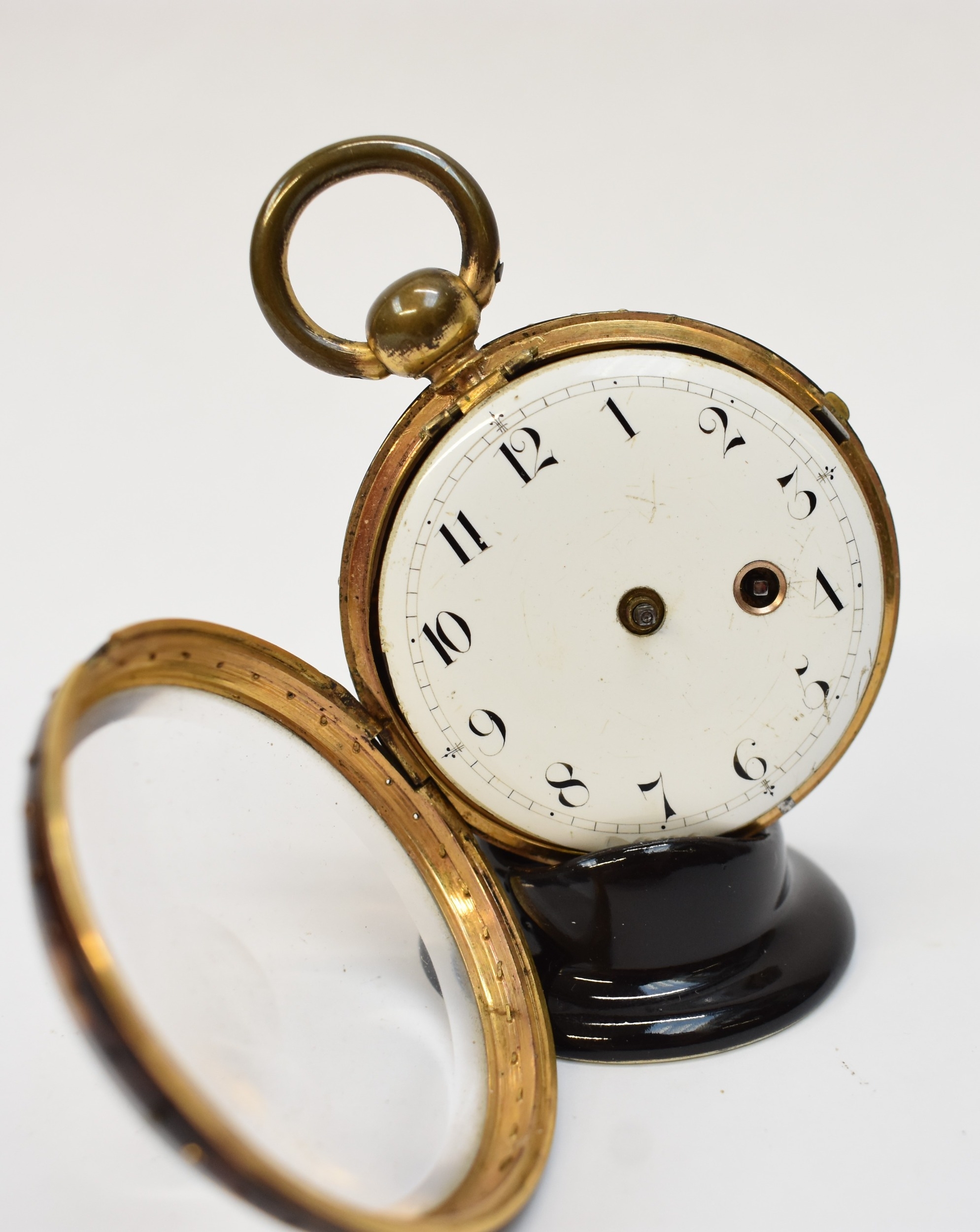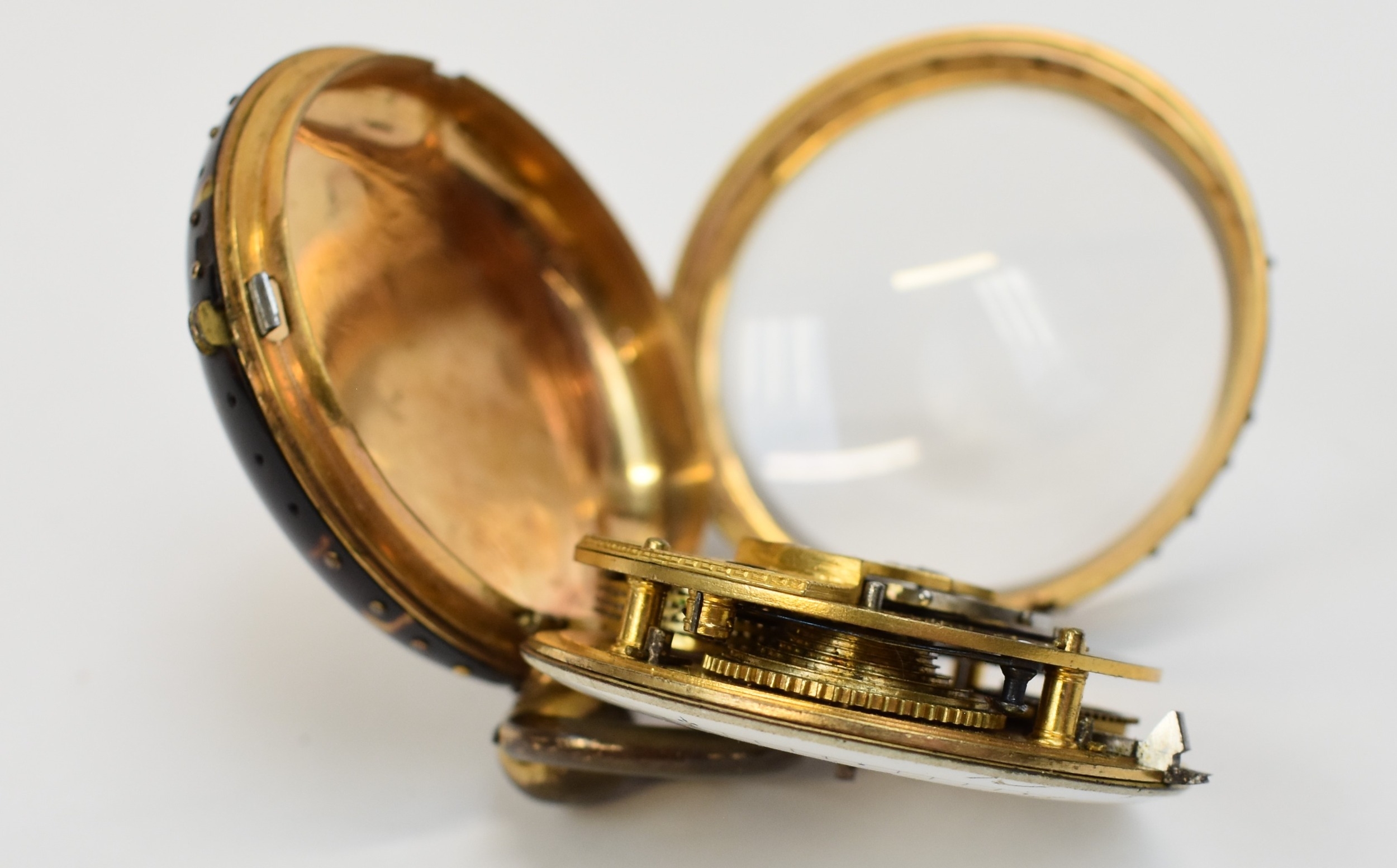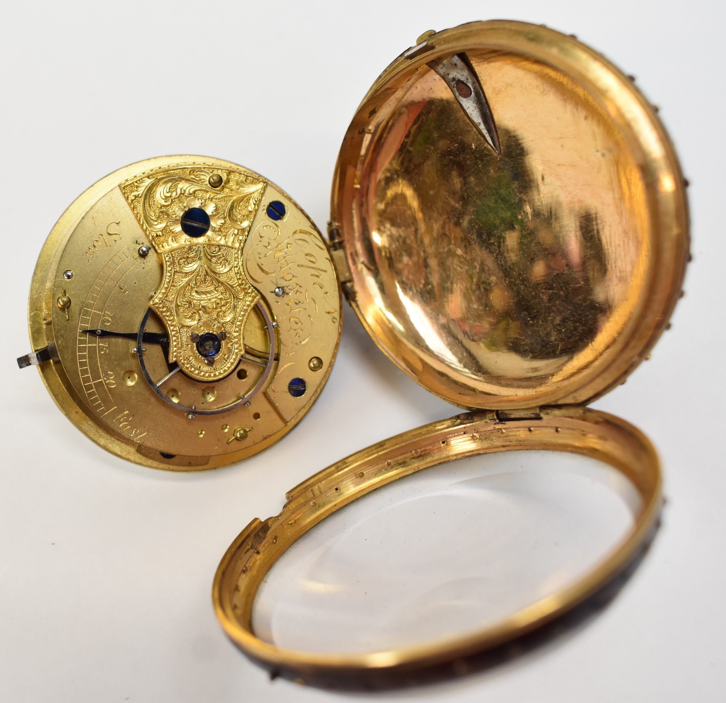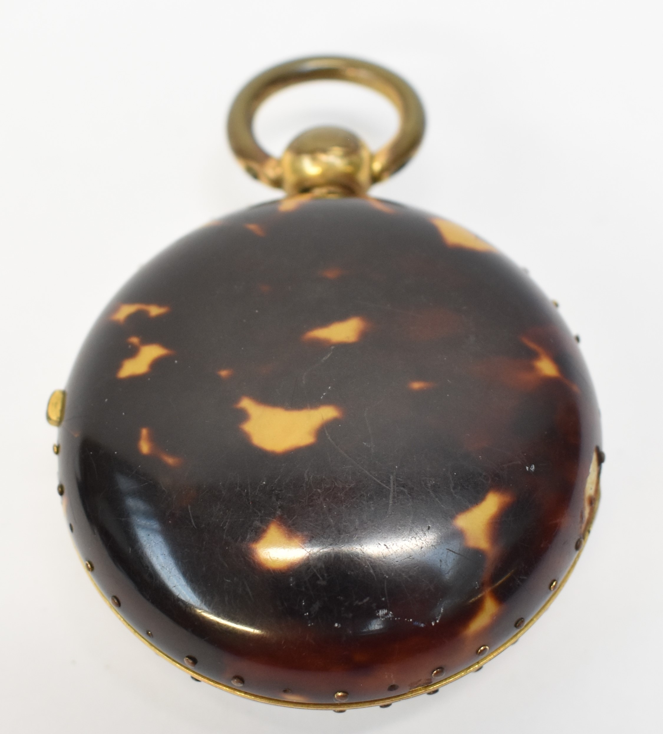 An 18th Century gilt metal and tortoiseshell cased fusee pocket watch, with white Arabic dial (cracks and chips present, arrow hands loose but present), the signed single fusee movement with ornate engraving, some rubbing to gilt on case bow