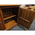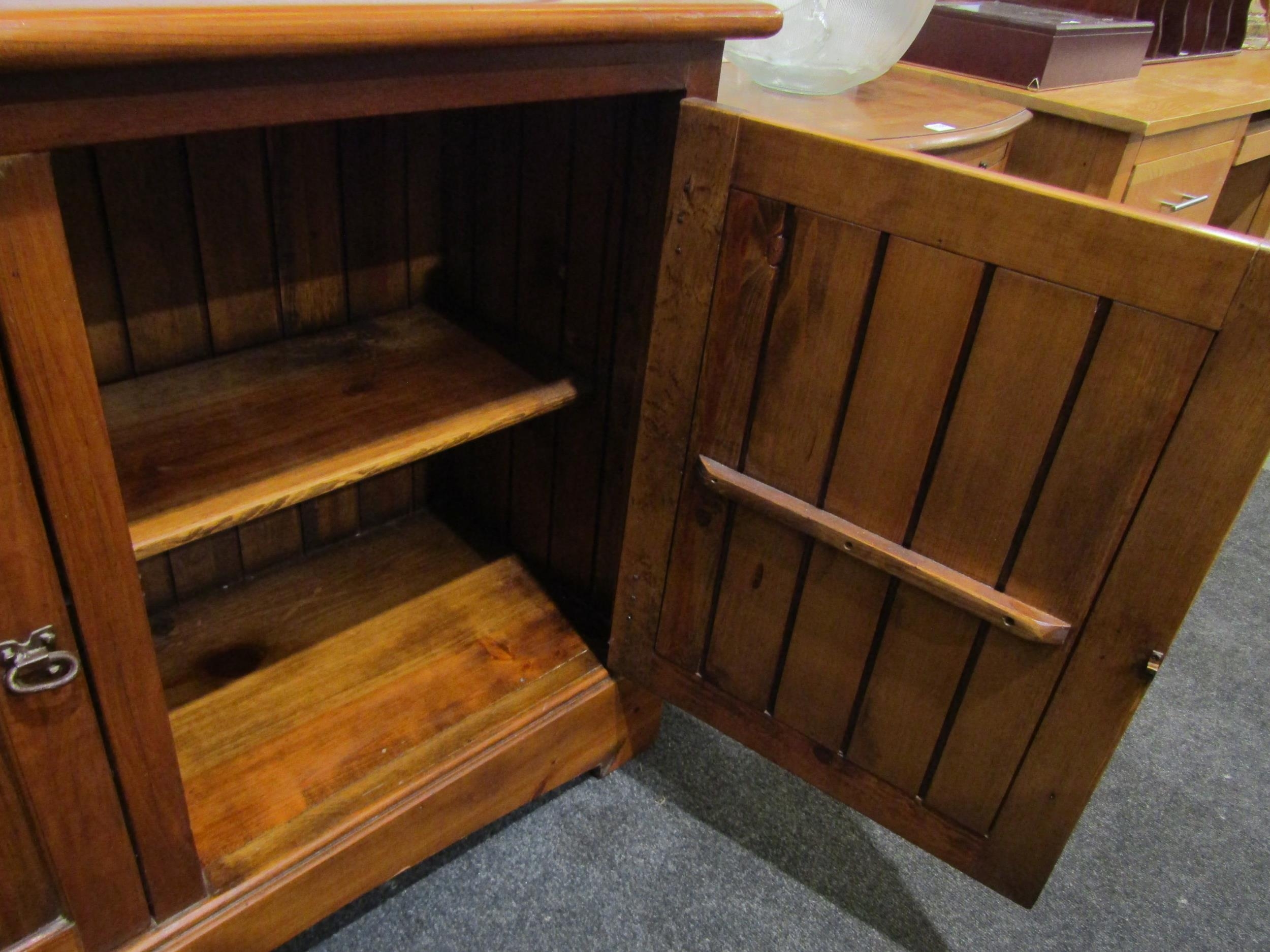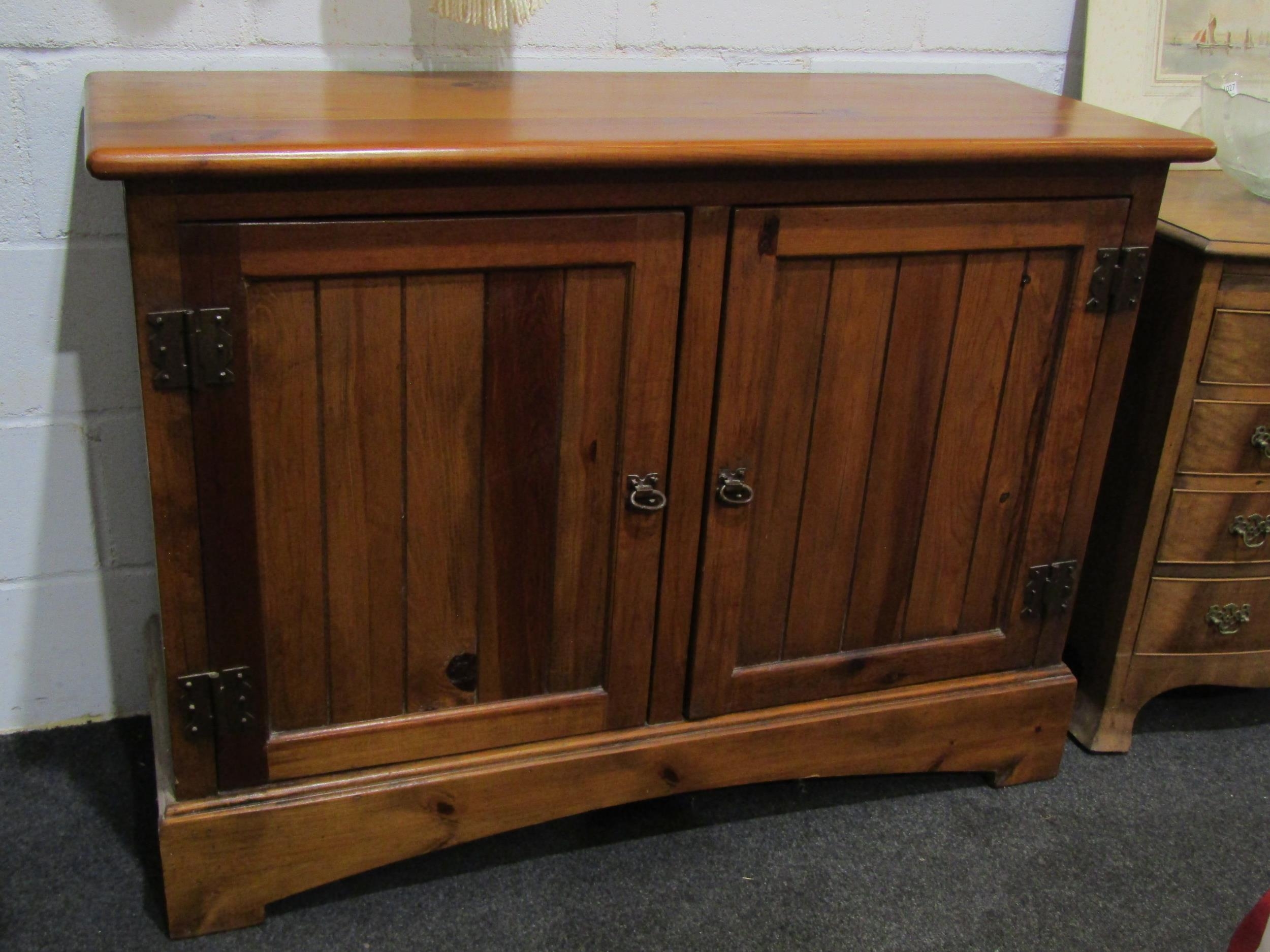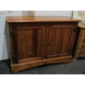 A Victorian style pine two door school cupboard on plinth base, 90cm tall x 120cm wide x 45cm deep