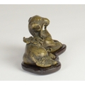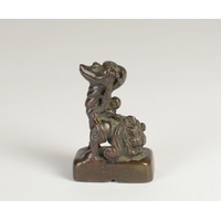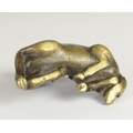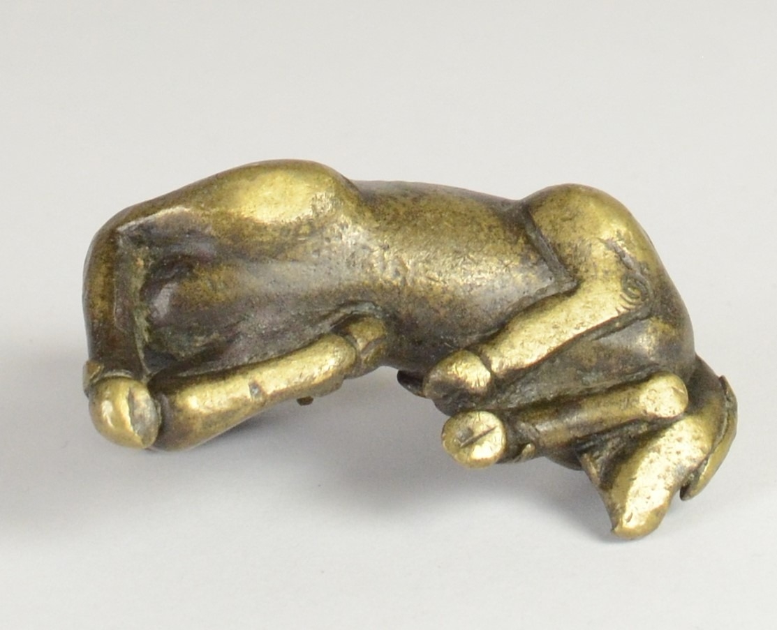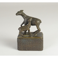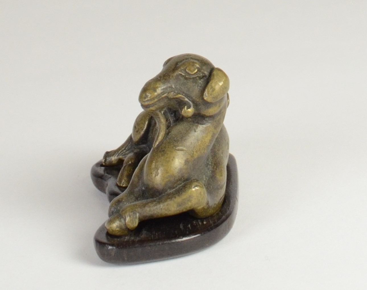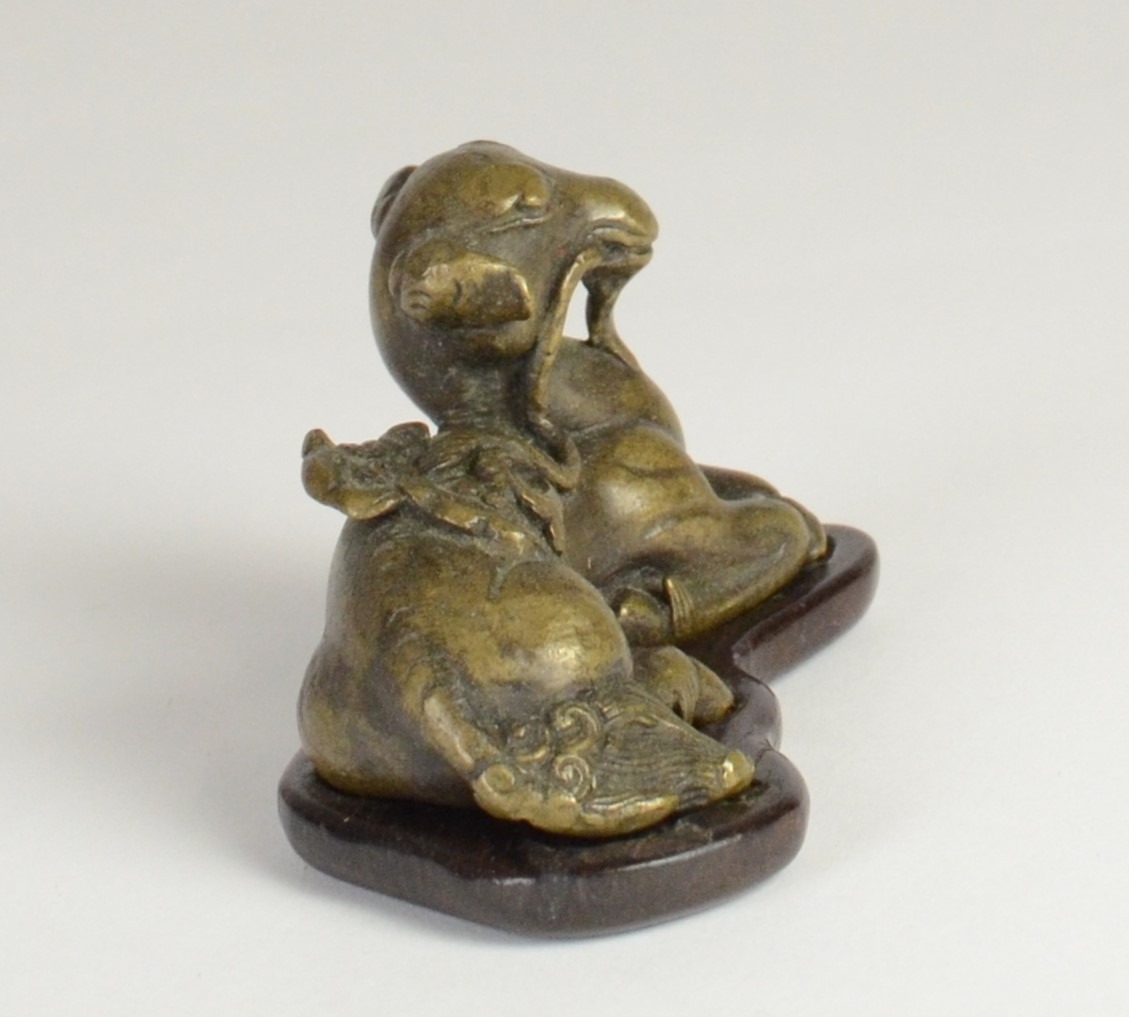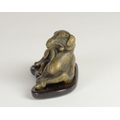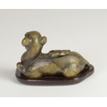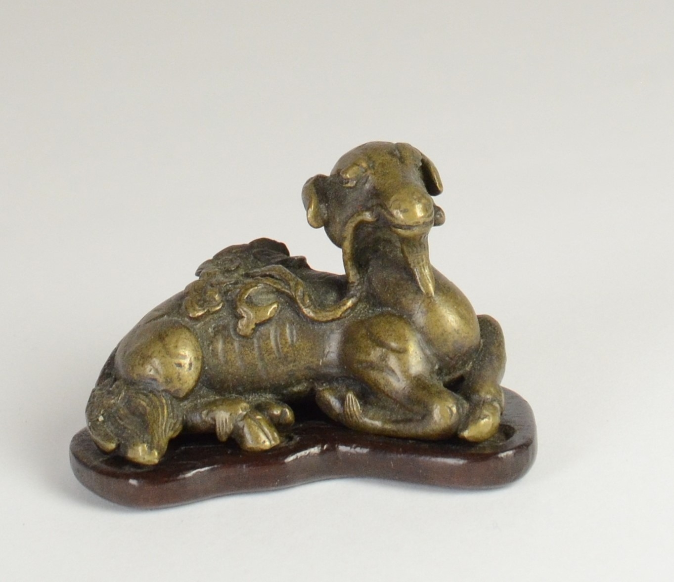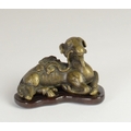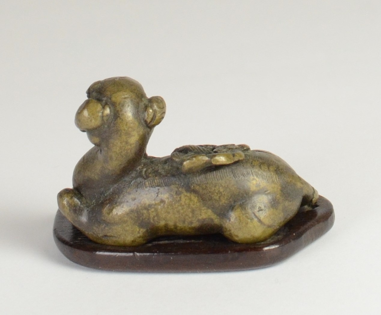 A Chinese bronze scroll weight of a recumbent goat on wooden stand5.7cm wide 3.5cm deep, 3.8cm high including standProvenanceHenry Potter Stevens Collection