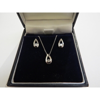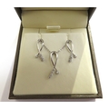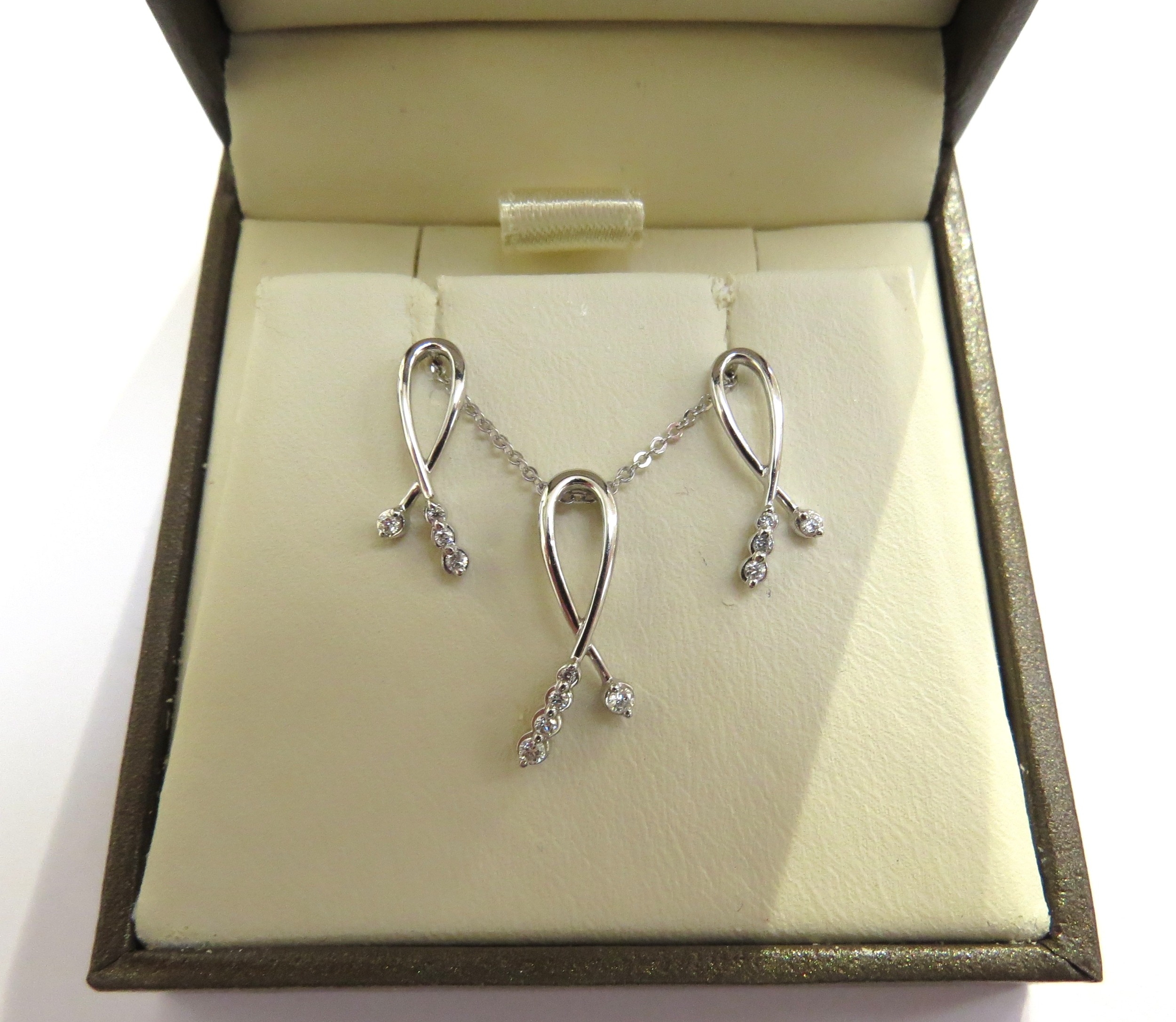 A 9ct white gold chain, 44cm long hung with a diamond ribbon pendant with a pair of matching stud earrings, 3.2g, in original Goldsmiths retail box