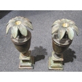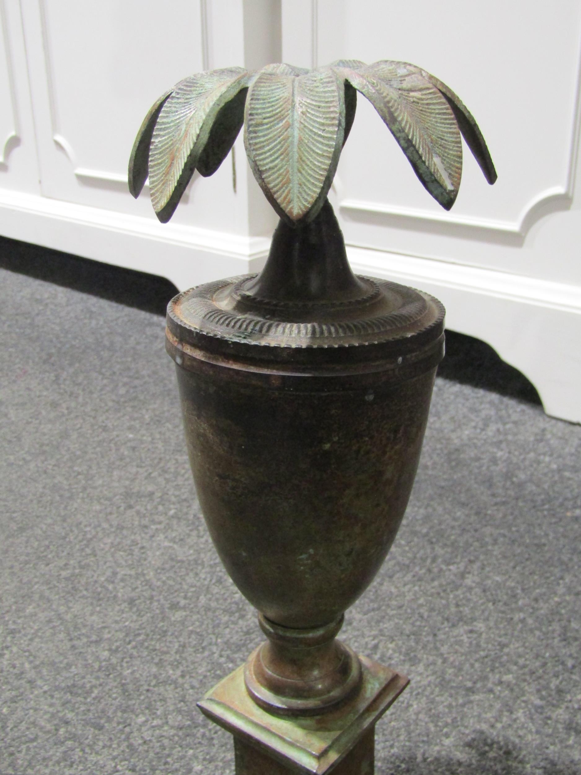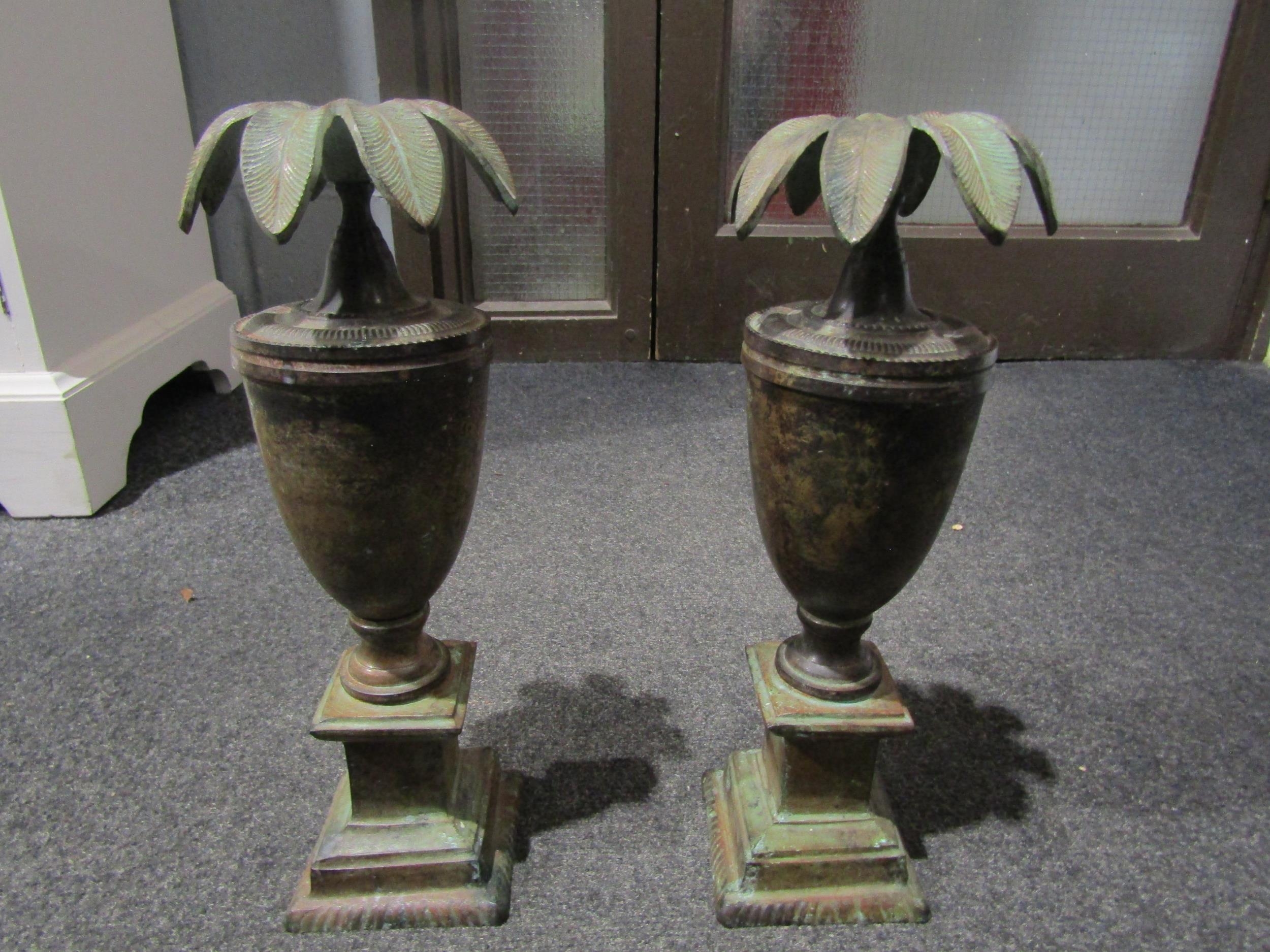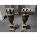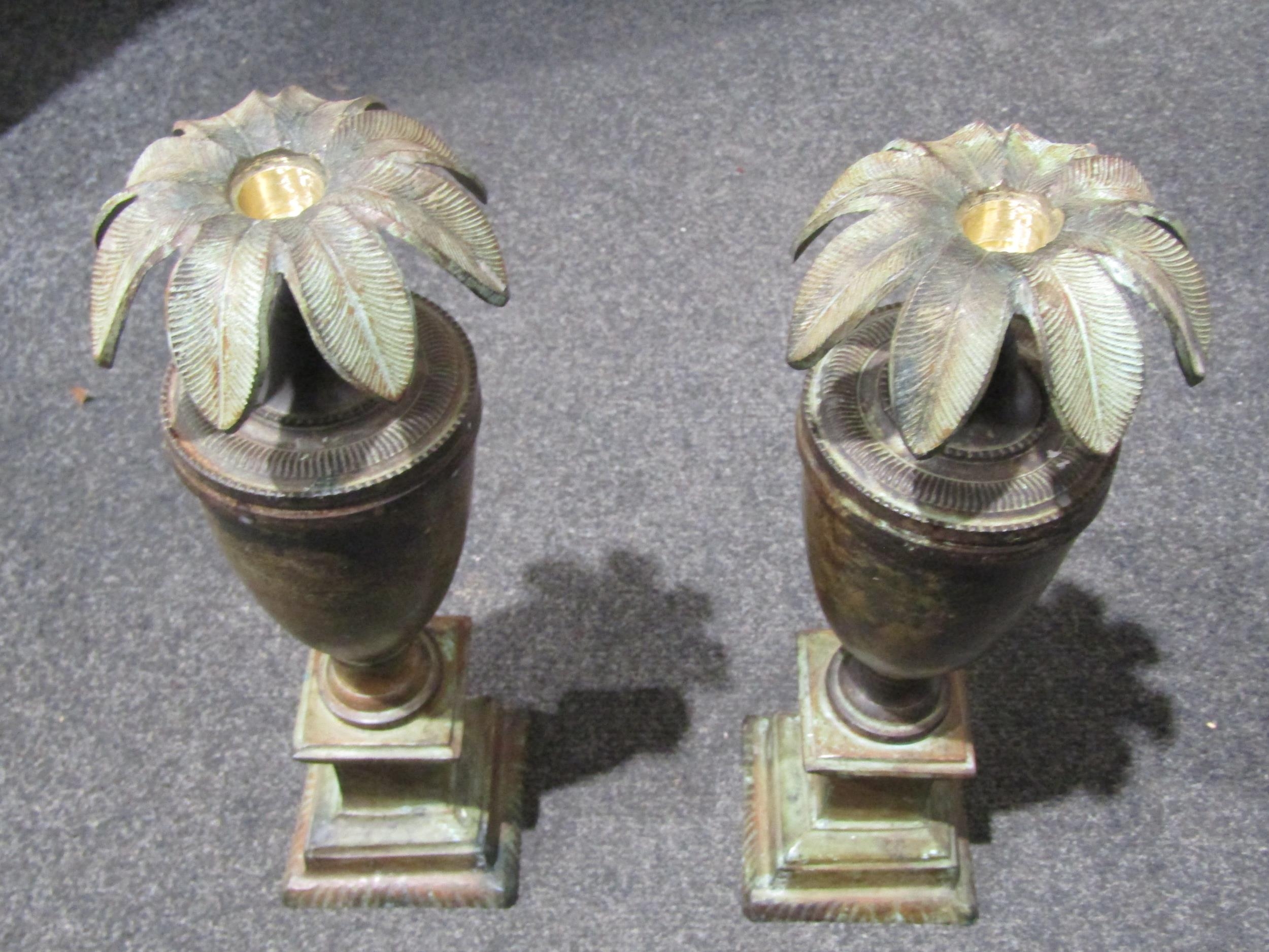 A pair of copper effect urn form candlesticks, 34cm tall