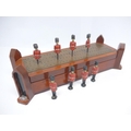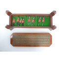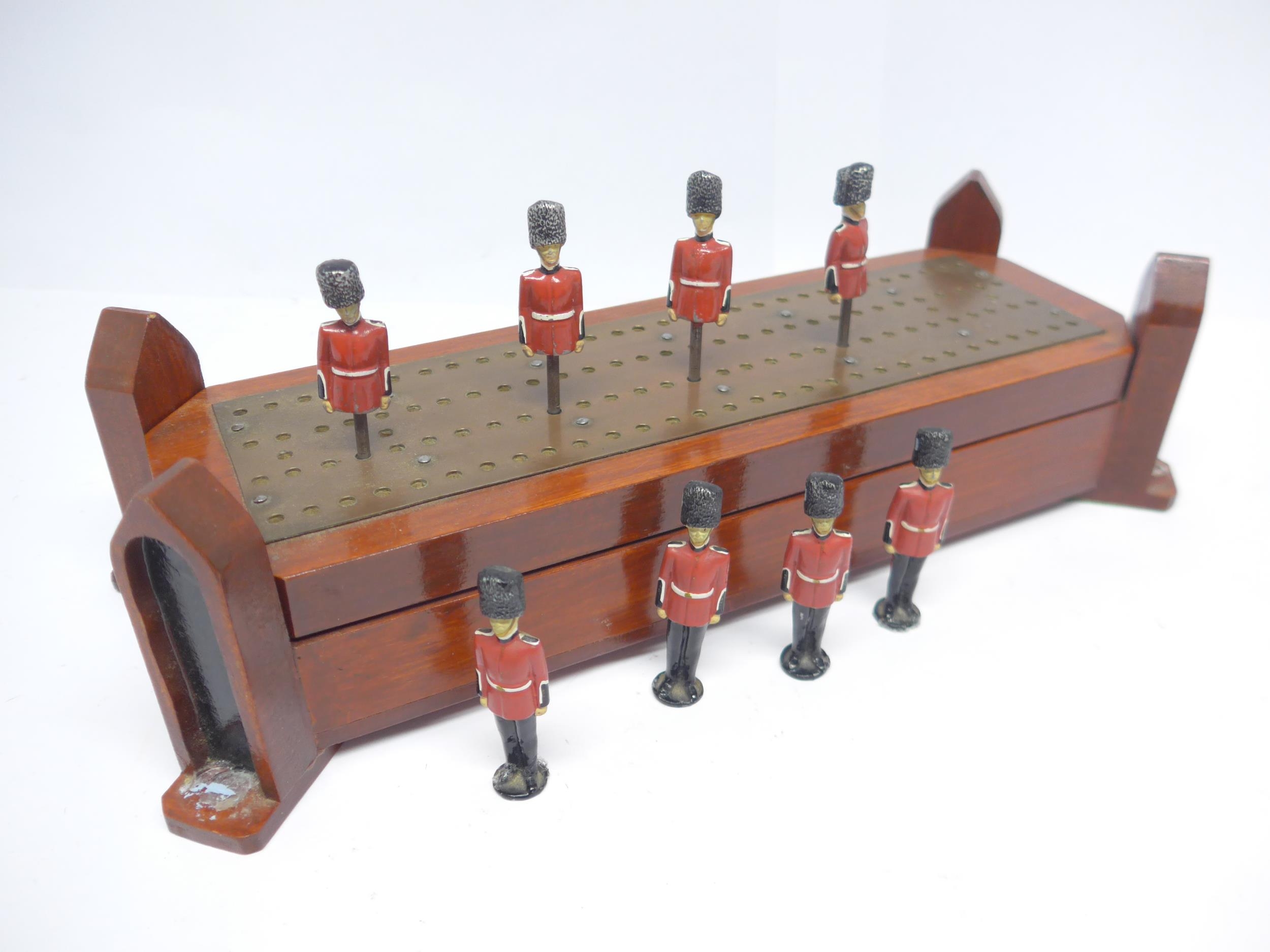A wood and brass cribbage board with four figural playing pieces as Royal Guards and four lead figures