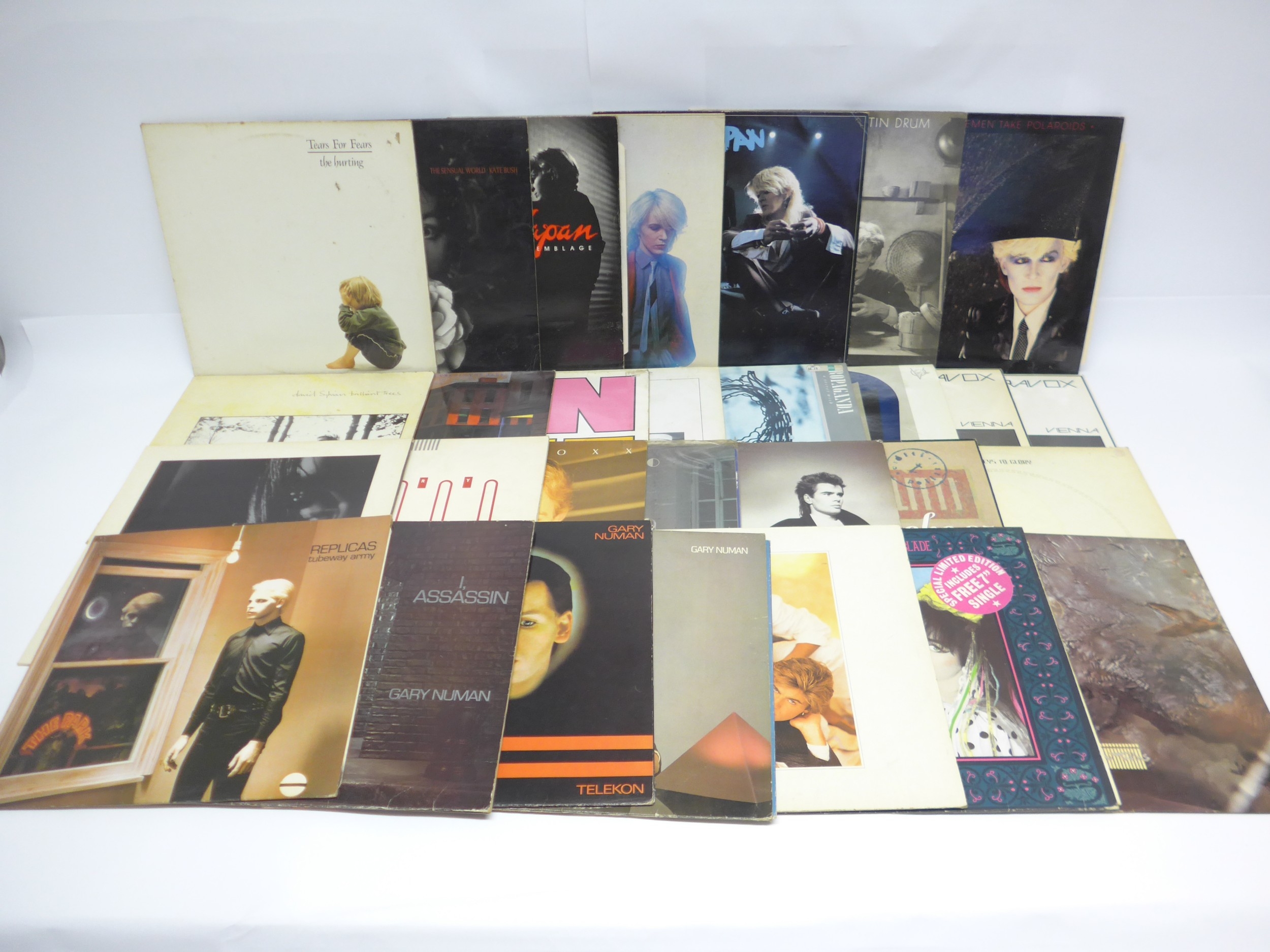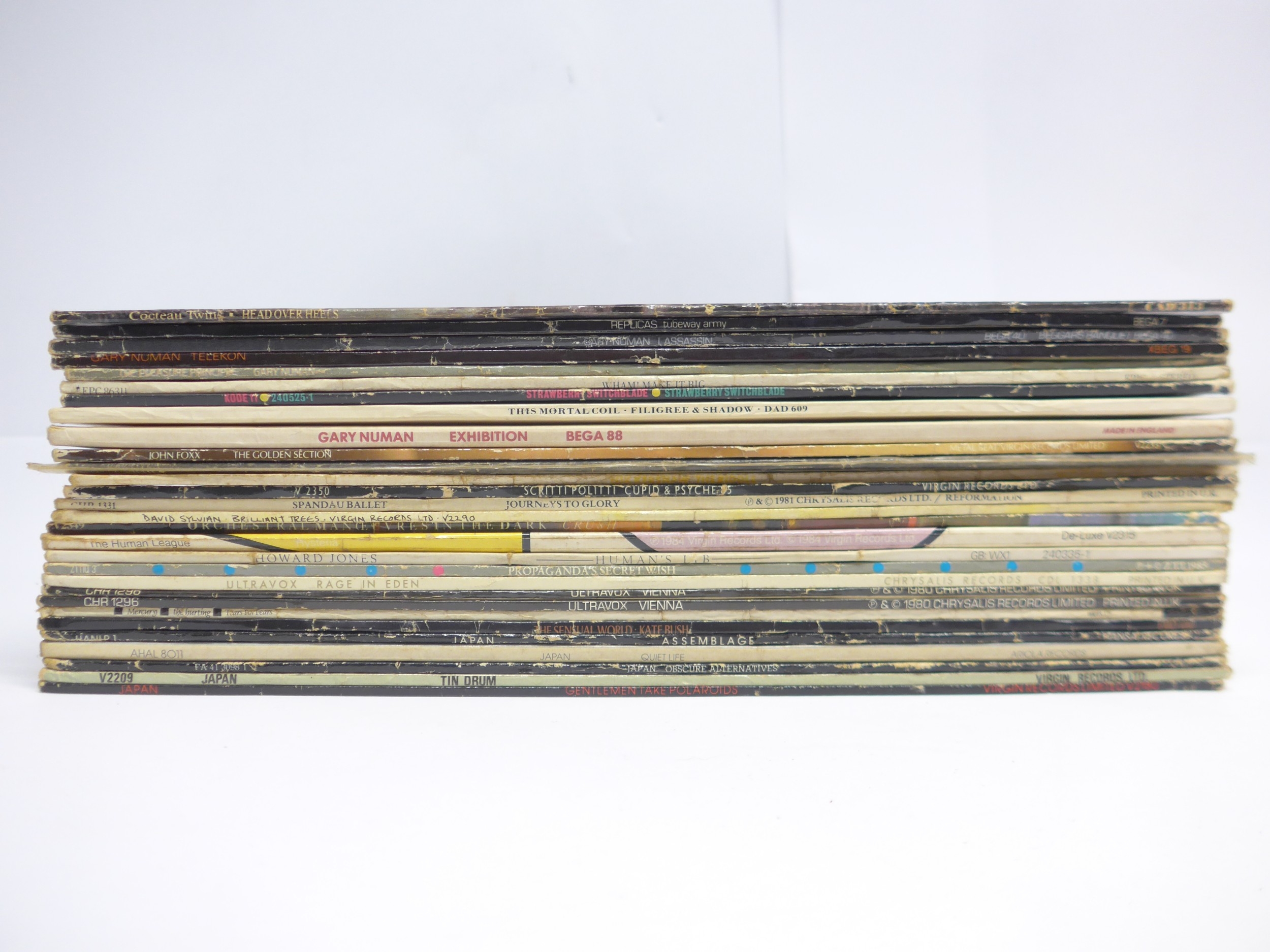 Synth-Pop / New Wave / Etheral - A collection of twenty-nine LPs to include COCTEAU TWINS: 'Head Over Heels' (CAD 313), THIS MORTAL COIL: 'Filigree & Shadow' (DAD 609), JAPAN: 'Quiet Life' (AHAL 8011), 'Obscure Alternatives' (FA 4130981), 'Tin Drum' (V2209), 'Gentlemen Take Polaroids' (V2180) and 'Assemblage' (HANLP 1), DAVID SYLVIAN: 'Brilliant Trees' (V2290), TUBEWAY ARMY: 'Replicas' (BEGA 7), GARY NUMAN: 'Telekon' (XBEG 19), 'I, Assassin' (BEGA 40), 'The Pleasure Principal' (BEGA 10), and 'Exhibition' (BEGA 88), SCRITTI POLITTI: 'Cupid & Psych 85' (V 2350), STRAWBERRY SWITCHBLADE: 'Strawberry Switchblade' (KODE 11), YAZOO: 'Upstairs At Eric's' (STUMM 7), ULTRAVOX: 'Vienna' (CHR 1296, x2 copies) and 'Rage In Eden' (CDL 1338), HOWARD JONES: 'Human's Lib' (WX1), ORCHESTRAL MANOUEVRES IN THE DARK: 'Crush' (V2349), SPANDAU BALLET: 'Journeys To Glory' (CHR 1331), HUMAN LEAGUE: 'Hysteria' (V 2315), PROPAGANDA: 'A Secret Wish' (ZTTIQ 3), TEARS FOR FEARS: 'The Hurting) (mers 17). JOHN FOXX: 'The Golden Section' (V2233), NIK KERSHAW: 'The Riddle' (MCF 3245), KATE BUSH: 'The Sensual World' (EMD 100) and WHAM!: 'Make It Big' (EPC 86311) (19, vinyl and sleeves generally VG-VG+ with a few dropping slightly under, would benefit from cleaning)