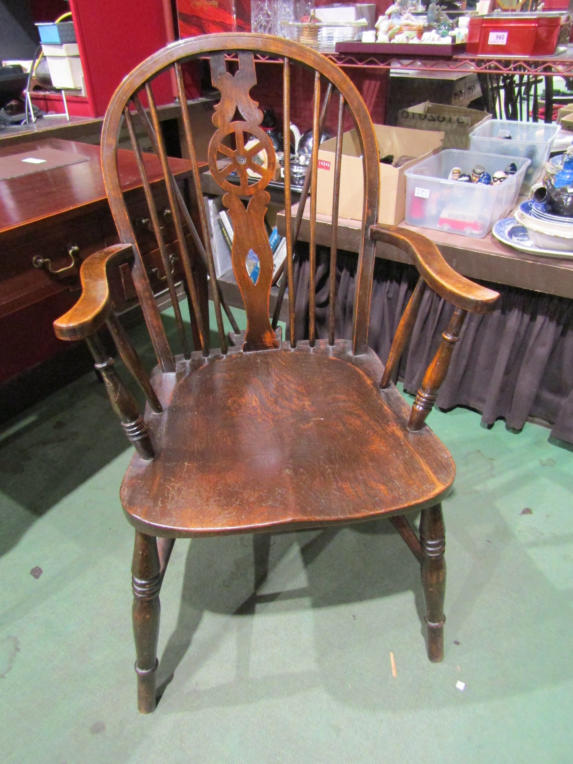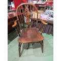 An elm Windsor chair with wheel back on turned legs and 'H' ...
