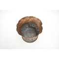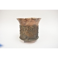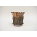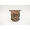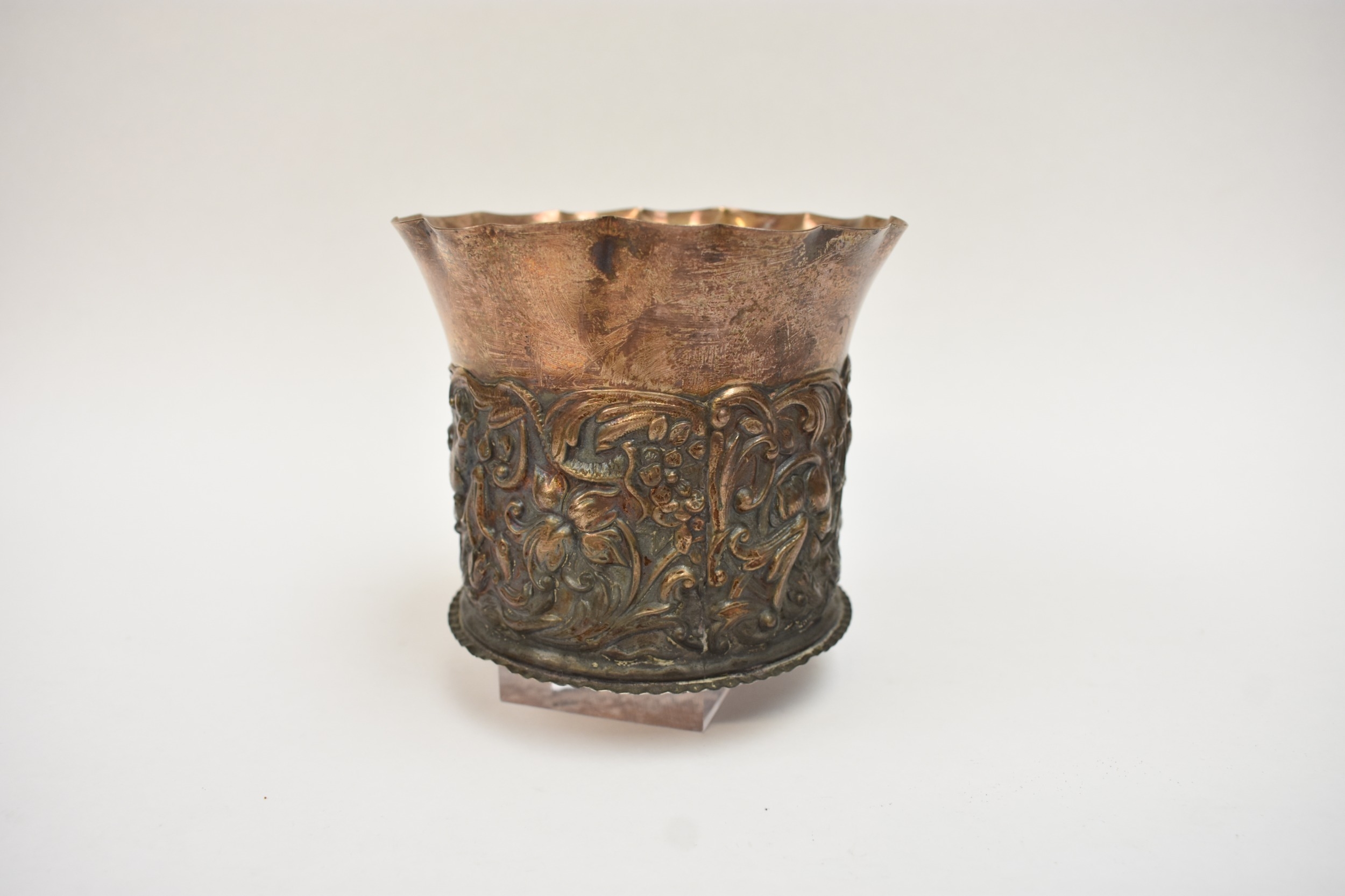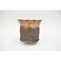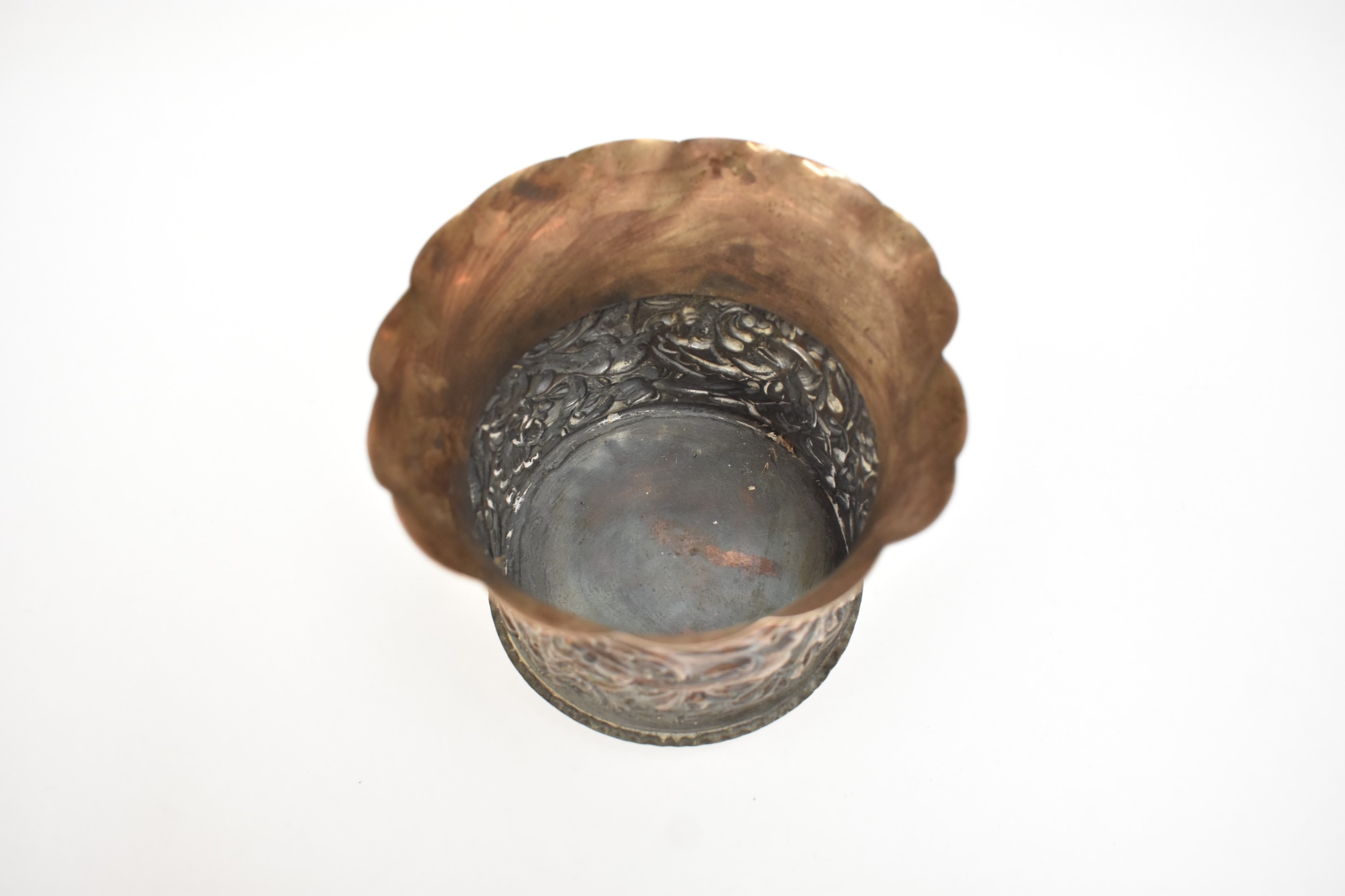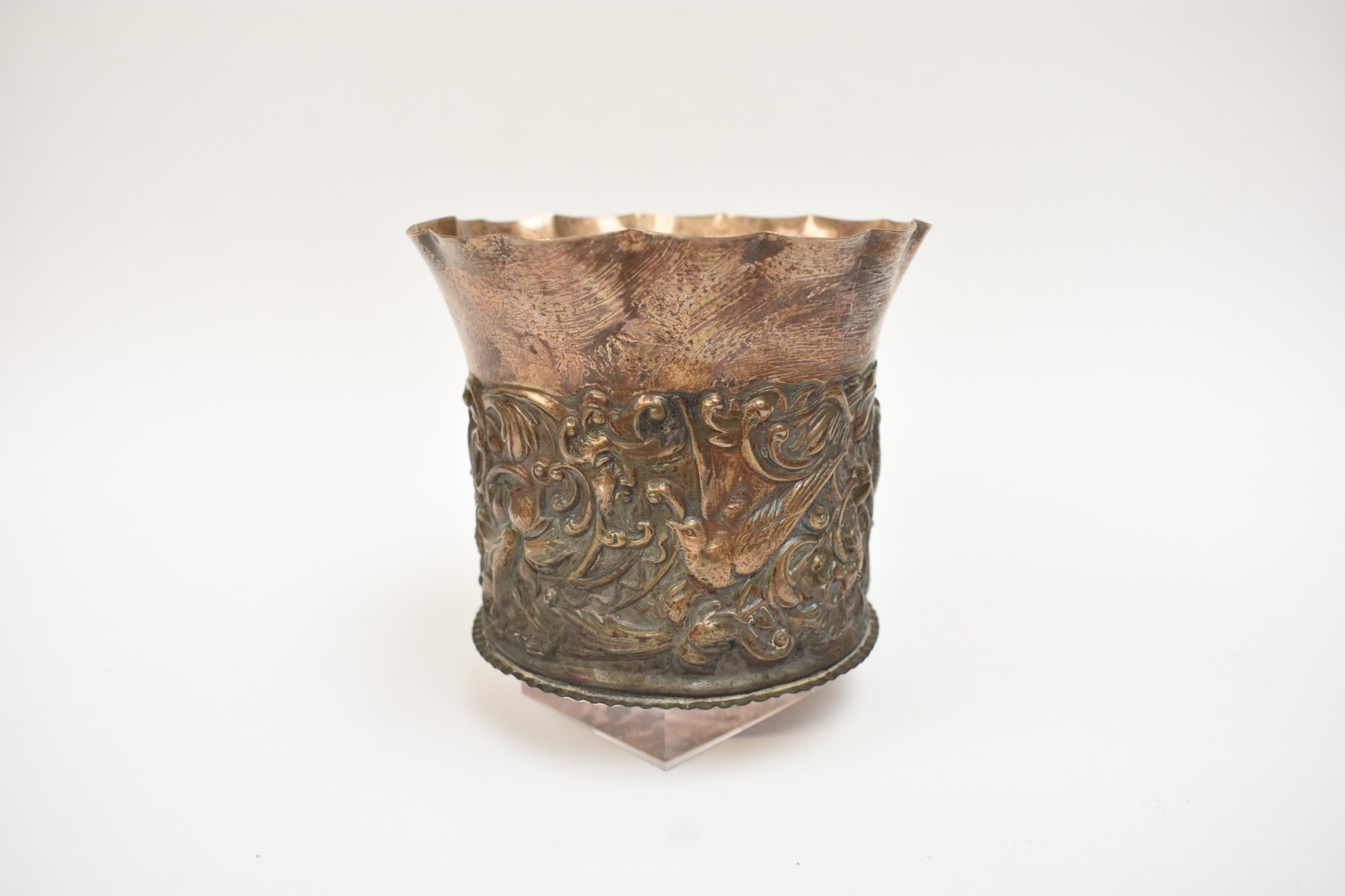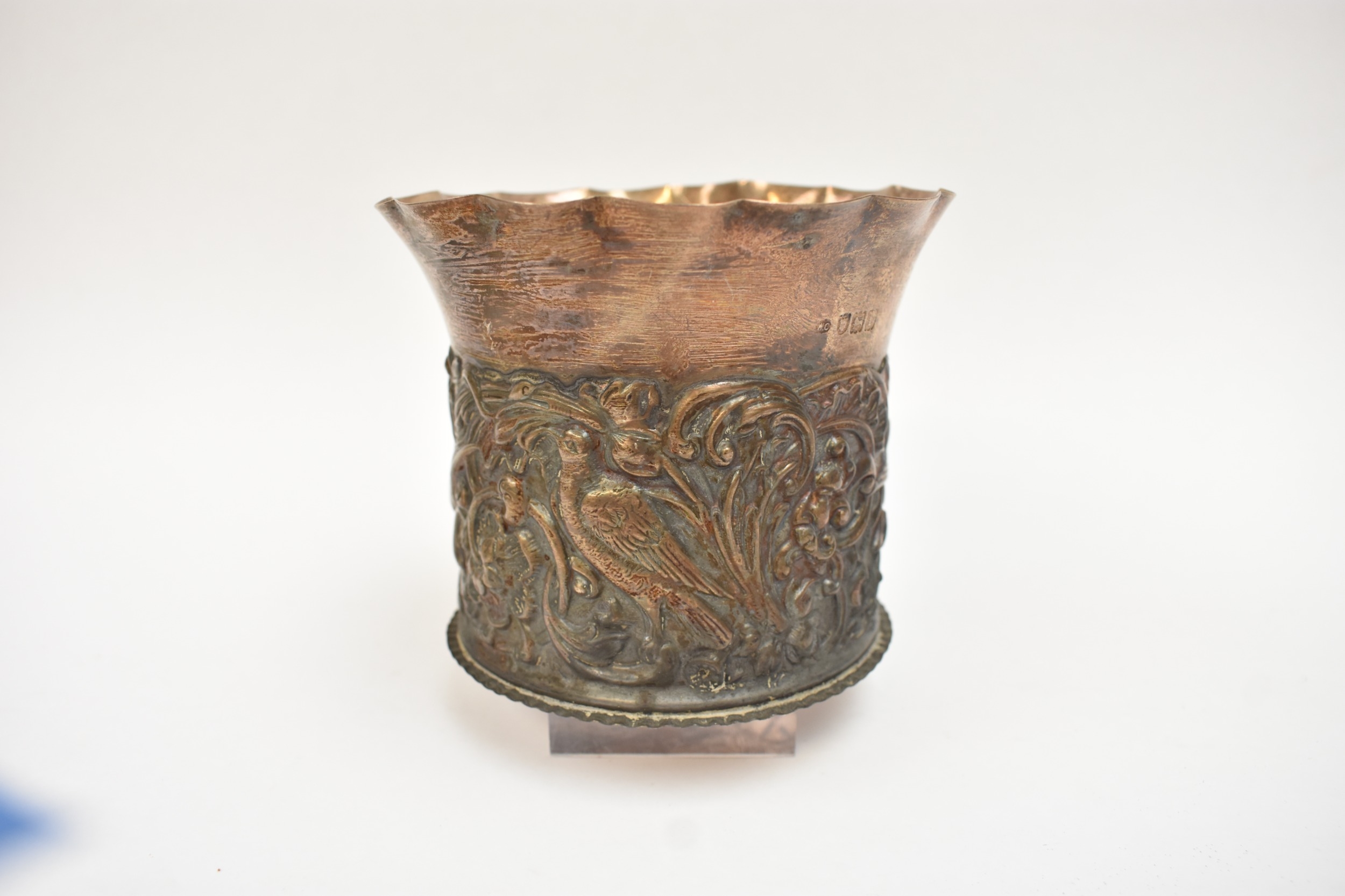 A William Comyns & Sons silver pot with frilled edge, slightly dented, the body embossed with birds and foliage, London 1901, 9.4cm tall, 11cm diameter top. 151g